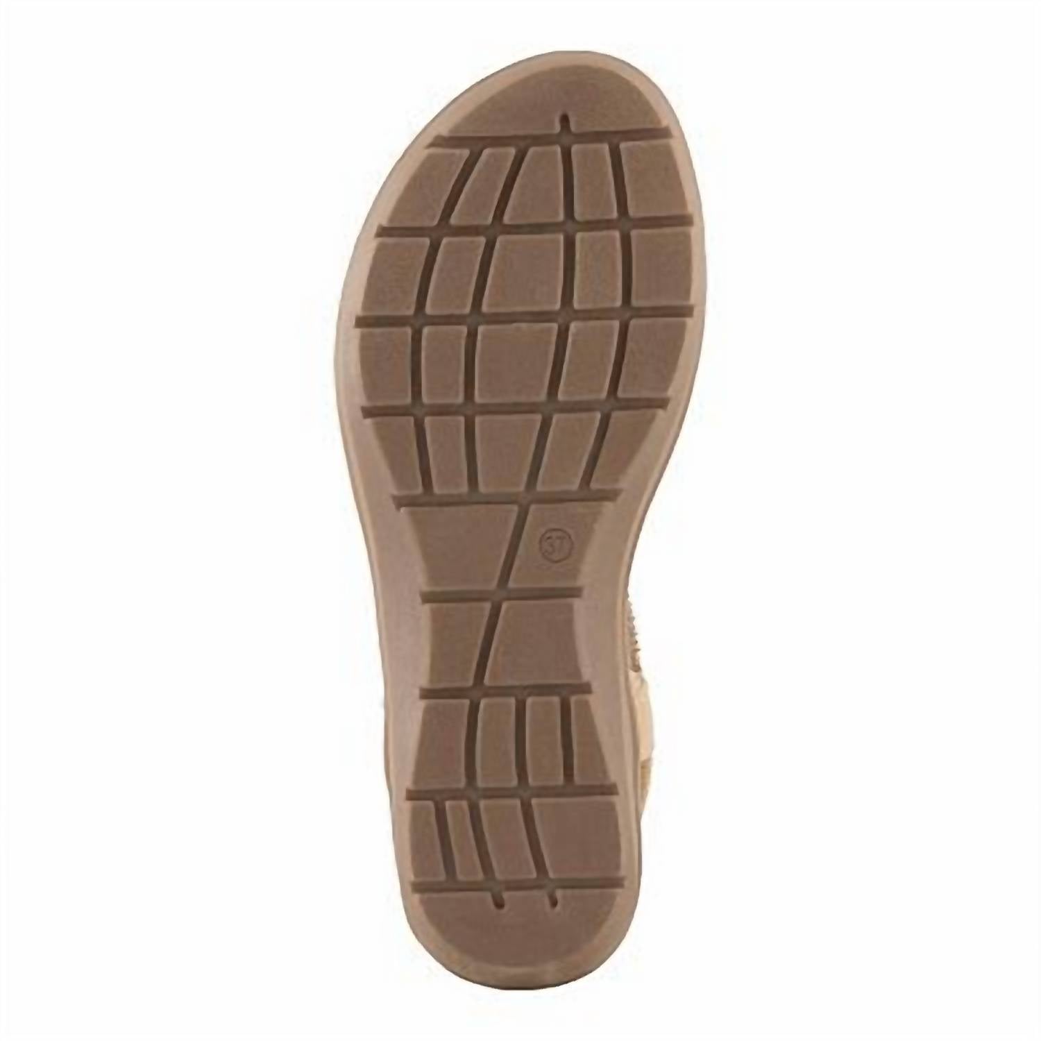 Enhance your vacation wardrobe with the Women's Biddle Sandal by Patrizia in a dazzling gold hue. Designed for effortless style, these sandals feature a microsuede upper with tubular strappy accents adorned in micro rhinestones for a subtle shimmer. The cushioned insole ensures all-day comfort, while the stacked cylindrical ornaments add a touch of elegance and versatility. The sandal has a low 1.25-inch flat heel, slip-on closure, and an open toe design, complemented by a TPR outsole. Spot clean for easy care. Perfect for embodying quiet luxury, these sandals are imported.