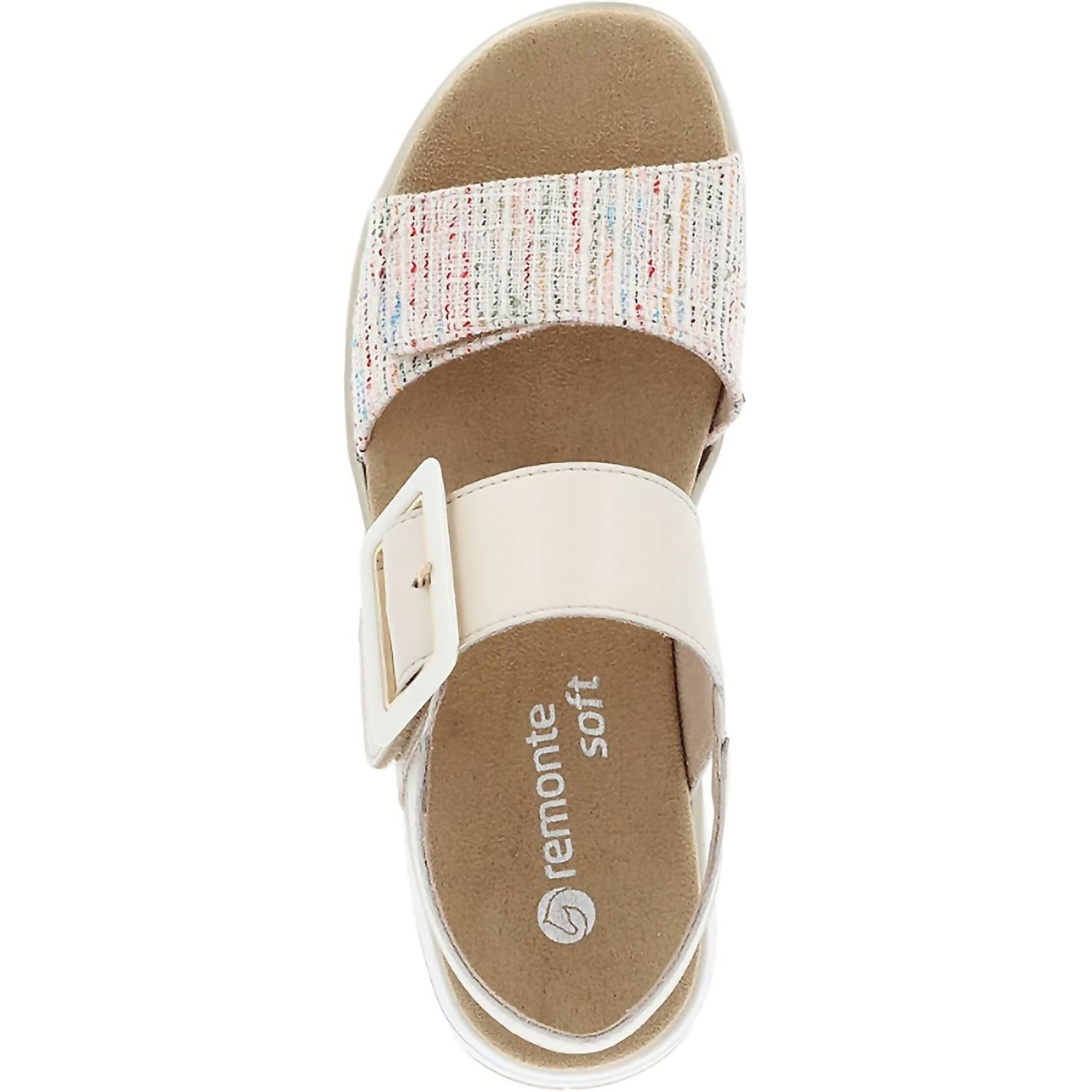 Elevate your summer wardrobe with the Women's Jocelyn 53 Backstrap Sandal by Remonte, a chic and versatile piece perfect for travel and special occasions. These sandals feature a sophisticated low 1.38'' flat heel and a comfortable round toe design. Made from high-quality Weiss Multi/Porzellan leather, they include a textile footbed and removable insoles for customized comfort. The zigzag adjustable straps ensure a secure fit, making them ideal for all-day wear.