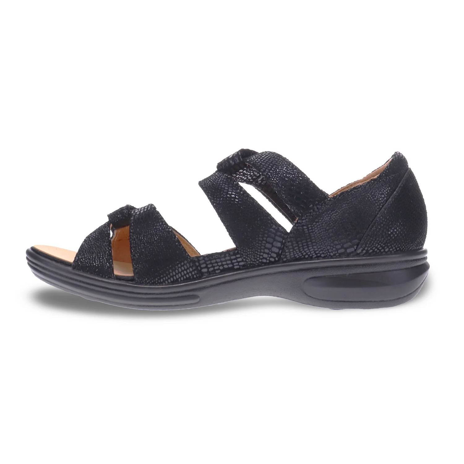 Flowy dresses, cropped pants, and even jumpsuits... this sandal works with them all! Discover the perfect blend of style and comfort with the Women's Geneva Sandal by Revere, crafted in elegant black lizard leather. This sandal features a customizable fit with both forefoot and rear foot adjustability, ensuring maximum comfort. It includes a removable comfort footbed with built-in arch support, allowing for the addition of custom orthotics if needed. Care is simple: just wipe with a damp cloth and air dry under indirect sunlight. Ideal for summer wear, these sandals offer a slip-resistant outsole and a chic open toe design.
