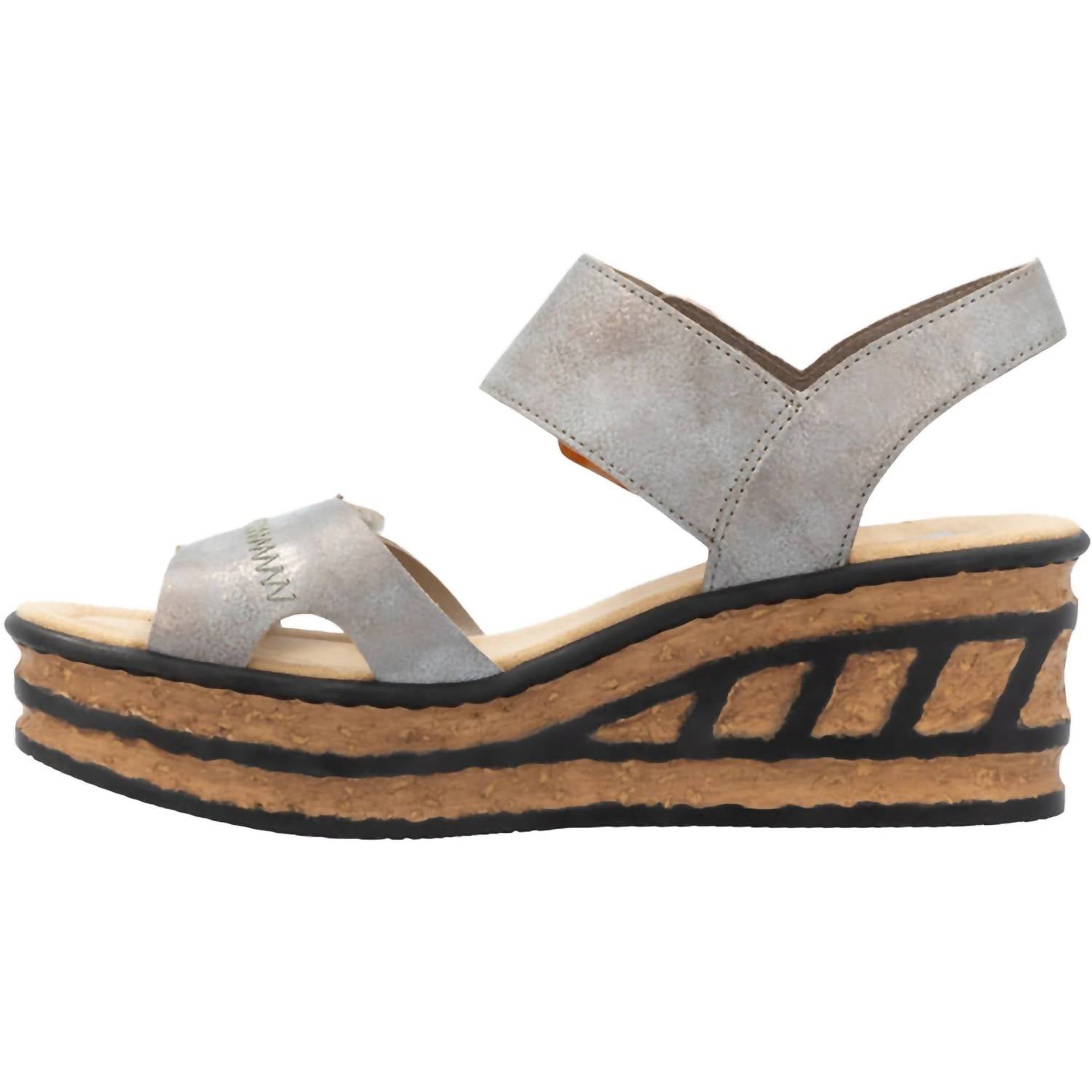 Flowy dresses, cropped pants, and even jumpsuits... this sandal works with them all! Step into style with the Rieker Women's Wedge Sandals in a chic grey and cayenne synthetic blend, perfect for the summer season. These sandals feature a faux leather upper, textile inner for comfort and a flexible PU sole that adapts to your every move. The double Velcro fasteners provide an easy closure, and the mid-height 2.4-inch wedge heel delivers a touch of 90s fashion while absorbing shock for all-day wear. Ideal for travel and casual strolls, this medium-width sandal with a round toe shape is the epitome of comfort and style.