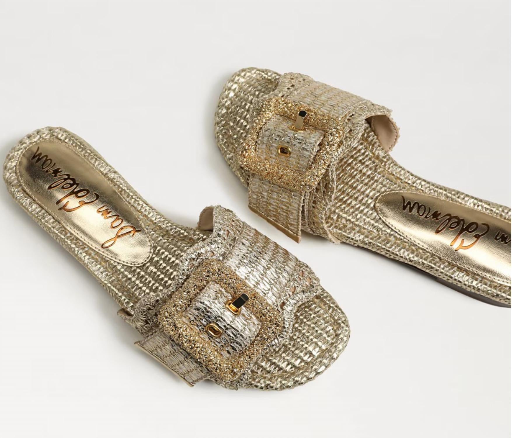 This sandal will take you from brunch to dinner and everything in between. Step into summer with the Women's Bambi Metallic Raffia Slide Sandals by Sam Edelman, a stunning pair that combines minimalist design with vacation-ready style. The gold medium width sandals feature a fashionable round toe and a flat heel, ensuring all-day comfort during those sun-soaked days. Designed for ultimate ease, these are the perfect choice for a touch of glamour in your warm-weather wardrobe.