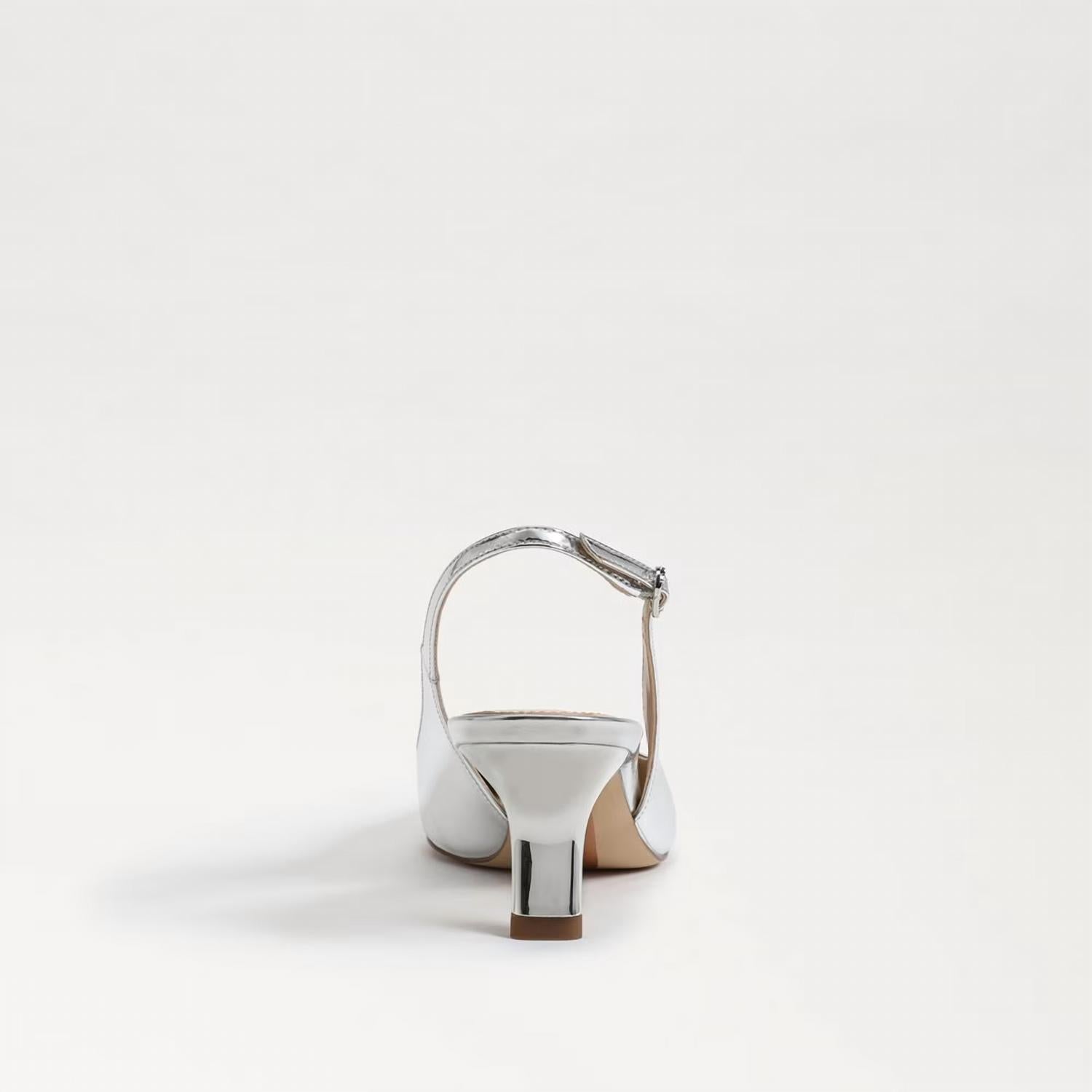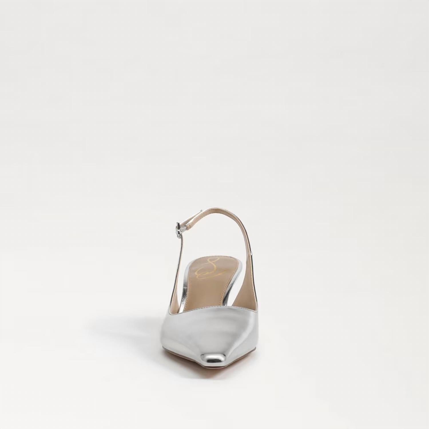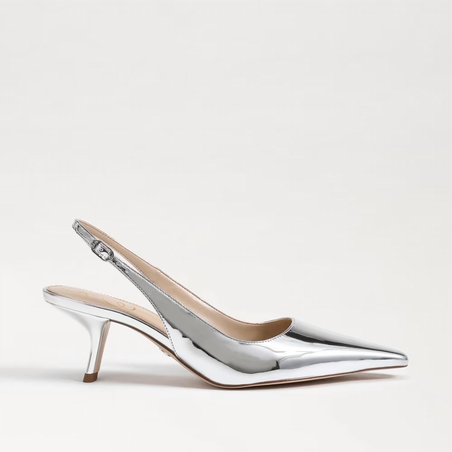 The perfect height for day to night. Elevate your style with the Women's Bianka Slingback Sandal by Sam Edelman, a chic addition for any wardrobe. These sleek silver heels feature a 2.4-inch kitten heel and a pointed toe, offering a blend of elegance and comfort. Crafted from a luxurious mix of leather, fabric, and synthetic materials, they ensure a sophisticated look. Closure: Buckle. The shoe includes a synthetic insole, with upper lining and sock lining being PETA approved and ethically sourced, making them both stylish and conscientious.