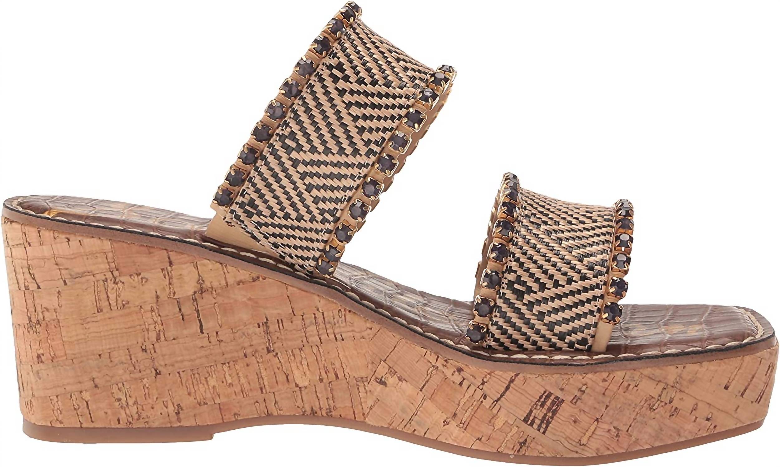 Get your daily steps in with these adorable sneakers. Introducing the Women's Double Strap Slip On Open Toe Wedge Sandals by Sam Edelman, combining retro and modern styles for a chic summer look. Crafted from faux leather material and designed in a natural/black color scheme, these sandals feature an open toe and a comfortable 3-inch wedge heel. The slip-on closure offers convenience and ease, making them perfect for vacation or Thanksgiving occasions. With a synthetic sole and medium width, these Boho Chic sandals are a stylish addition to your summer wardrobe.