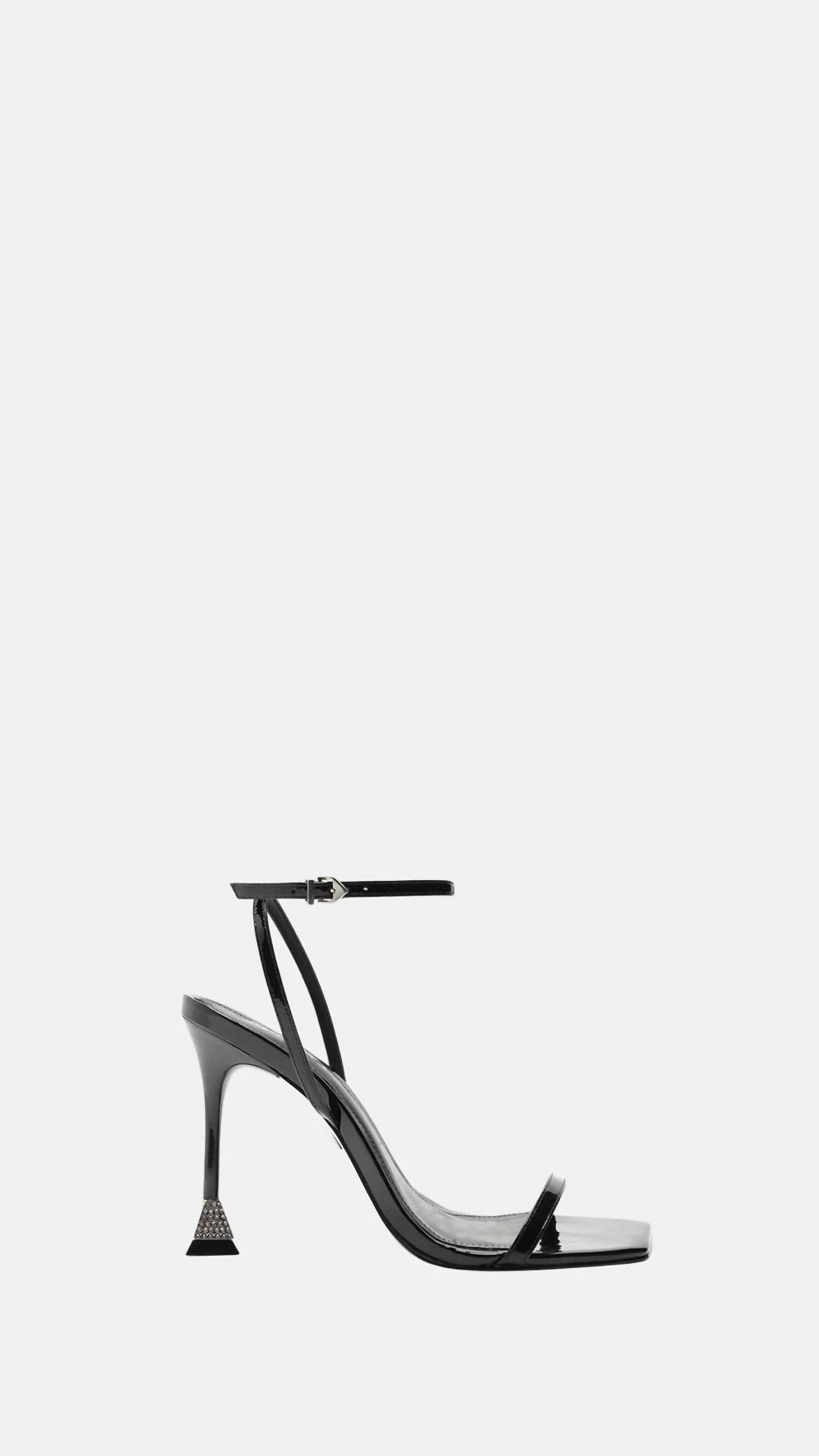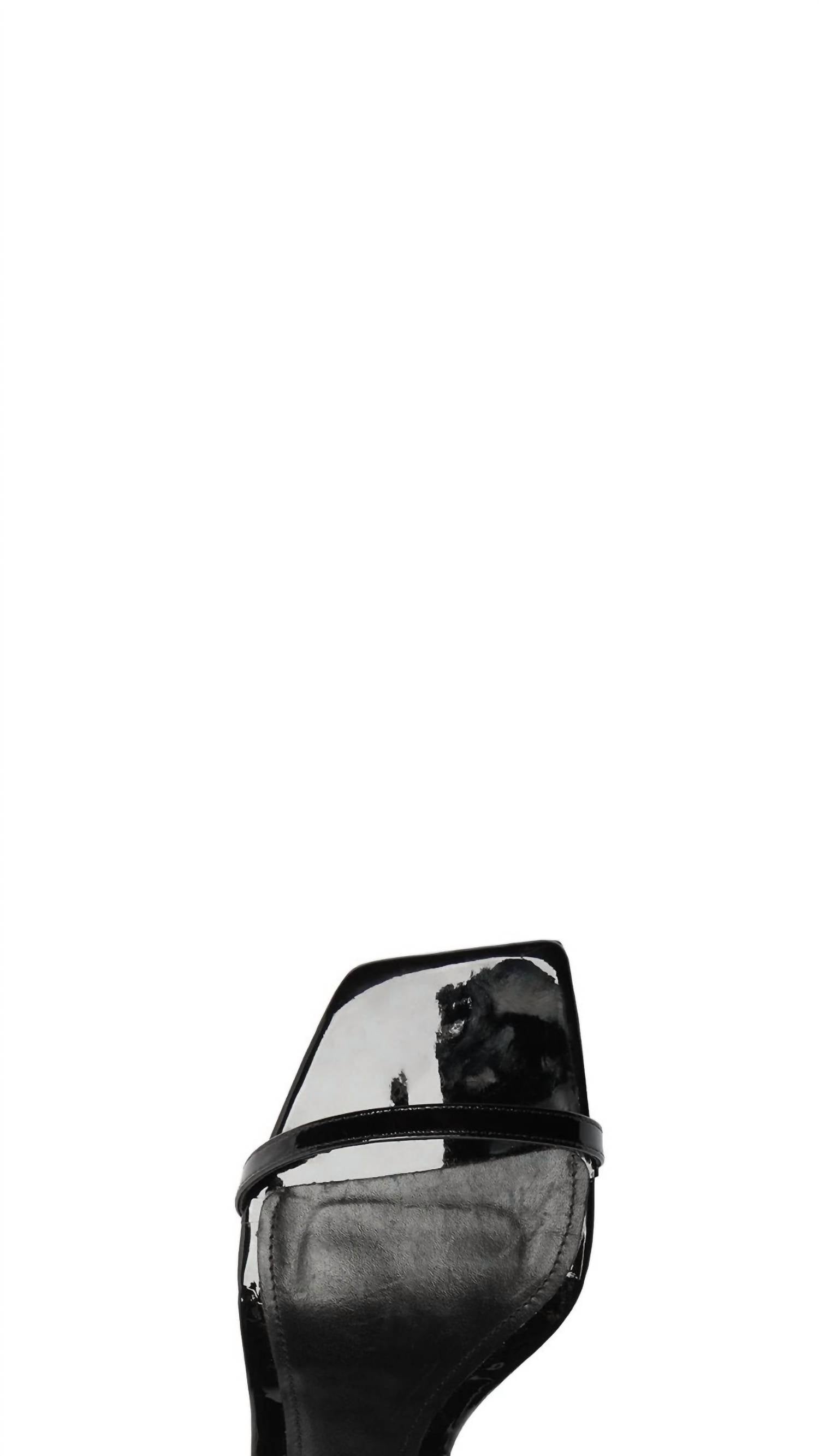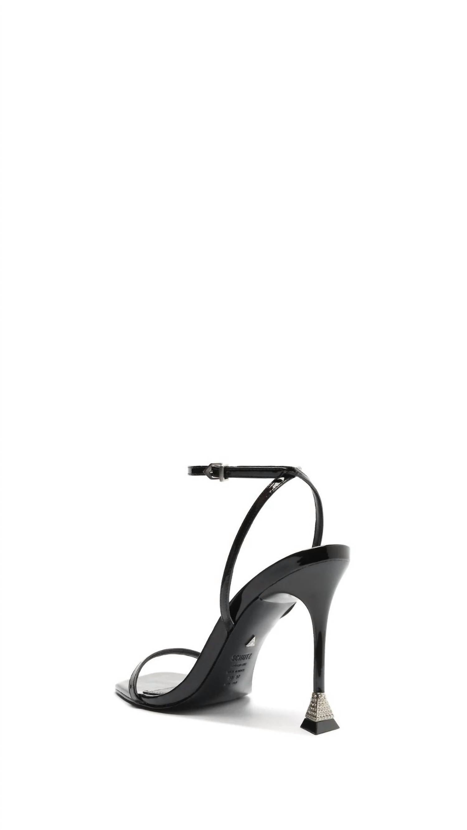 Don't be deceived, these heels are comfy as can be. Introducing the Women's Joanna Patent Leather Sandal by SCHUTZ, a stunning addition to any fashion-forward wardrobe. Crafted with a leather upper and leather outsole, this sandal showcases a singular front strap and adjustable ankle strap for a secure fit. Its distinctive features include a flared stiletto with diamond-like detail, buckle-up closure, and a square toe style, plus a heel height of 4.3 inches for an elegant lift. Ideal for adult women with a medium shoe width, this classic black sandal is perfect for spring dinner parties or Thanksgiving gatherings.