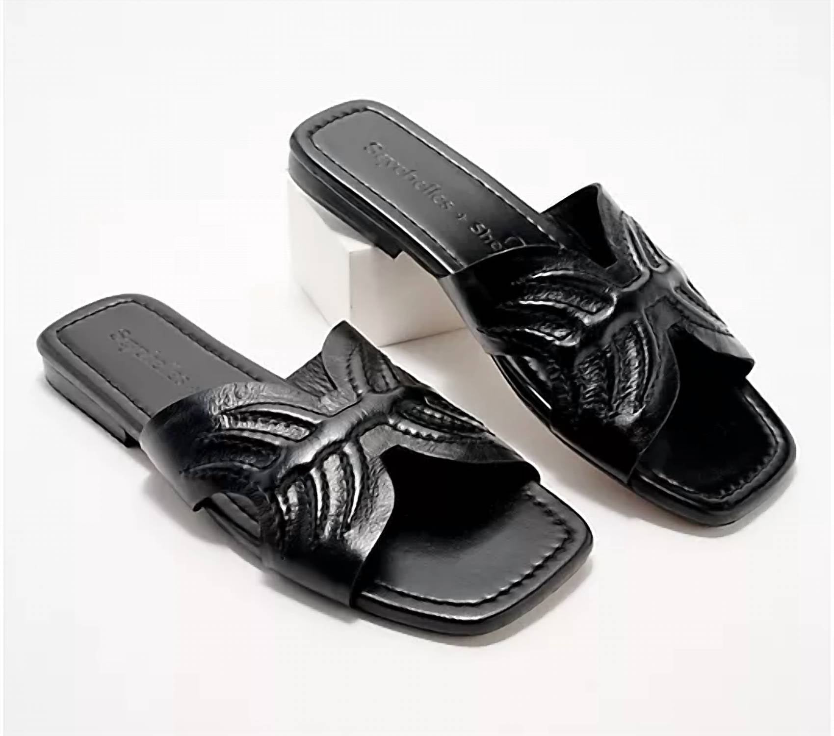 Experience the quiet luxury, meticulously crafted from burnished leather in a chic black. Feature a comfortable slip-on design with an open square toe and distinctive OrthoLite foam insoles for all-day comfort. With a flat heel of approximately 1" and a leather upper/lining paired with a man-made outsole. Perfect for any spring occasion, from holiday parties to sunny promenades. Embrace the boho chic trend with this versatile addition to your wardrobe.