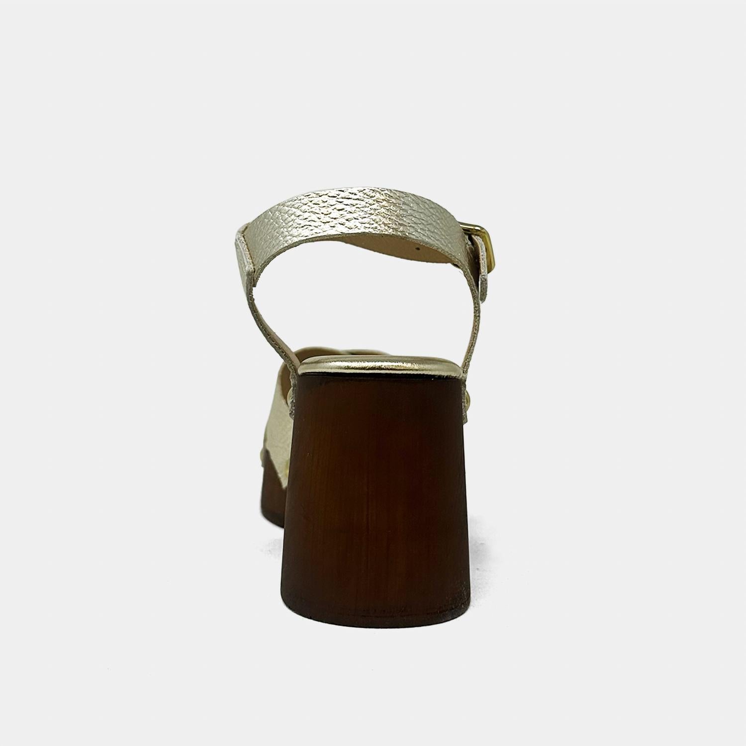 Don't be deceived, these heels are comfy as can be. Elevate your style with the Giovanna Sandal by SHU SHOP, a stunning platform heel in metallic gold. Crafted in Italy, this shoe features an open-toe design, a sculptural wooden sole, and crisscross leather straps for '70s-inspired glam. Highlighted with gold-tone rivet accents and a secure ankle strap, it promises both elegance and stability. Ideal for women seeking a bold, versatile piece that complements both day and evening looks.