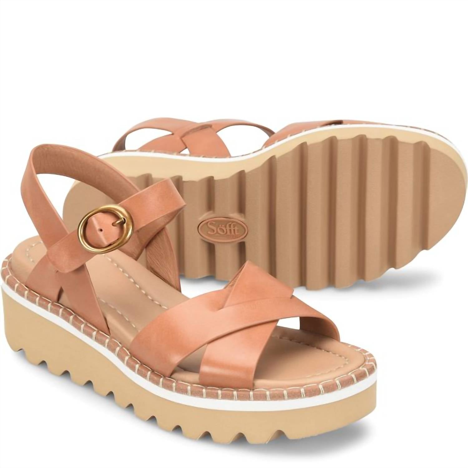 Flowy dresses, cropped pants, and even jumpsuits... this sandal works with them all! Step into summer with the Sofft Ruthie Women's Sandal, crafted from luxurious Italian leather in a chic luggage shade. This sandal features an adjustable buckle for a customized fit and a mid-height platform heel measuring 2 1/4 inches for the perfect blend of style and comfort. Lined with leather, it boasts a cushioned footbed with heel padding and a grippy rubber-EVA blend outsole, ideal for all-day wear. Perfect for boho chic vacations or Easter celebrations, these sandals are a versatile addition to any wardrobe.