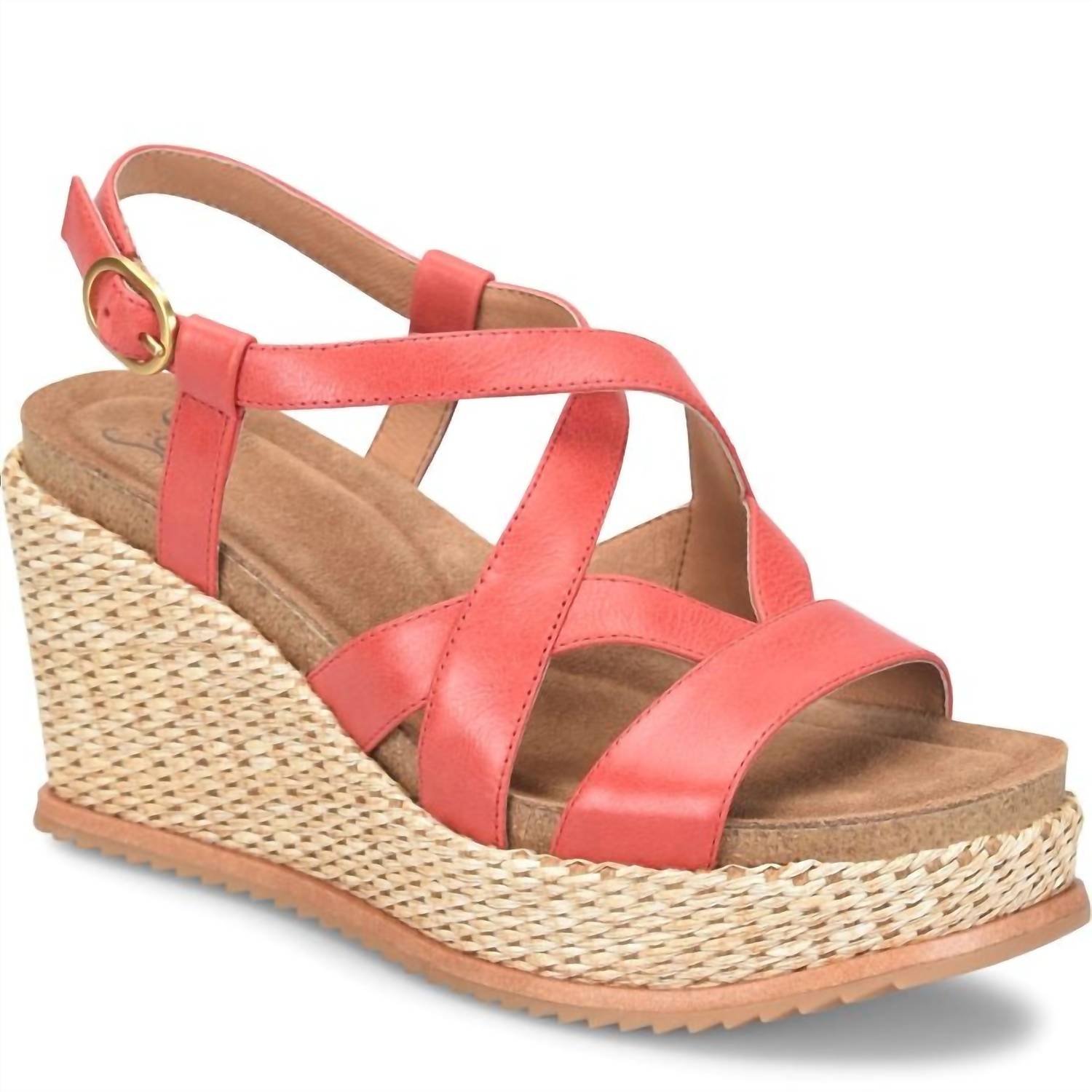 Classicly cute and all-day-wearable. We love this sandal. Elevate your summer style with the Women's Devyn Wedge Sandal by Sofft, featuring an Italian leather construction in a vibrant Red Coral hue. The chic woven wrapped BPU wedge stands at a graceful 3.5 inches, complemented by a suede-lined cork comfort footbed and leather lining for all-day comfort. It includes an adjustable buckle for a secure fit, and a TPR outsole with a leather welt for added durability. Perfectly suited for a Thanksgiving dinner party, this sandal embodies the essence of 90s fashion with its open toe and high wedge heel, ensuring you make a statement with each step.