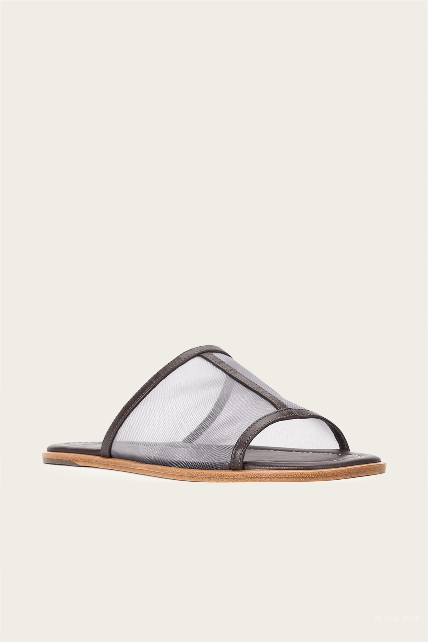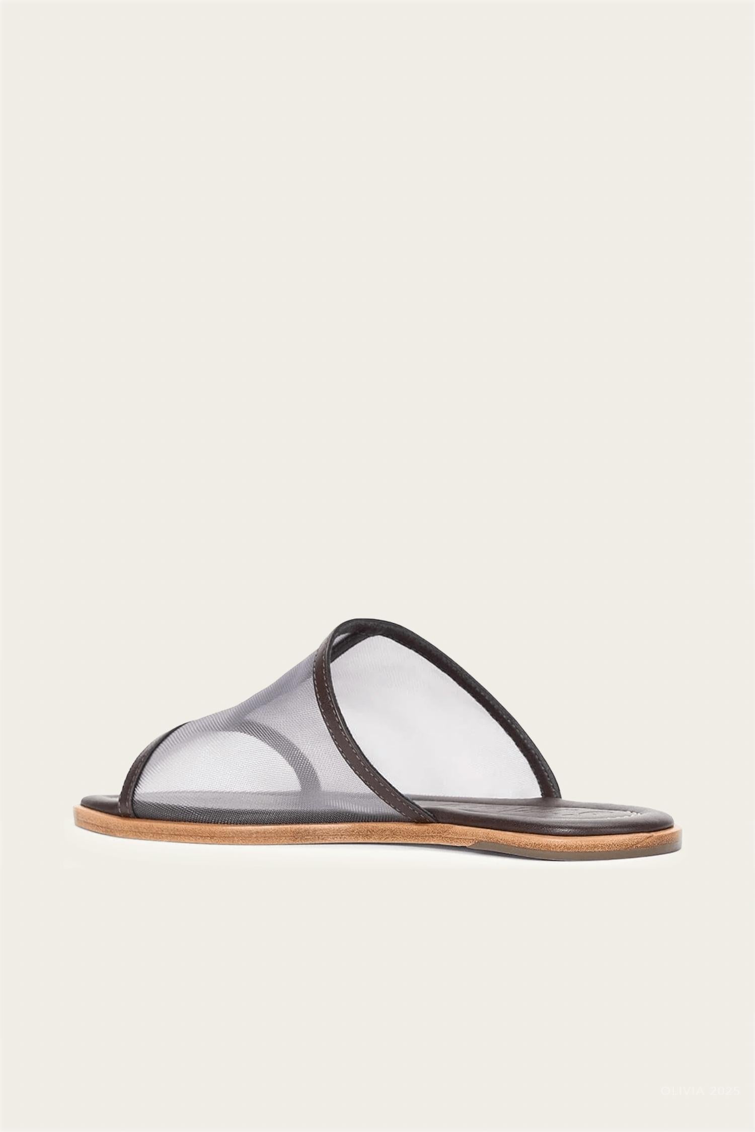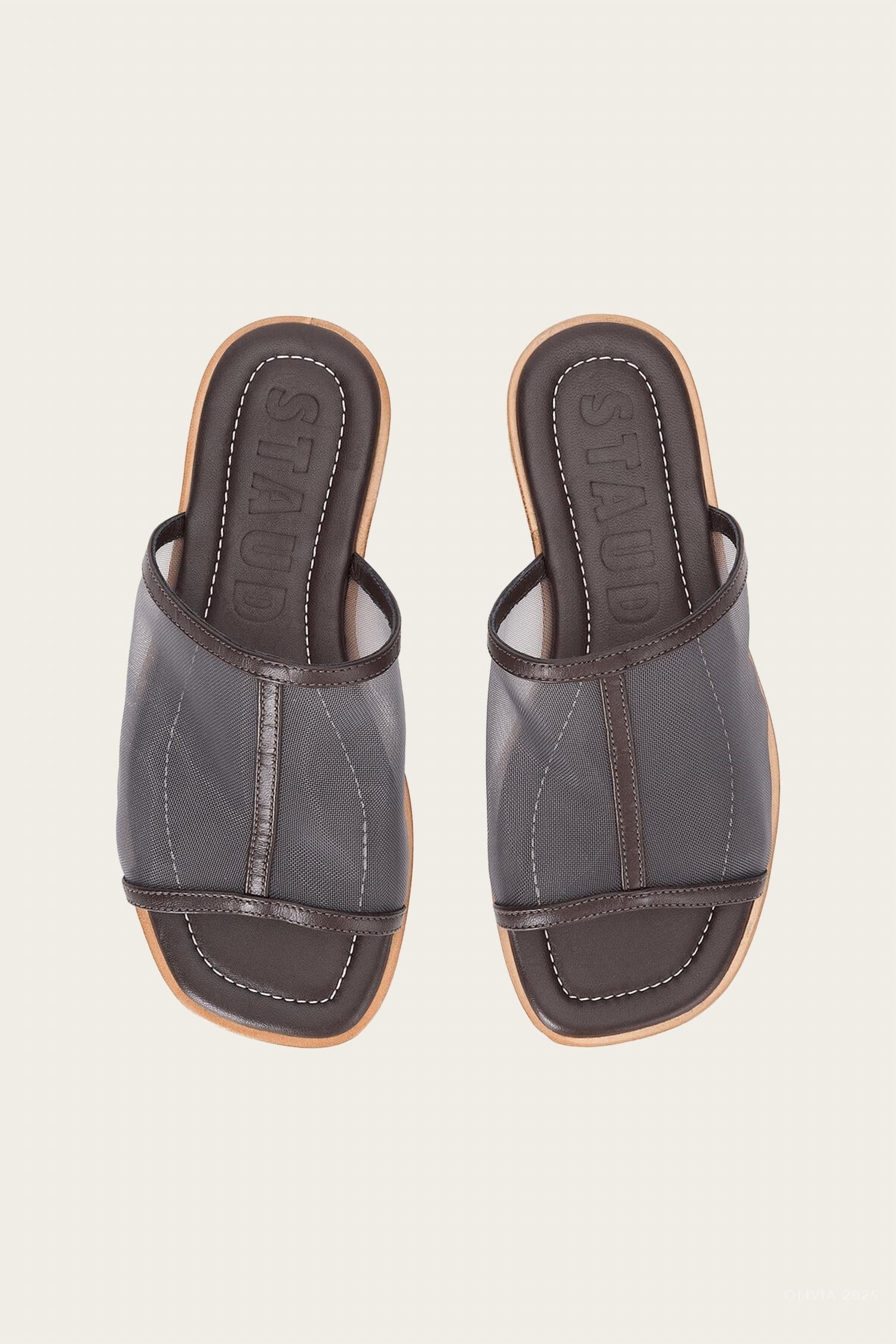 Flowy dresses, cropped pants, and even jumpsuits... this sandal works with them all! Introducing the Women's Alessandra Sandal by STAUD, a stylish choice for any dinner party. Featuring a sophisticated espresso mesh design, these mesh slip-on sandals boast an upper made from 100% polyester, while the sole combines 75% cow leather and 25% rubber for durability. With a flat heel and a chic square toe, these sandals are perfect for showcasing your sense of style. Imported and based on American sizing, this elegant piece is both practical and fashionable.