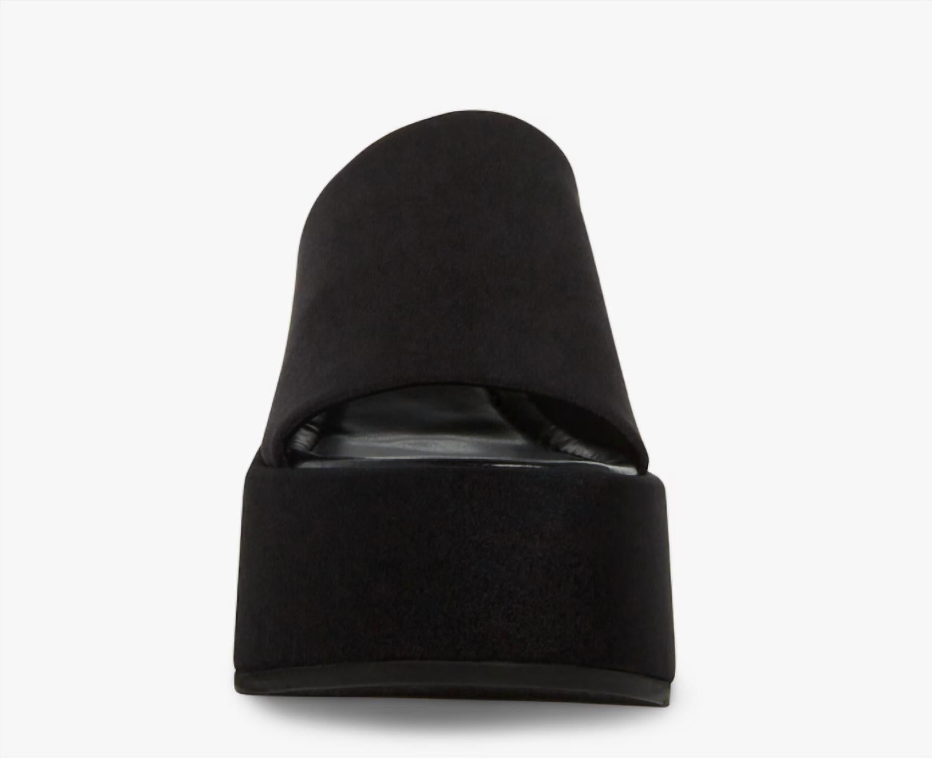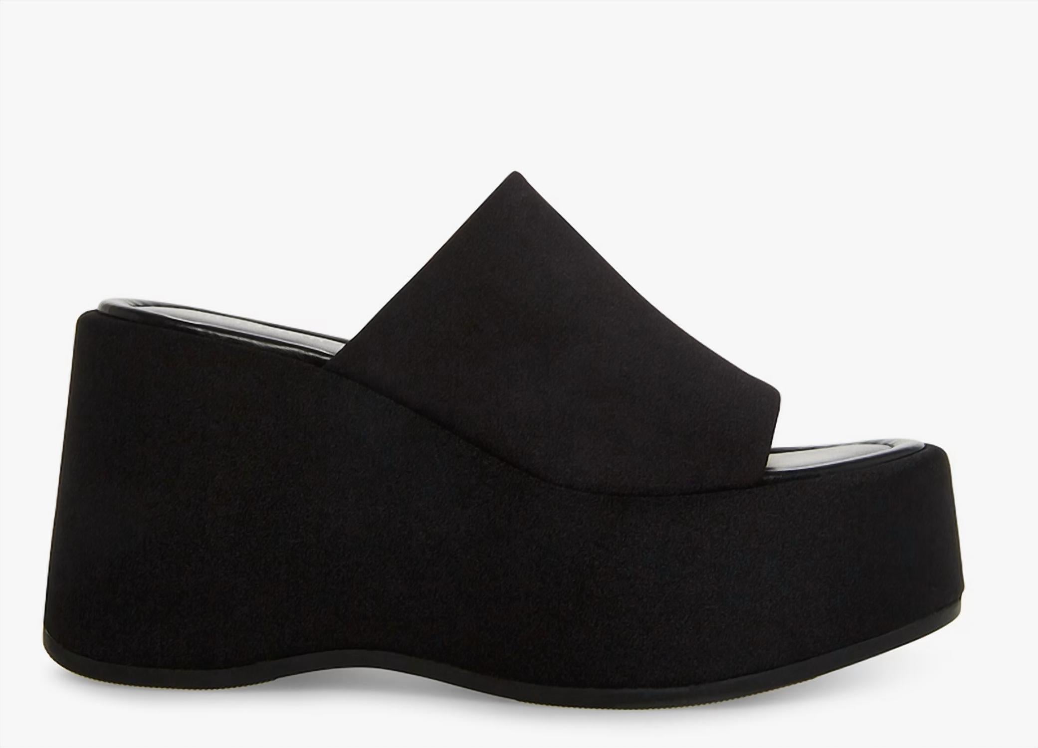 Classicly cute and all-day-wearable. We love this sandal. The Steve Madden Slip On Chunky Wedge Sandal in black offers an exotic edge to your ensemble with its open-toe design and wedge heel, perfect for summer outings or birthday celebrations. These women's sandals effortlessly blend style with comfort, making them a chic addition to your footwear collection. Crafted with durable single-band lycra, they ensure a secure fit and added elevation. Ideal for pairing with skinny jeans to create a standout look for any adult woman.