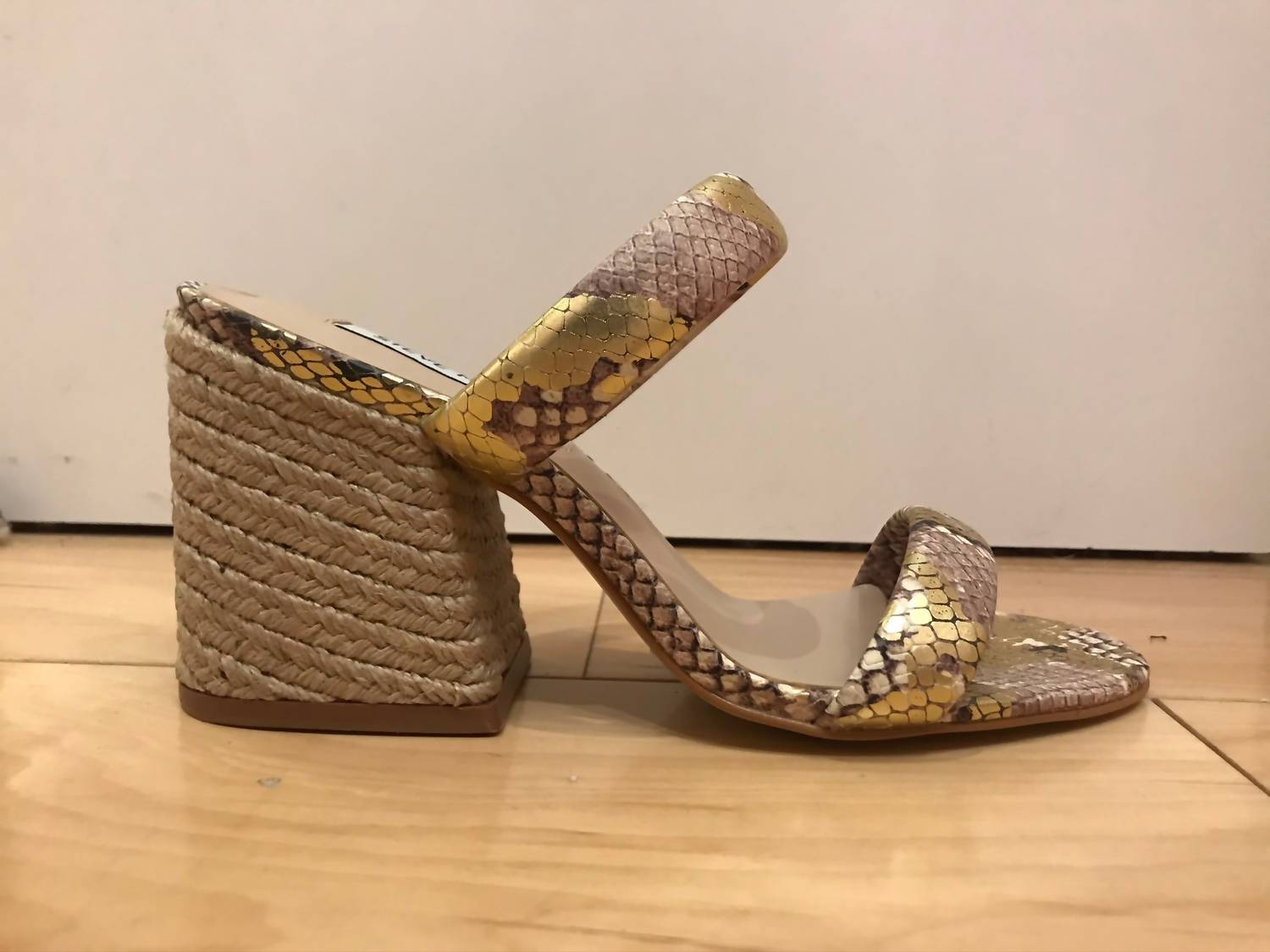 This sandal will take you from brunch to dinner and everything in between. The Women's Leather Strap Jute Heel Sandal from STEVE MADDEN brings a touch of sophistication to any evening event. Featuring elegant leather straps in a shimmering gold finish, these sandals boast an open toe design and a stylish block heel. Perfect for adults, they combine luxury with comfort, making them a standout choice for any special occasion. Made for women, these sandals promise to enhance any outfit with their chic design.