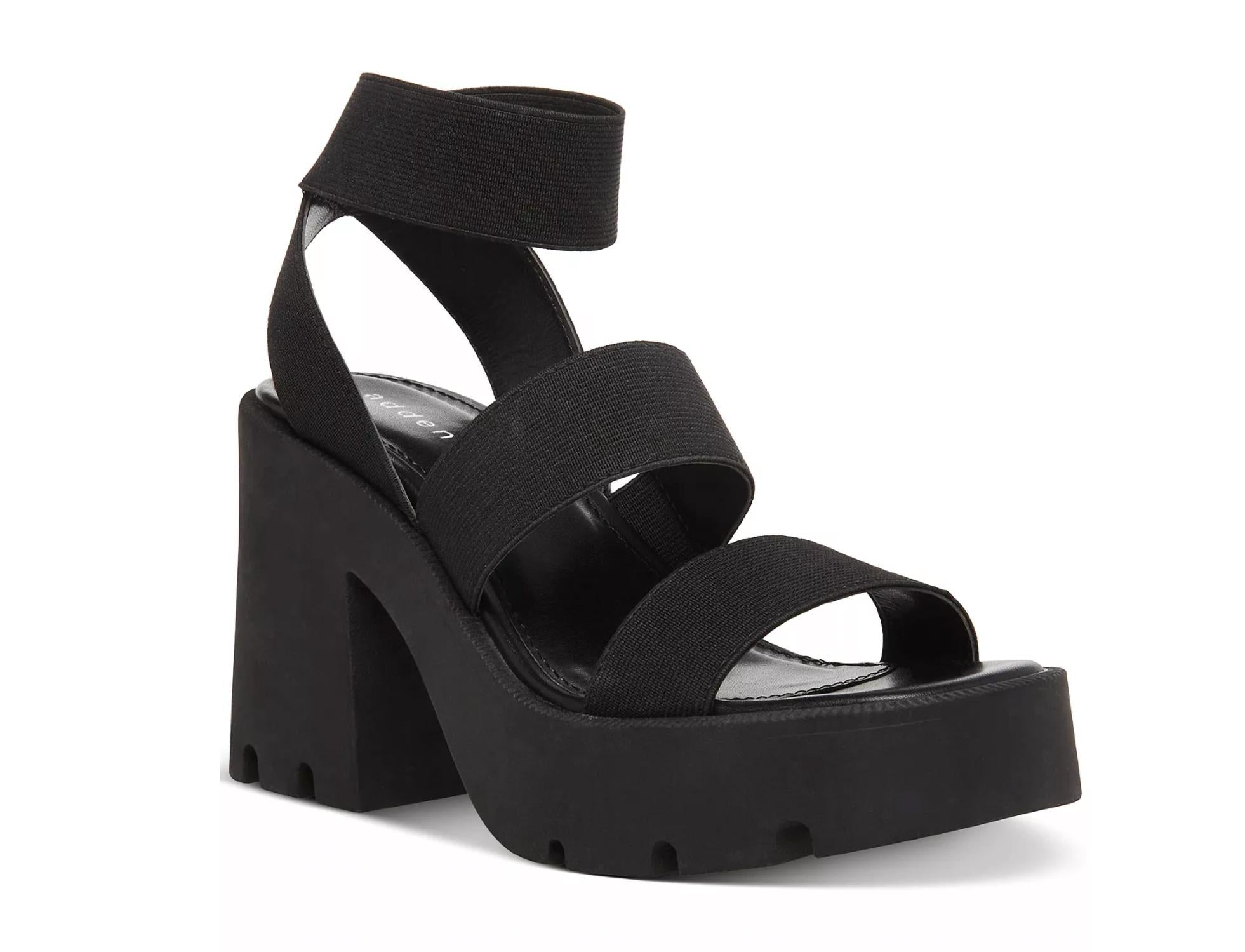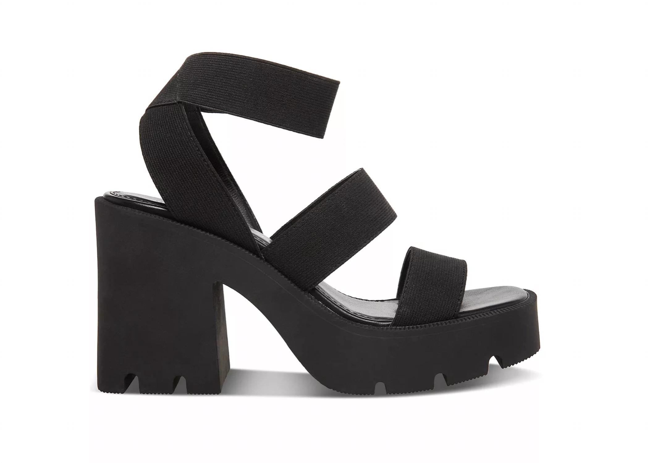 Flowy dresses, cropped pants, and even jumpsuits... this sandal works with them all! Step into elevated style with the Women's Round Toe Strappy Lug Platform Sandals by Steve Madden, perfect for your next cocktail party. Designed with an elastic fabric upper, these tan sandals feature a round open toe and a convenient slip-on ankle strap. The striking 4-inch block heel is complemented by a 1-1/4-inch platform, offering a high lift while ensuring comfort. Ideal for spring, these chic sandals effortlessly enhance any wardrobe with a strappy silhouette and chunky lug platforms.