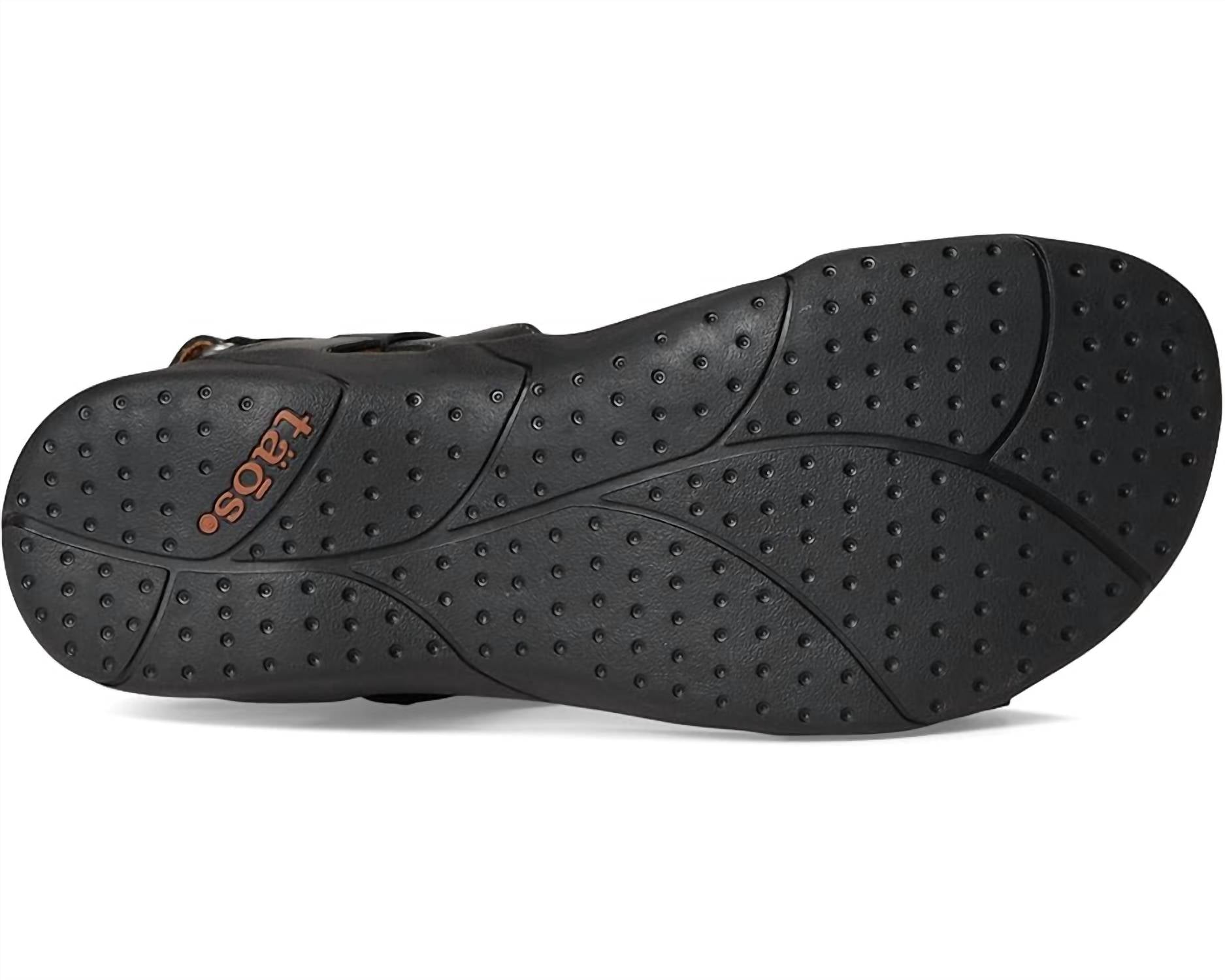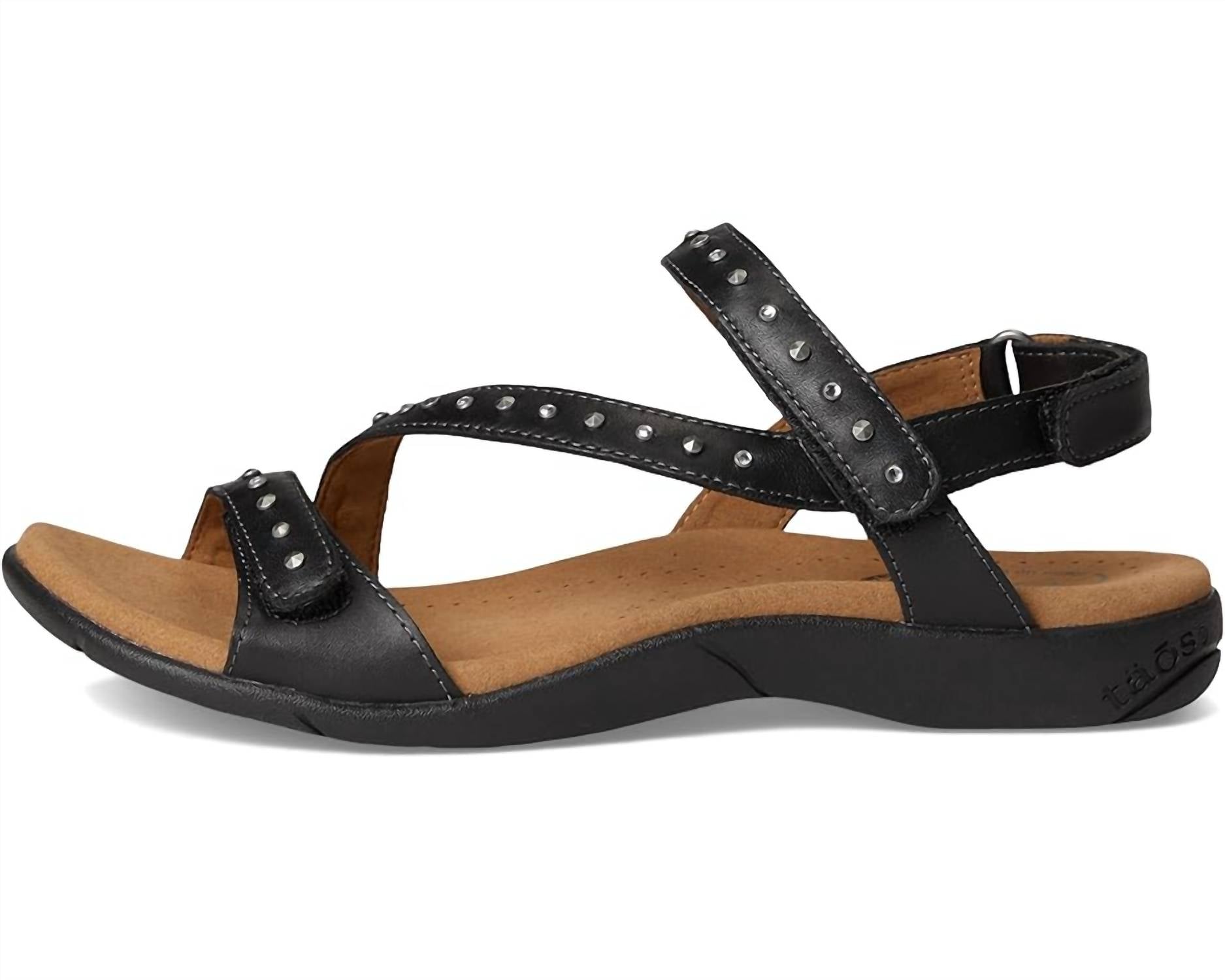 This sandal will take you from brunch to dinner and everything in between. Elevate your sandal collection with the Women's Dazzle Sandal by Taos, featuring a stylish Z-strap design adorned with delicate stone and stud details in classic black. These sandals offer a personalized fit with adjustable hook and loop closures, while the Soft Support™ insole with arch support ensures comfort throughout the day. Crafted with a premium leather upper and breathable microfiber footbed lining, these sandals promise both durability and elegance. Heel height: 0.75 inches. Care: Buff with a leather cleaner or polish, then wipe with a dry cloth. Weight per shoe: 6.9 oz. Perfect for any summer occasion, from brunches to weddings.