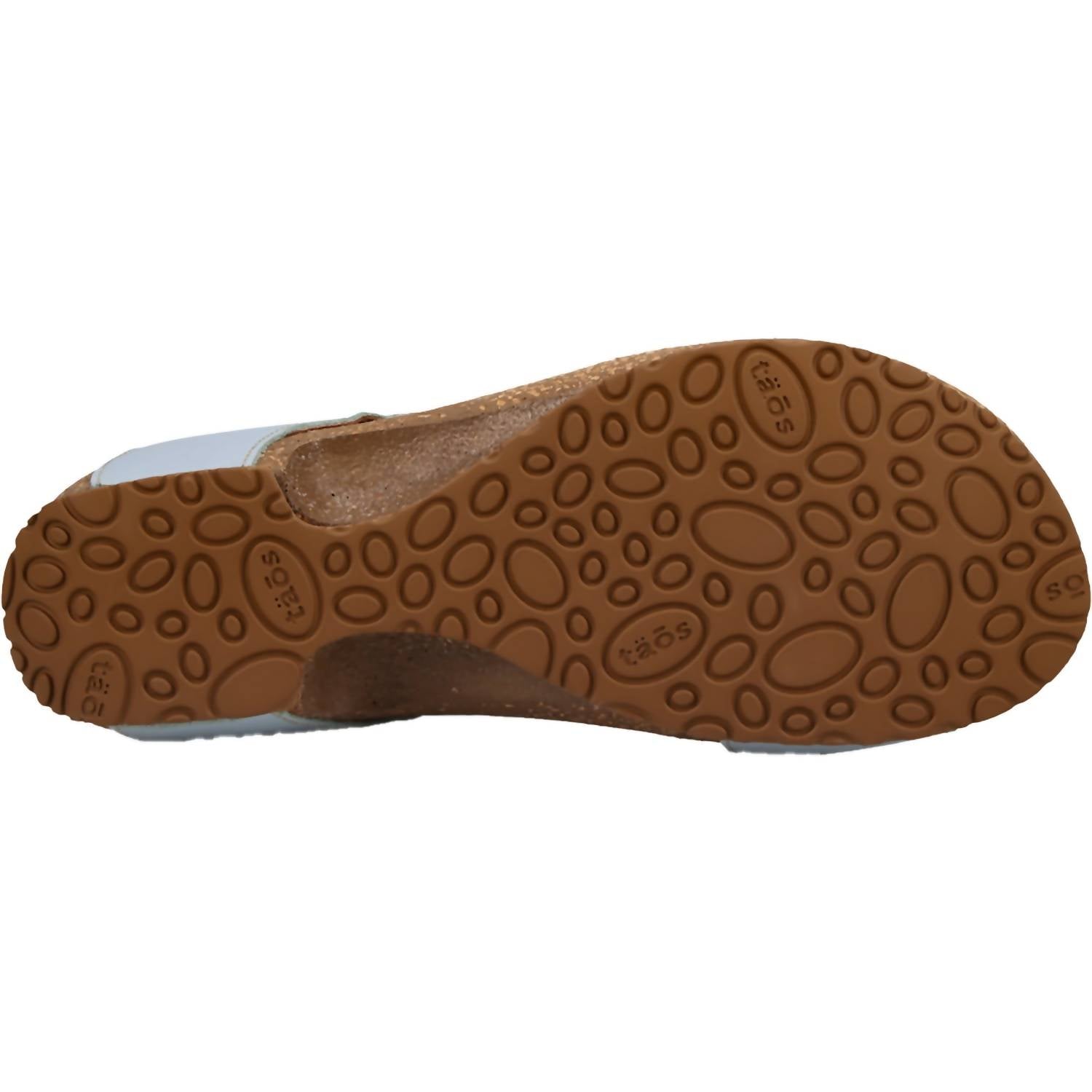 Discover the Taos Women's Loop Leather Sandal in a refreshing Light Blue, perfect for your summer wardrobe. Made in Spain from premium European leather, these sandals feature an adjustable hook and loop strap for a custom fit. The 1.75" wedge heel provides optimal support and stability, complemented by arch and metatarsal support, forefoot cushioning, and a suede-lined footbed. Finished with a durable rubber outsole, these sandals promise comfort and style, ideal for vacation strolls or casual summer outings.