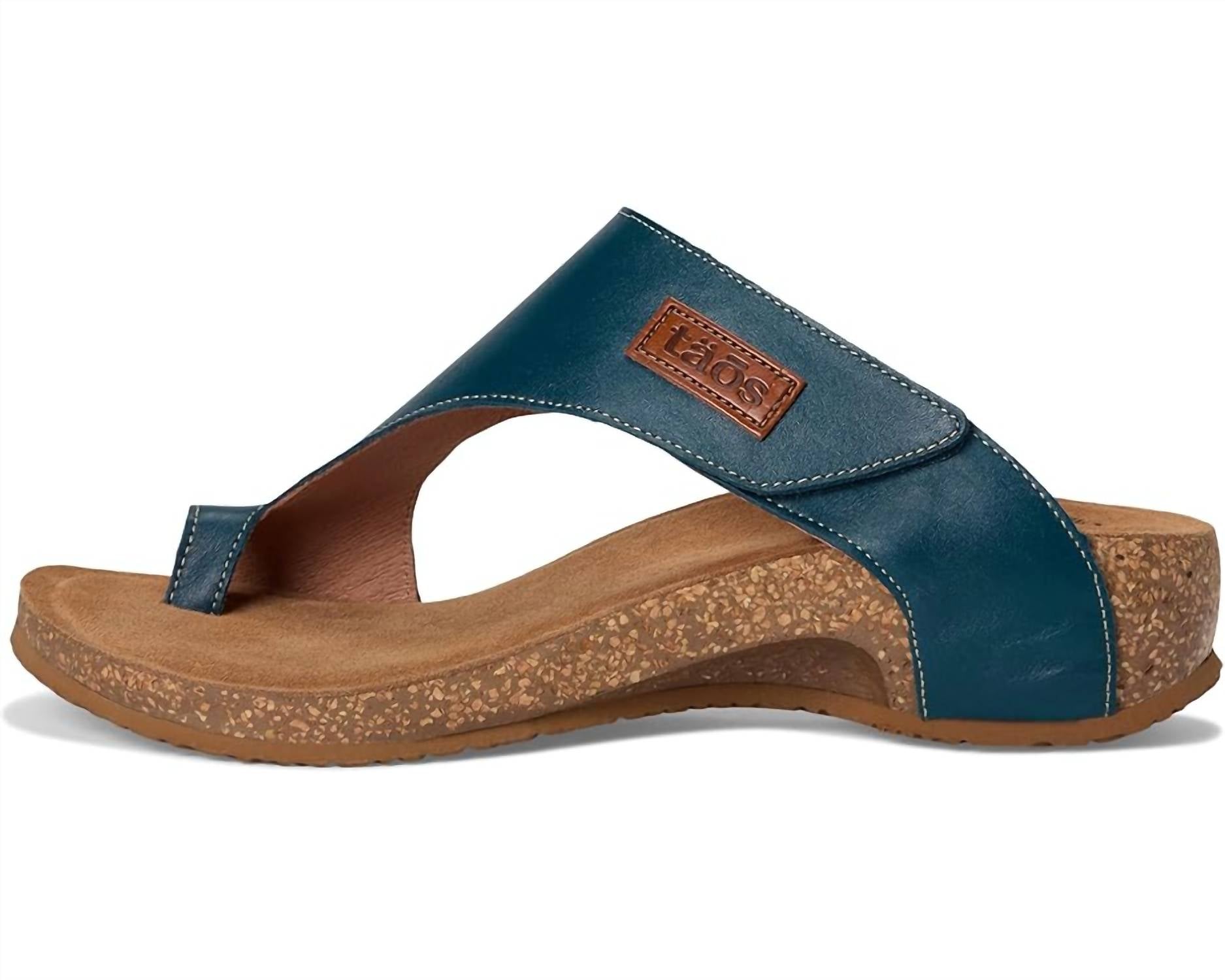 Classicly cute and all-day-wearable. We love this sandal. Introducing the Women's Loop Sandal by Taos in a striking Deep Sea Blue, perfect for minimalist summer vacations. Crafted in Spain, these sandals boast premium European leather uppers with an adjustable hook-and-loop closure for a secure fit. With a cushioned cork-PU footbed wrapped in soft suede, and a lightweight yet durable rubber outsole, each shoe weighs just 7.2 oz and offers a 1.75" wedge heel for comfortable wear. Care is simple: buff with a leather cleaner or polish and wipe off with a dry cloth. Arch and metatarsal support included for enhanced stability during those long walks.