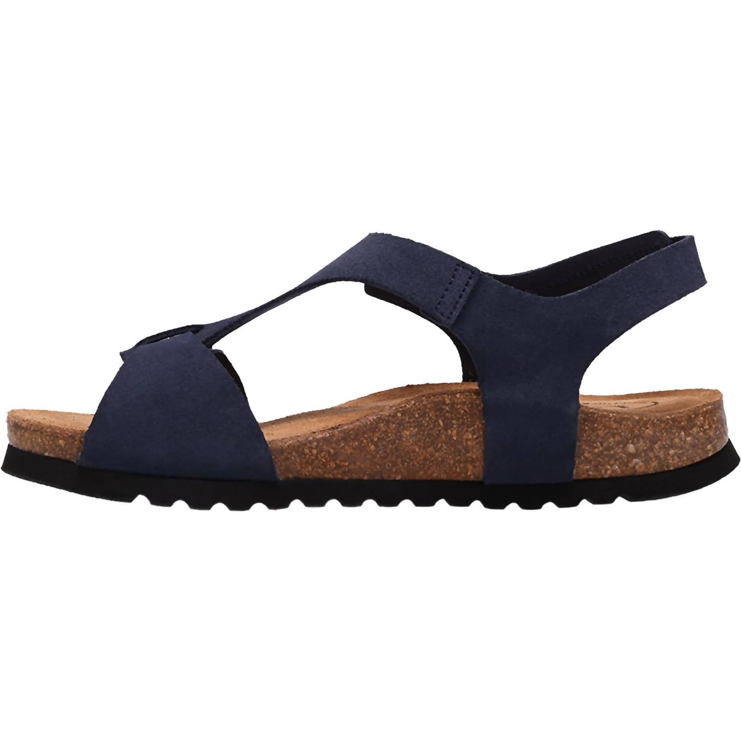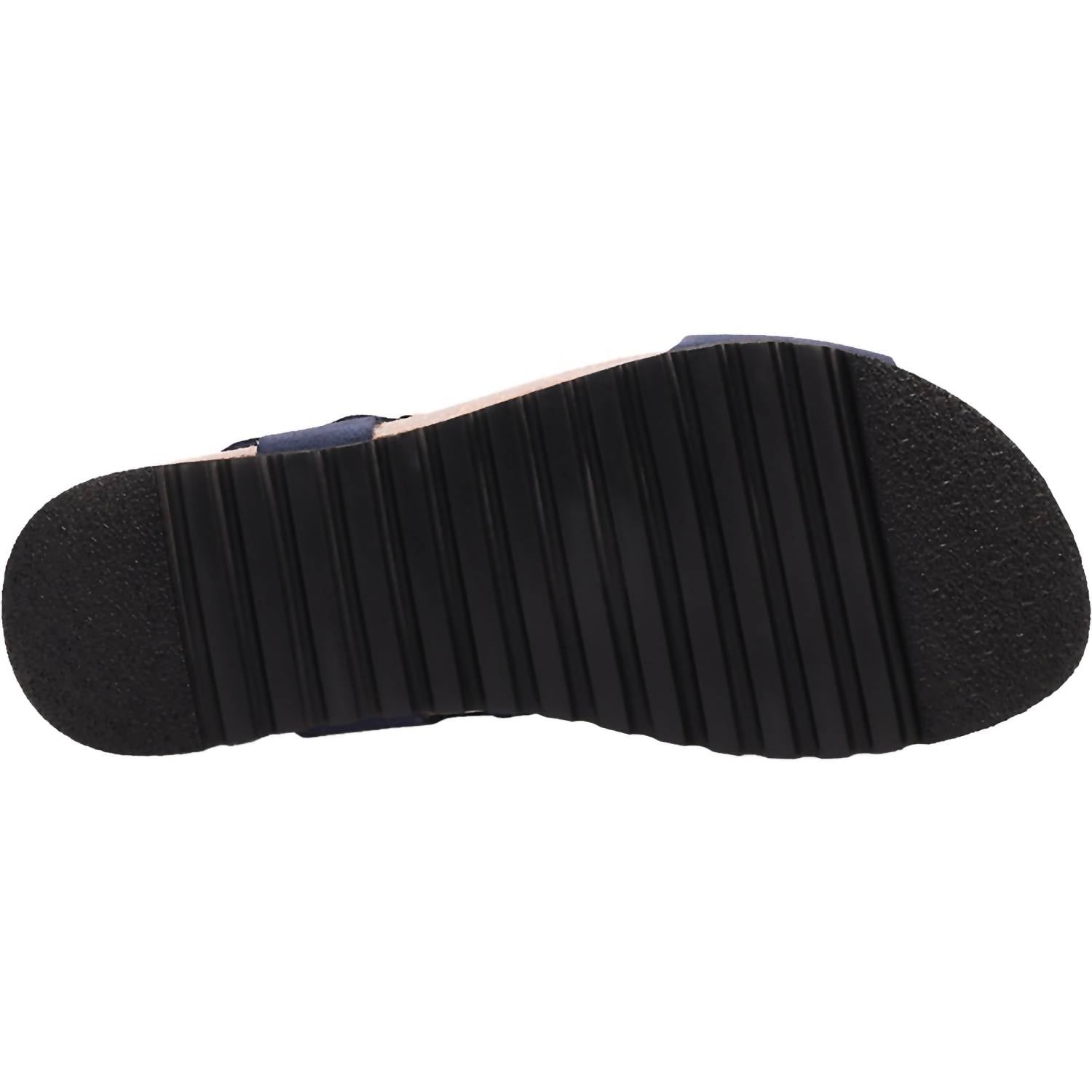 Introducing the Taos Women's MVP Suede Sandals in a chic navy hue, perfect for adding a dash of glam to your summer ensembles. Crafted with European suede in Spain, these sandals feature a leather upper material combined with a supportive cork midsole and a 0.5-inch flat heel for superior comfort. The design includes three points of adjustability with hook and loop closures adorned with contrasting faux buckles. Care for these sandals by buffing with a leather cleaner or polish and wiping them with a dry cloth.