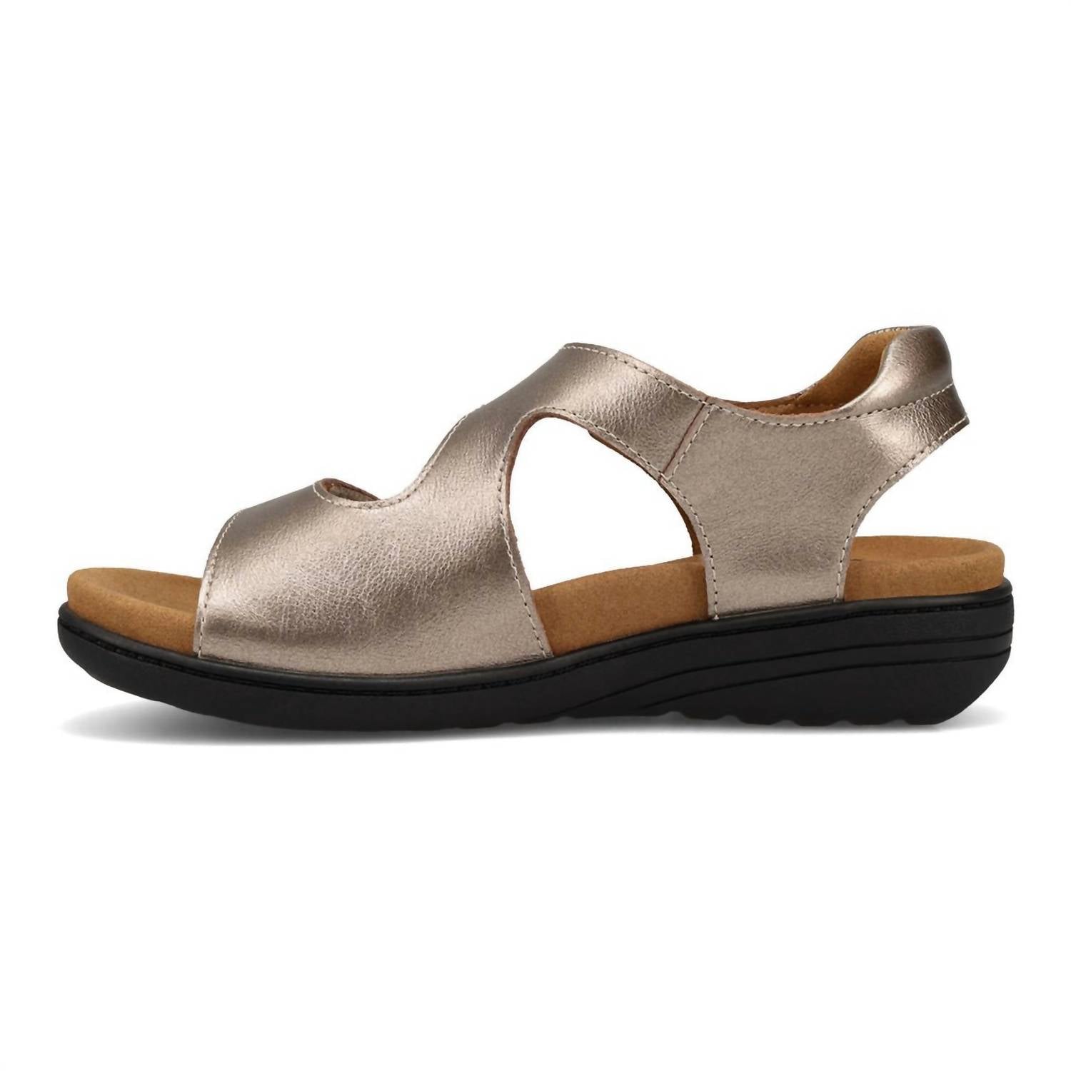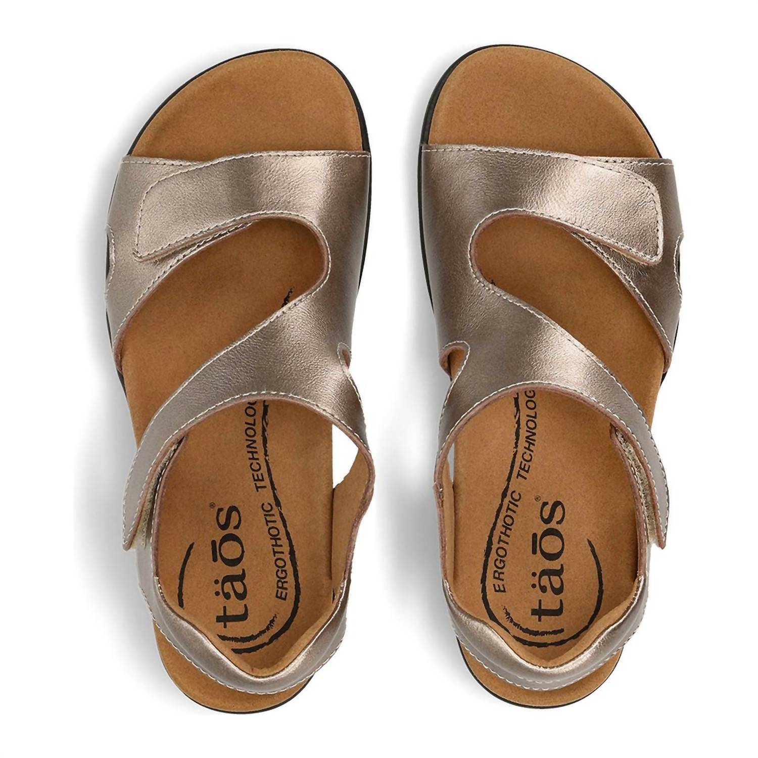 This sandal will take you from brunch to dinner and everything in between. Introducing the Women's Serene Sandal by Taos, a perfect blend of support and classic style in elegant Champagne. These sandals feature an open toe design with beautiful leather uppers and a completely adjustable fit for personalized comfort. The Structured Support footbed, wrapped in microfiber, offers exceptional arch and metatarsal support with a low 1.25" wedge heel. Ideal for beach days and embodying a Boho Chic trend, these sandals promise all-day comfort and style.
