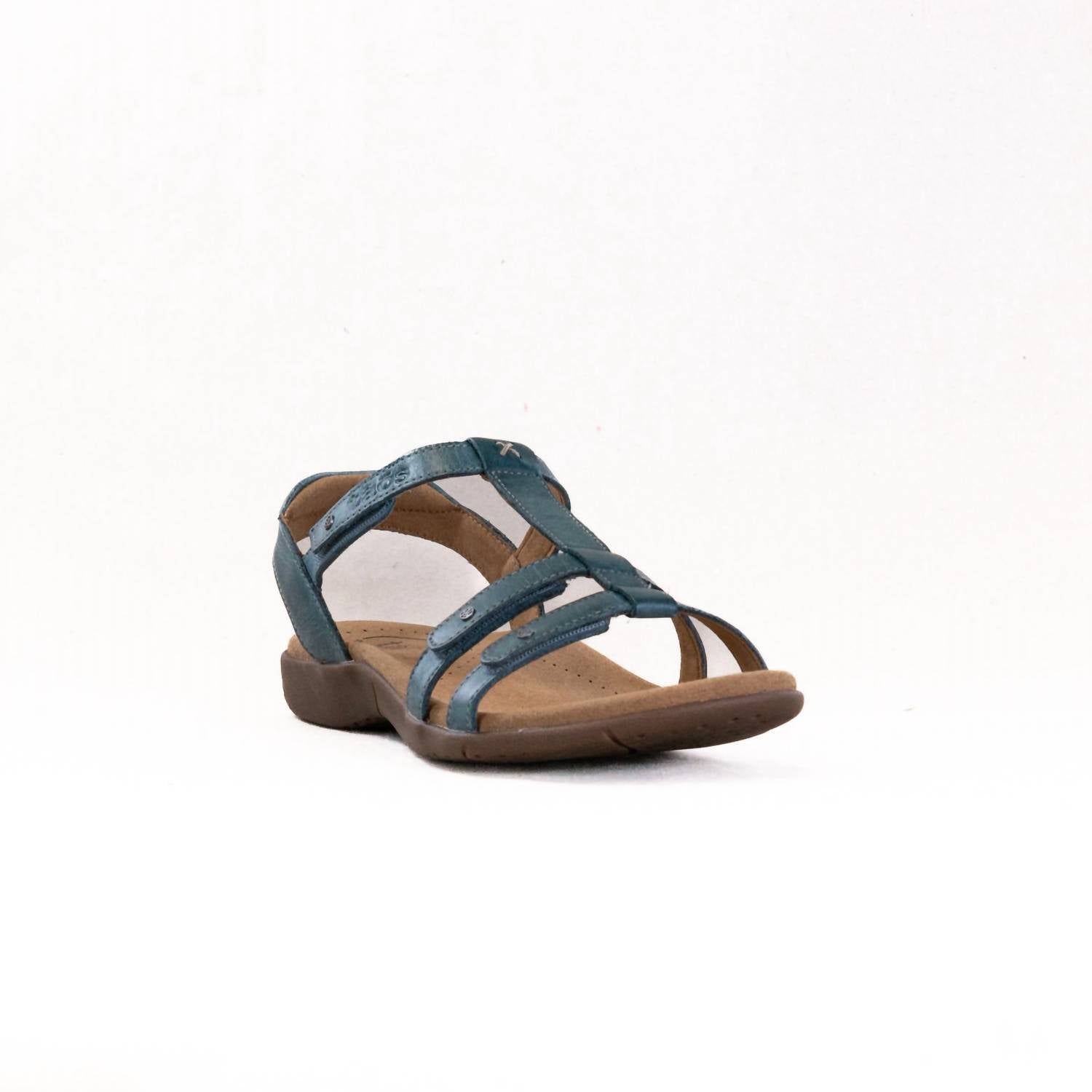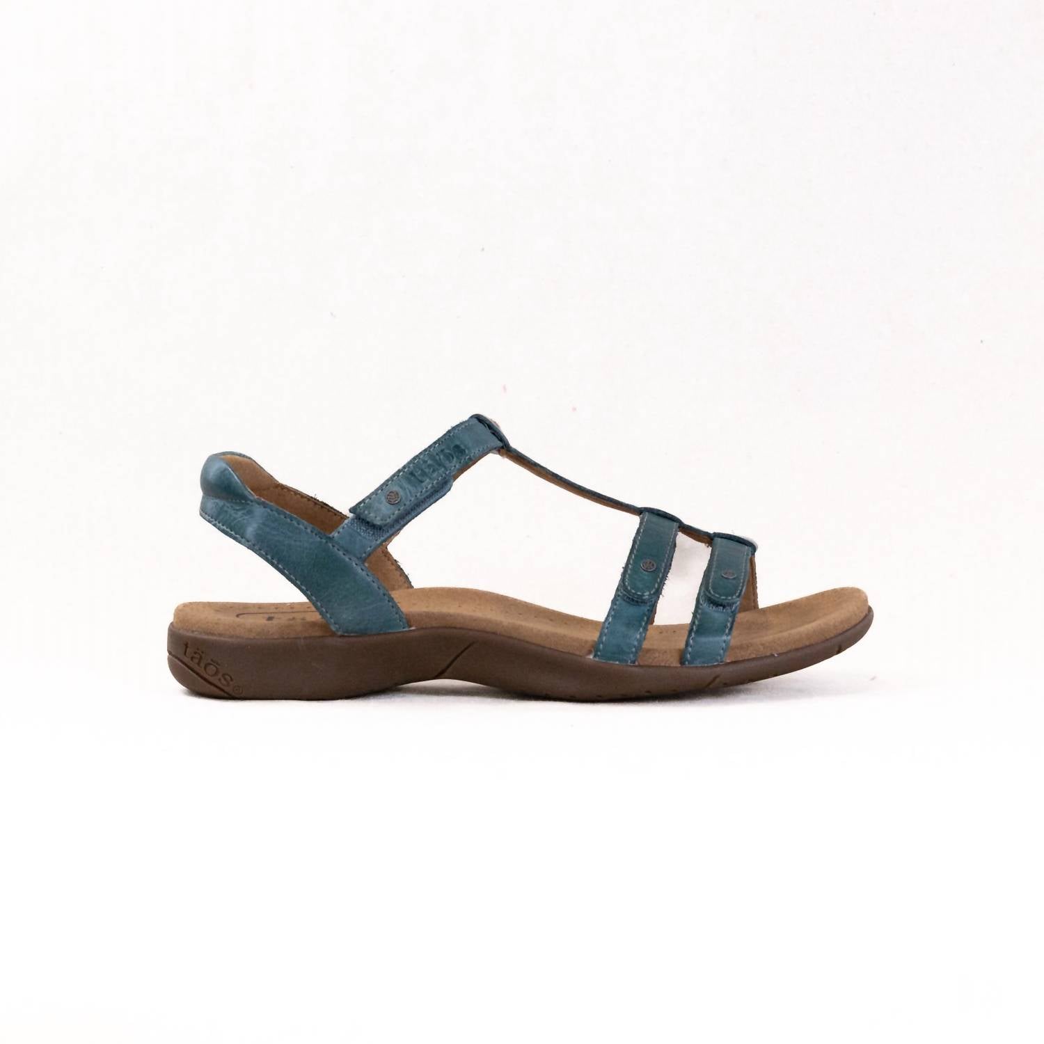 Introducing the Women's Trophy 2 Sandals by Taos in a stylish teal color, perfect for your summer wardrobe. Crafted from premium leather, these sandals boast fully adjustable straps for a customized fit and a hook and loop closure for convenience. The standout Taos Soft Support premium footbed, with Cool Recovery Foam®, offers exceptional comfort with arch and metatarsal support, complemented by a breathable microfiber lining and antimicrobial shield. The flexible rubber outsole provides durability while the 0.75" flat heel adds a chic touch. Heel height: 0.75". Care: Buff with a leather cleaner or polish, and wipe off with a dry cloth.