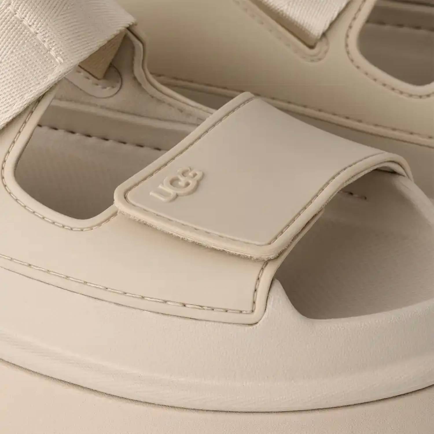 This sandal will take you from brunch to dinner and everything in between. Step into summer style with the Women's Goldenglow Sandals by UGG in a refreshing Sea Salt color. Featuring an open toe and a chunky heel, these sandals are constructed with a TPU upper and lined with 100% recycled polyester fibers for sustainable flair. The springy sugarcane EVA midsole and outsole provide support and comfort, while the hook-and-loop closure ensures a customizable fit. Perfect for vacation or Easter outings, these sandals promise to be your lightweight, streetwear staple.