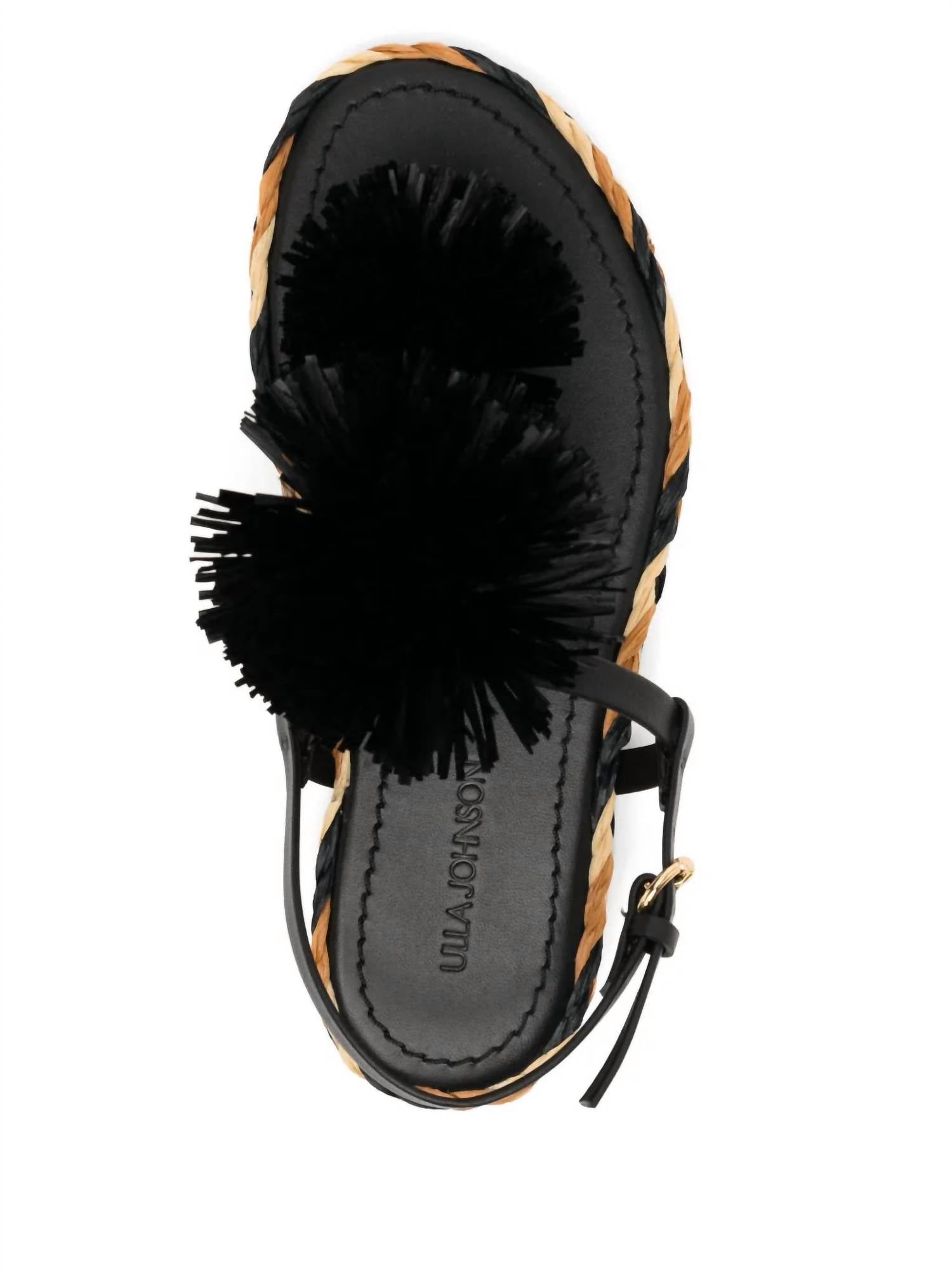 A preppy yet feminine take on the classic loafer. Introducing the Women's Ingrid Espadrille Flat Sandal by Ulla Johnson, a perfect blend of style and sophistication showcased in noir for that elegant allure. This sandal features round toe with a thong silhouette and an artful arrangement of raffia pom-poms atop a luxurious black leather upper. It boasts a flat heel under 1", making it ideal for comfortable all-day wear during summer beach days. Crafted in Italy, this piece combines effortless style with premium craftsmanship.