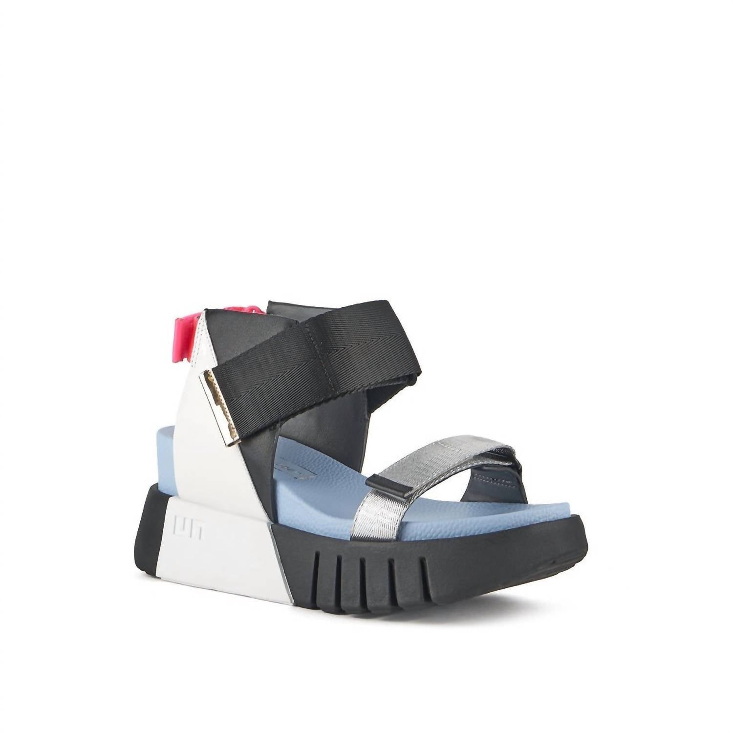This sandal will take you from brunch to dinner and everything in between. Meet the Women's Delta Run Sandals by United Nude, designed for a strikingly modern look with geometric shapes and graphic lines. These platform sandals in Skyway feature an open toe with three adjustable straps crafted from Nappa leather, TPU, and nylon webbing for a sleek yet functional fit. A 2.6-inch heel height adds a comfortable rise, complemented by a leather lining and a durable rubber outsole. Perfect for summer streetwear or a holiday party, these sandals are your go-to for both comfort and style.