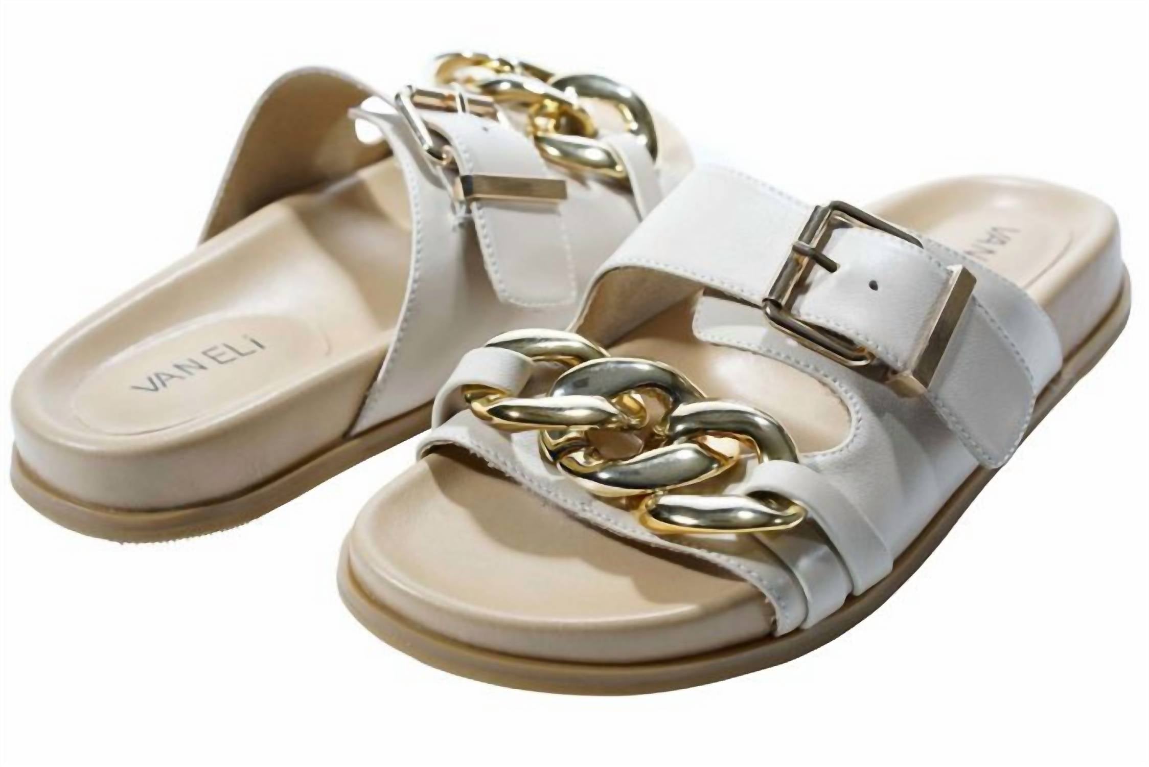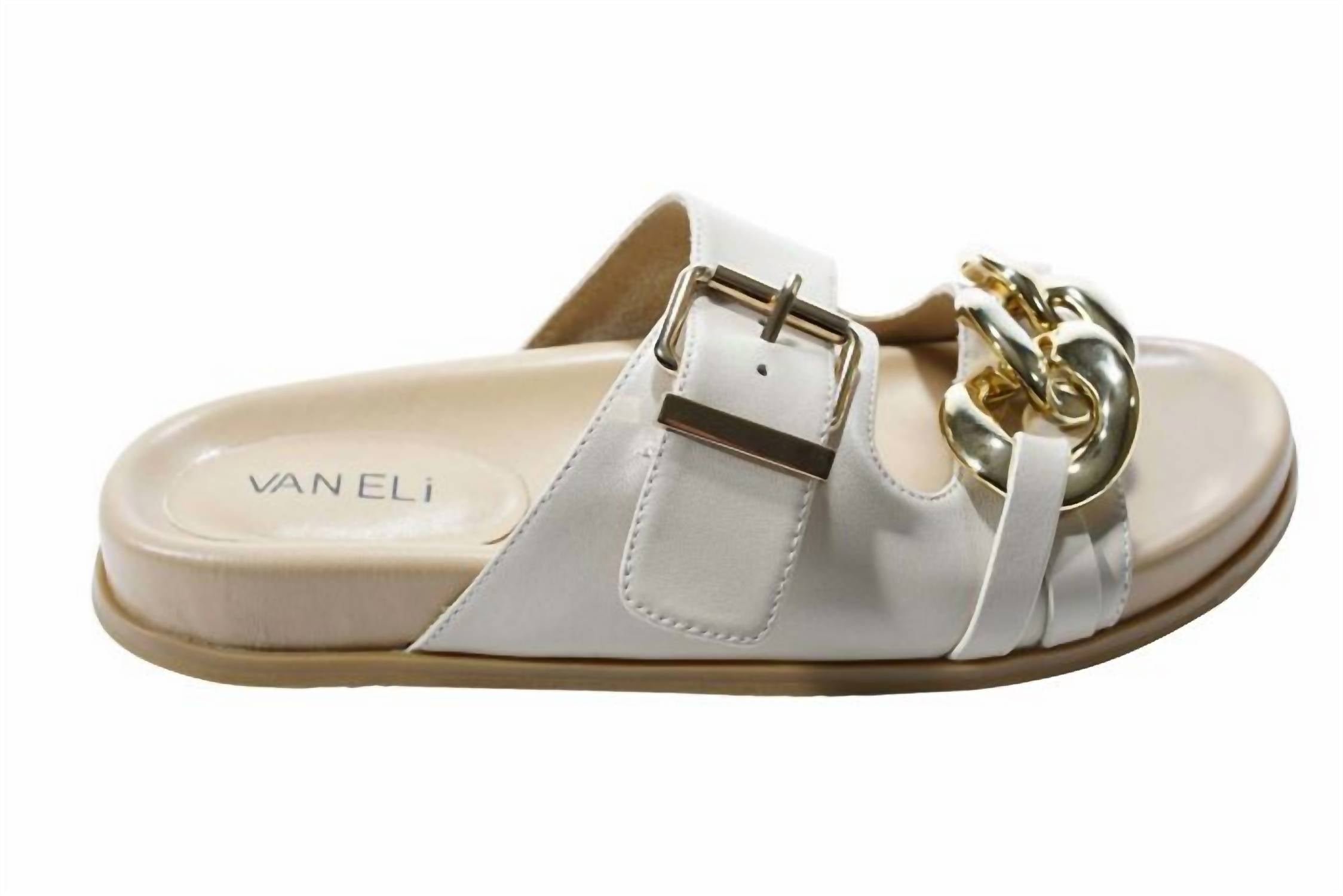 This sandal will take you from brunch to dinner and everything in between. Discover the Women's Farasy Nappa Slide Sandal by VANELi, an ideal minimalist choice for summer vacations in a soft beige tone. These flat heel sandals feature a chic leather construction with two adjustable buckle straps and a stylish chain accent. Enjoy all-day comfort with a molded, cushioned footbed and a rubber sole, all while maintaining a low 1-inch heel height. Perfect for any stylish woman seeking a blend of elegance and ease.