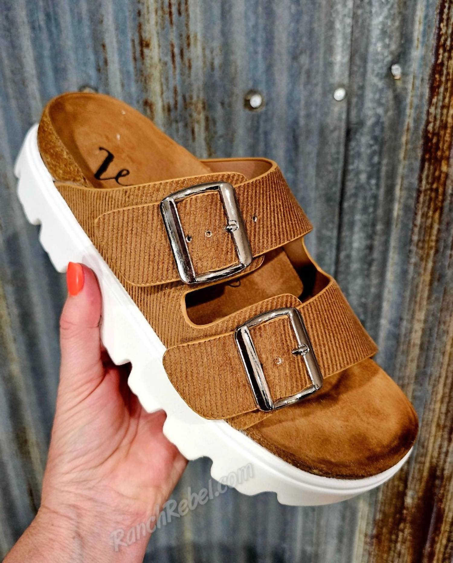 Flowy dresses, cropped pants, and even jumpsuits... this sandal works with them all! Step into boho chic style with the Women's Jazmin Sandal by Very G, perfect for your summer vacation wardrobe. Crafted with faux leather material, these tan sandals feature an open toe design, medium width, and a contoured footbed covered in a soft, suede-like fabric for comfort. They're easily adjustable with two silver buckles and have a lightweight rubber and cork flat heel under 1" tall, ensuring they fit true to a half size big. These sandals are a must-have for any warm-weather occasion.