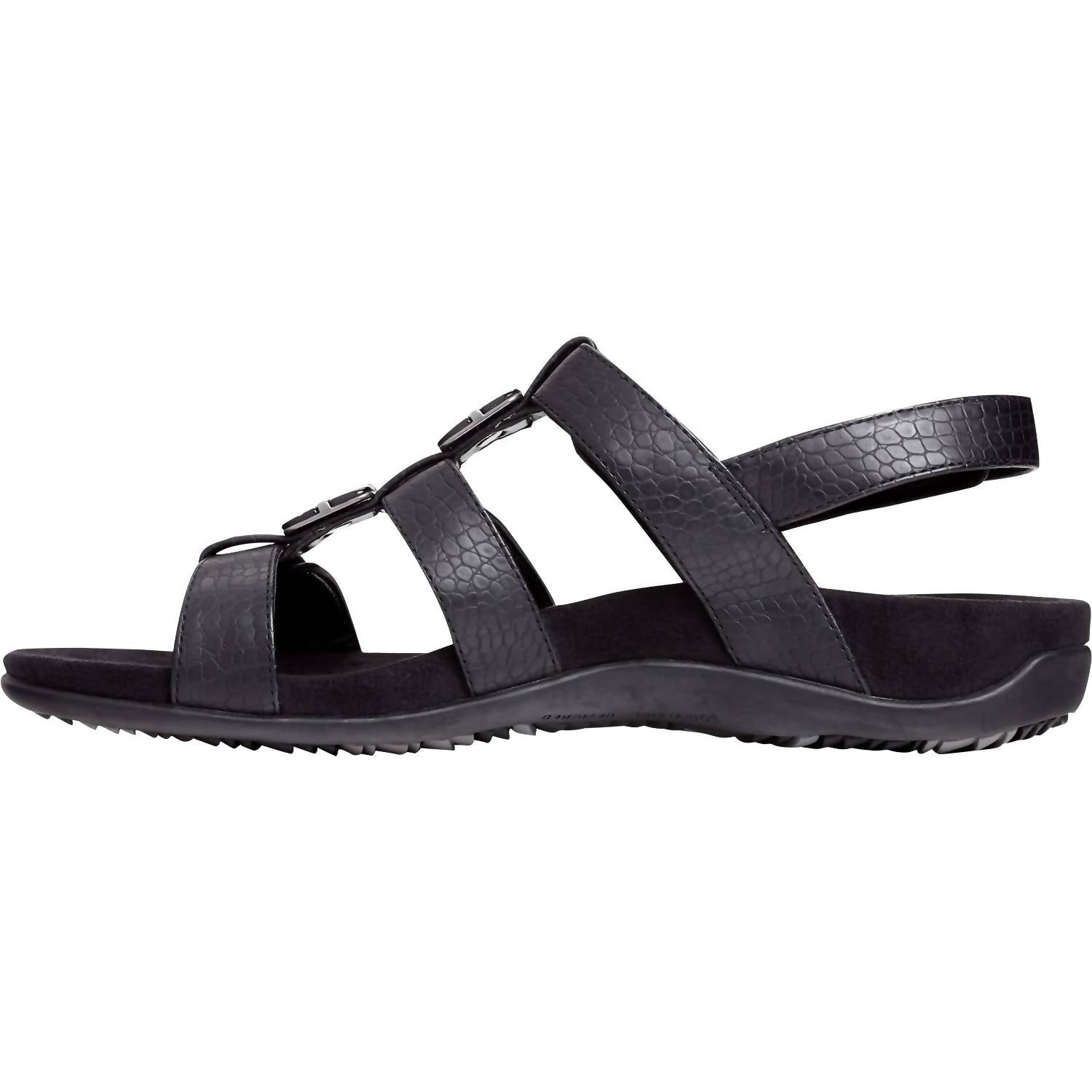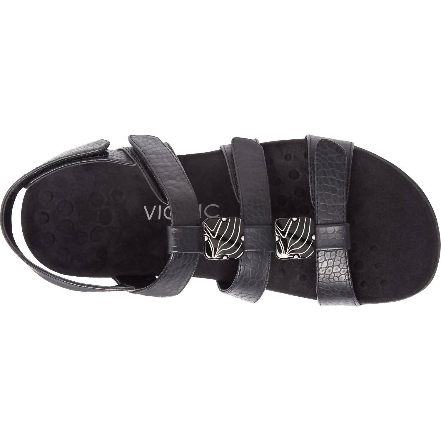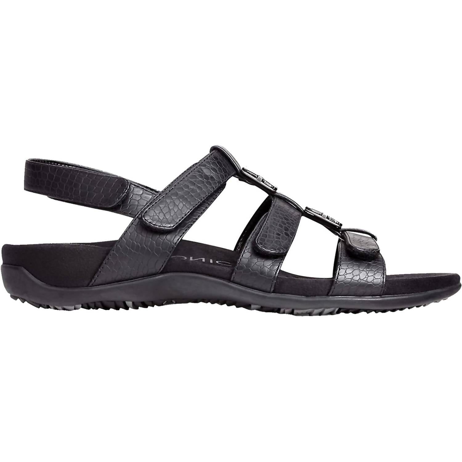 Flowy dresses, cropped pants, and even jumpsuits... this sandal works with them all! Step into style and comfort with the Vionic Women's Amber Sandals in Black Croc Synthetic. These sandals feature an open-toe design with ultimate adjustability through four hook-and-loop straps. Crafted with faux leather uppers, they come with a biomechanical orthotic footbed and a lightweight EVA midsole to support and align your feet naturally. Designed for versatile wear, they feature a durable rubber outsole for reliable traction, perfect for vacation strolls or a chic addition to your boho summer wardrobe.