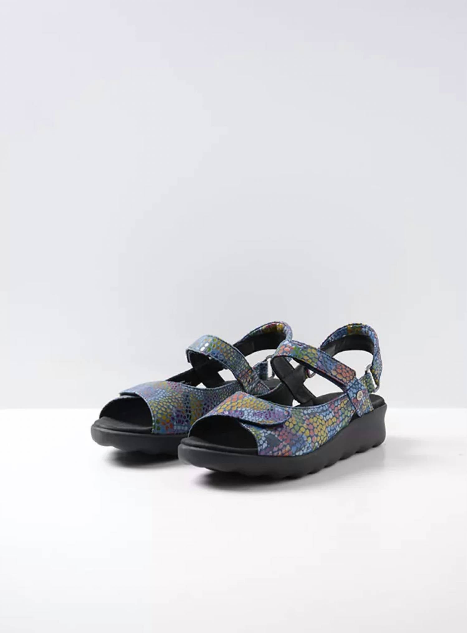 Flowy dresses, cropped pants, and even jumpsuits... this sandal works with them all! Discover the Women's Pichu Sandal by Wolky, perfect for your summer vacations with its dynamic design. In a playful Multi White Circles hue, this leather sandal features three adjustable straps for optimal support. The rippling outsole texture is crafted to follow your stride, ensuring exceptional grip, comfort, shock, and sweat absorption. It boasts a feather-light construction, ideal for outdoor activities and extended wear.