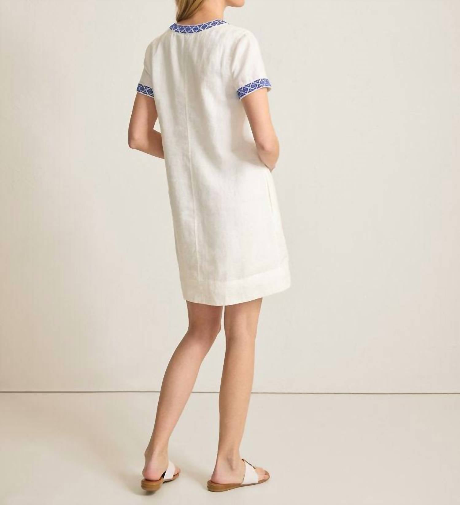 The Two Palms Coastal Tiles Print Linen Dress by Tommy Bahama effortlessly embodies chic coastal style. Designed with short sleeves and detailed with stylish blue trim, this garment is made entirely from breathable 100% linen. Measuring 35" in back length from shoulder to hem for size S, it's imported with a convenient pull-on closure and practical pockets. For care, machine wash cold with like colors using a gentle cycle, and line dry; also suitable for dry cleaning.