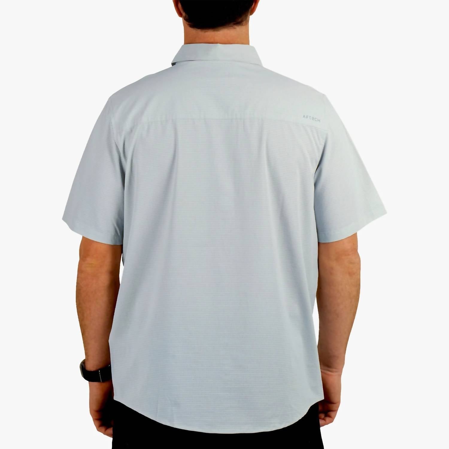 The AFTCO Air-O Mesh Short Sleeve Button Down Shirt in Quiet Tide is crafted for ultimate breathability and comfort, ideal for hot and humid days. Featuring a solid pattern and made from Air-O mesh stretch woven fabric composed of 88% polyester and 12% spandex, this shirt offers UPF 40 protection and antimicrobial properties. Designed with short sleeves and a performance fit, it includes double chest snap pockets and a hidden lens cleaner at the hem for added functionality. Closure Type: Button closure. Care: Machine wash and tumble dry.