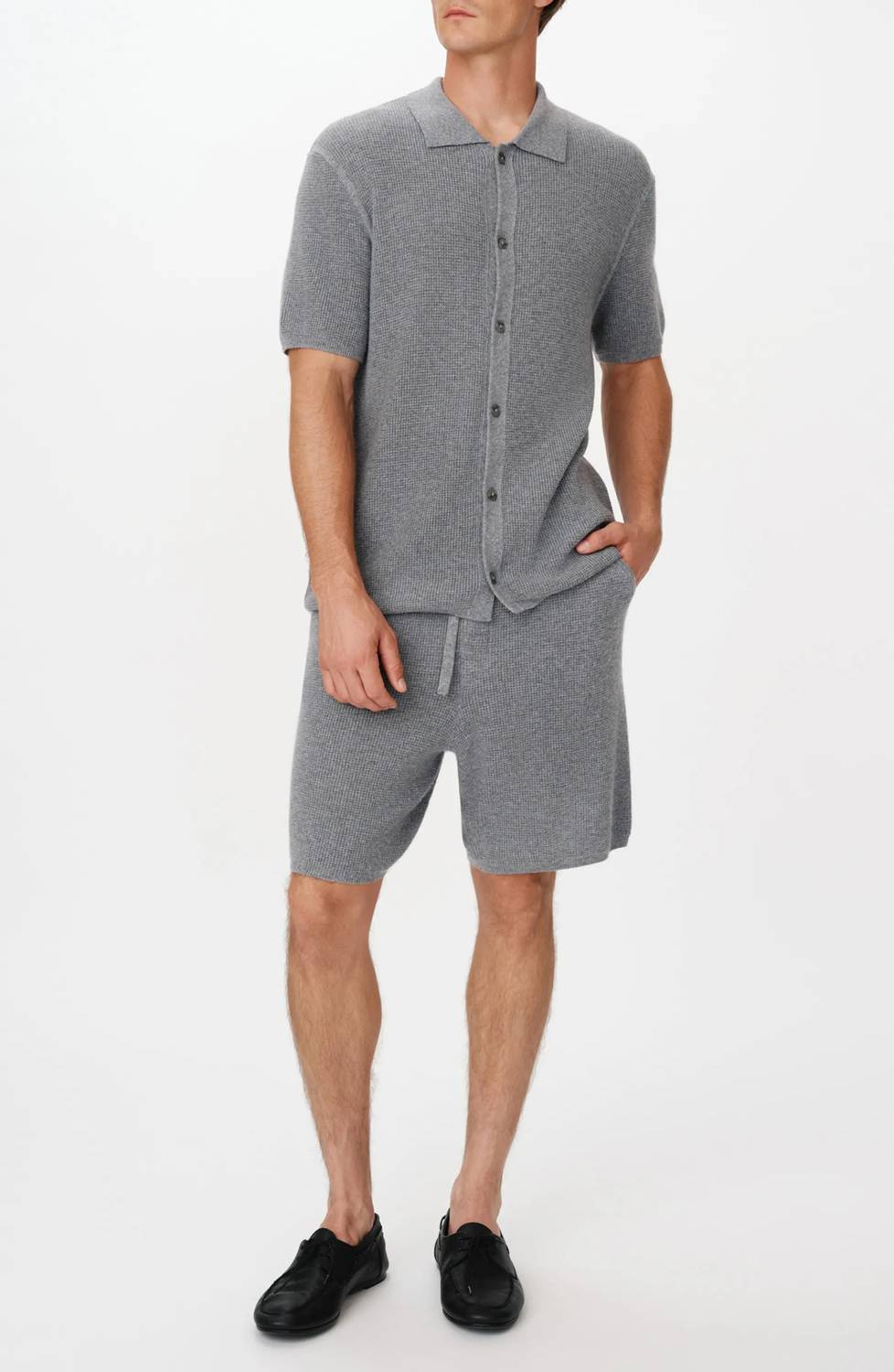 Enhance your comfort with the ATM Merino Cotton Cashmere Blend Waffle Short, perfect for effortless style in Heather Grey. These shorts, crafted from a breathable blend of 33% viscose, 23% nylon, 20% wool, 20% cotton, and 4% cashmere, boast a textured knit fabric with handy side welt pockets and a back patch pocket for convenience. They feature a pull-on closure with an elastic and drawstring waist, a 7.5" inseam, 24.5" leg opening, and 13.5" front rise for a comfortable fit. Care instructions: Dry clean only.