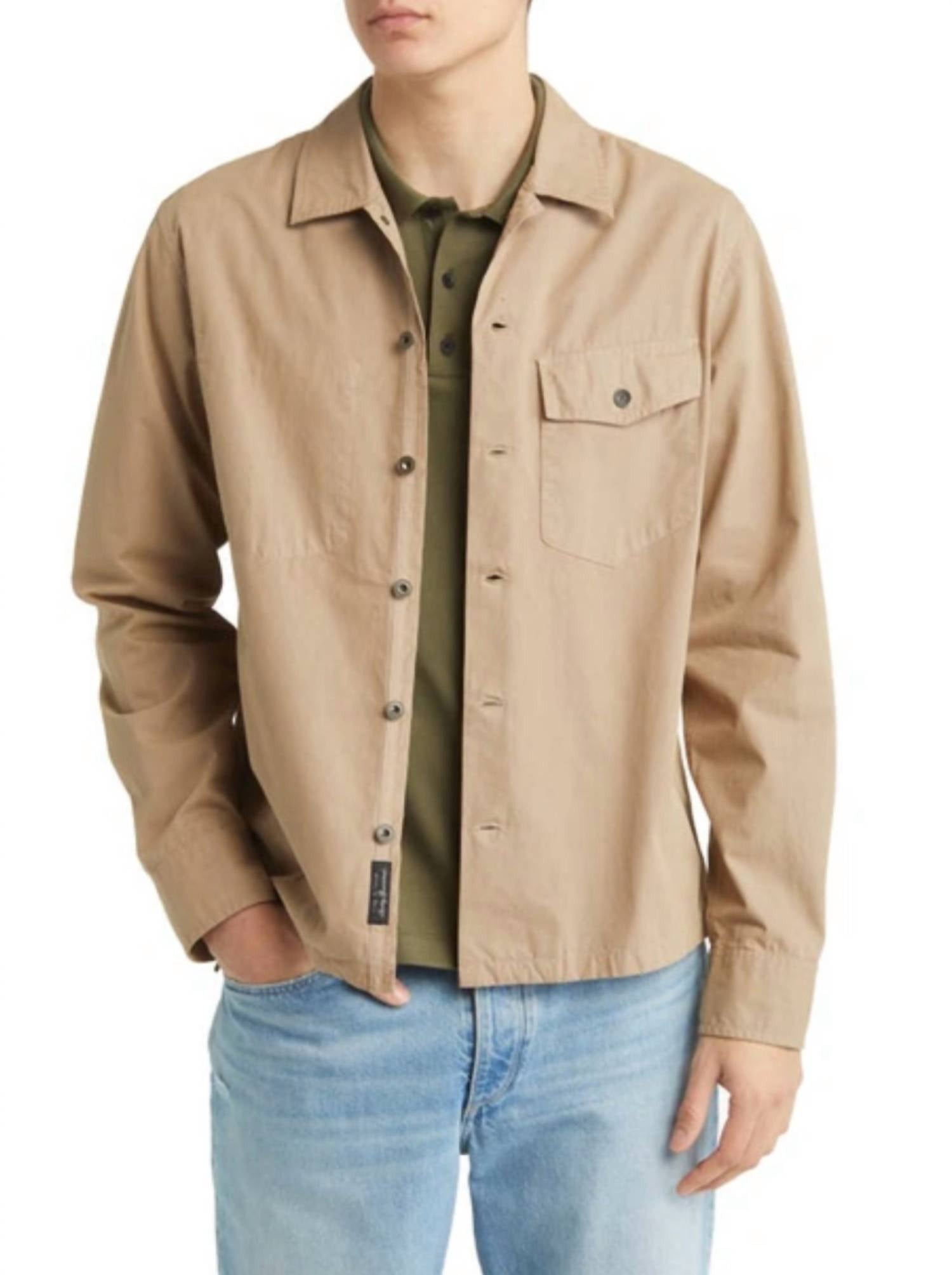 The Rag & Bone Greige Long Sleeve Stanton Shirt Jacket offers a perfect blend of style and versatility with a suede-like texture, thanks to its peached cotton fabric. Designed for men, this beige lightweight shirt jacket comes in a solid pattern, complete with a classic collar neckline and practical pockets. Featuring a convenient button closure, it's ideal for travel and workwear outfits during the fall season.