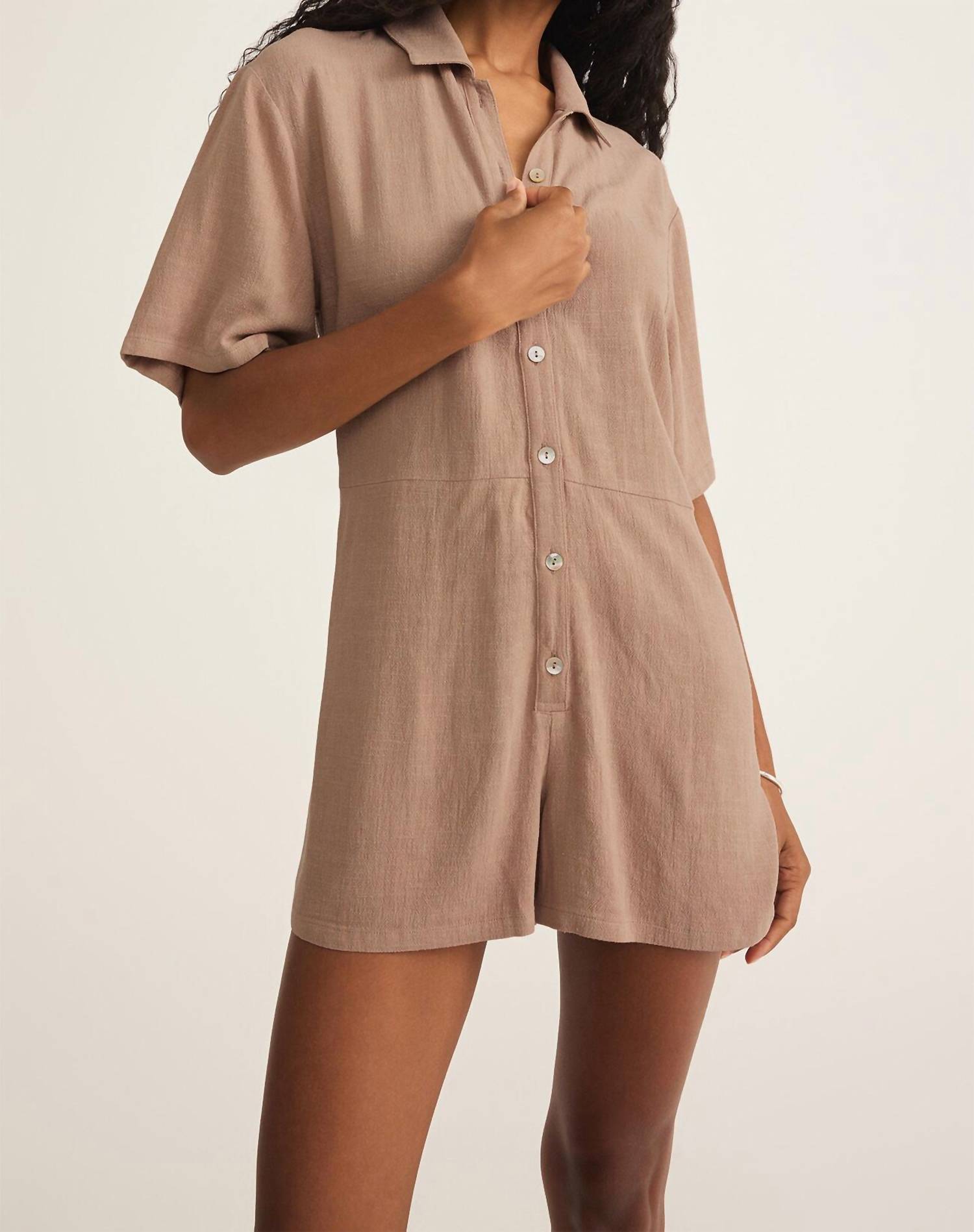 Elevate your summer wardrobe with the Marcell Romper by Z Supply, an effortless choice in a serene Sea Salt hue. This women’s jumpsuit features a button closure and is crafted from a luxurious blend of 86% Rayon and 14% Linen, ensuring comfort and breathability. Adjustable back tabs offer a customizable fit, with a relaxed silhouette and fully lined shorts adding to its appeal. Model is 5′9.5″ wearing size S. Bust: 36", Waist: 34 1/2", Inseam Length: 2 1/2".