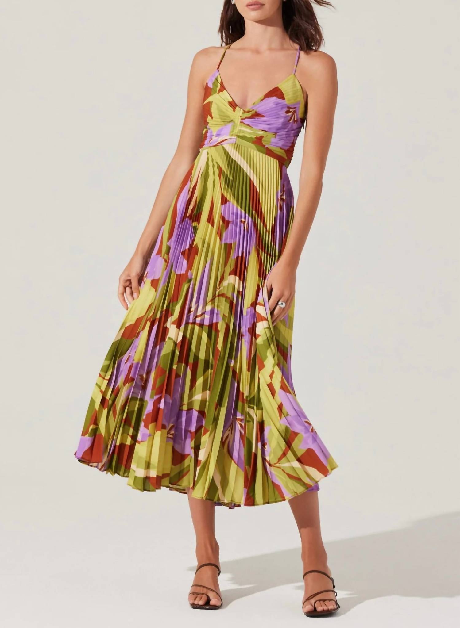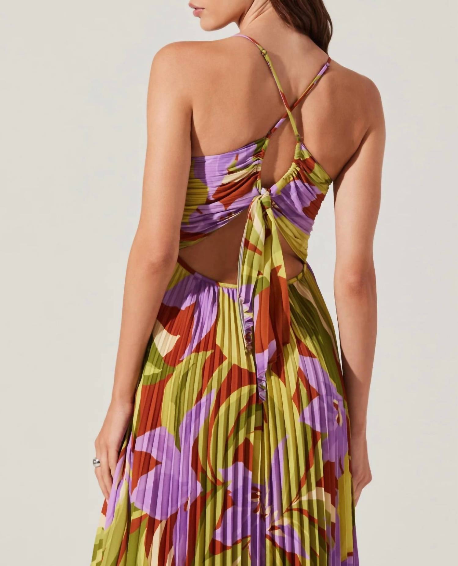 The ASTR Blythe Floral Plisse Midi Dress in vibrant Green Rust Floral is a spaghetti strap masterpiece designed for summer. Crafted from 100% polyester, it features a flattering fit and flare silhouette with a stylish strappy cutout back and tie strap details. The concealed side zipper closure ensures a seamless fit, while the partially lined interior enhances comfort. Easy to maintain with machine wash care instructions, it's perfect for vacation and special occasions.