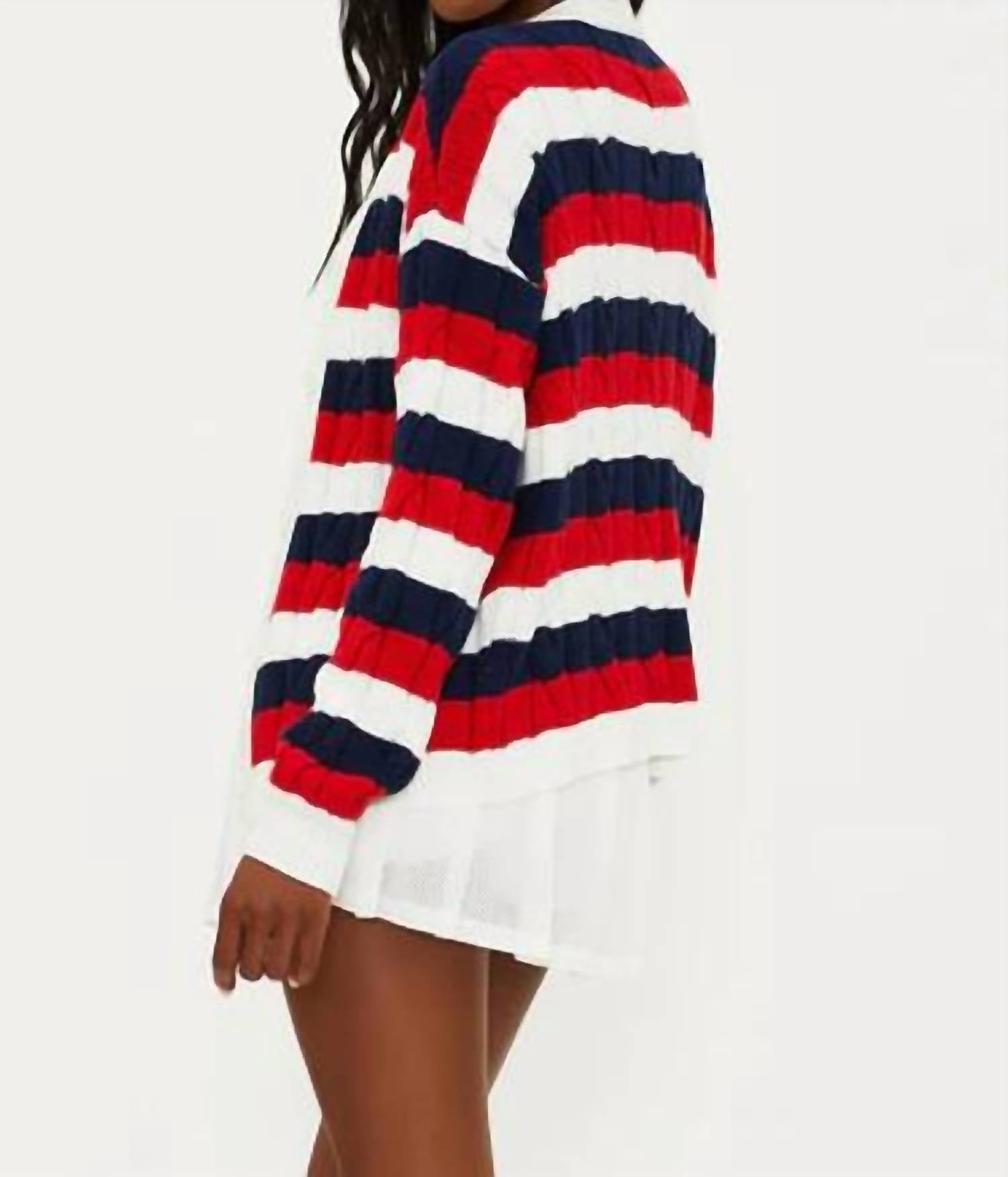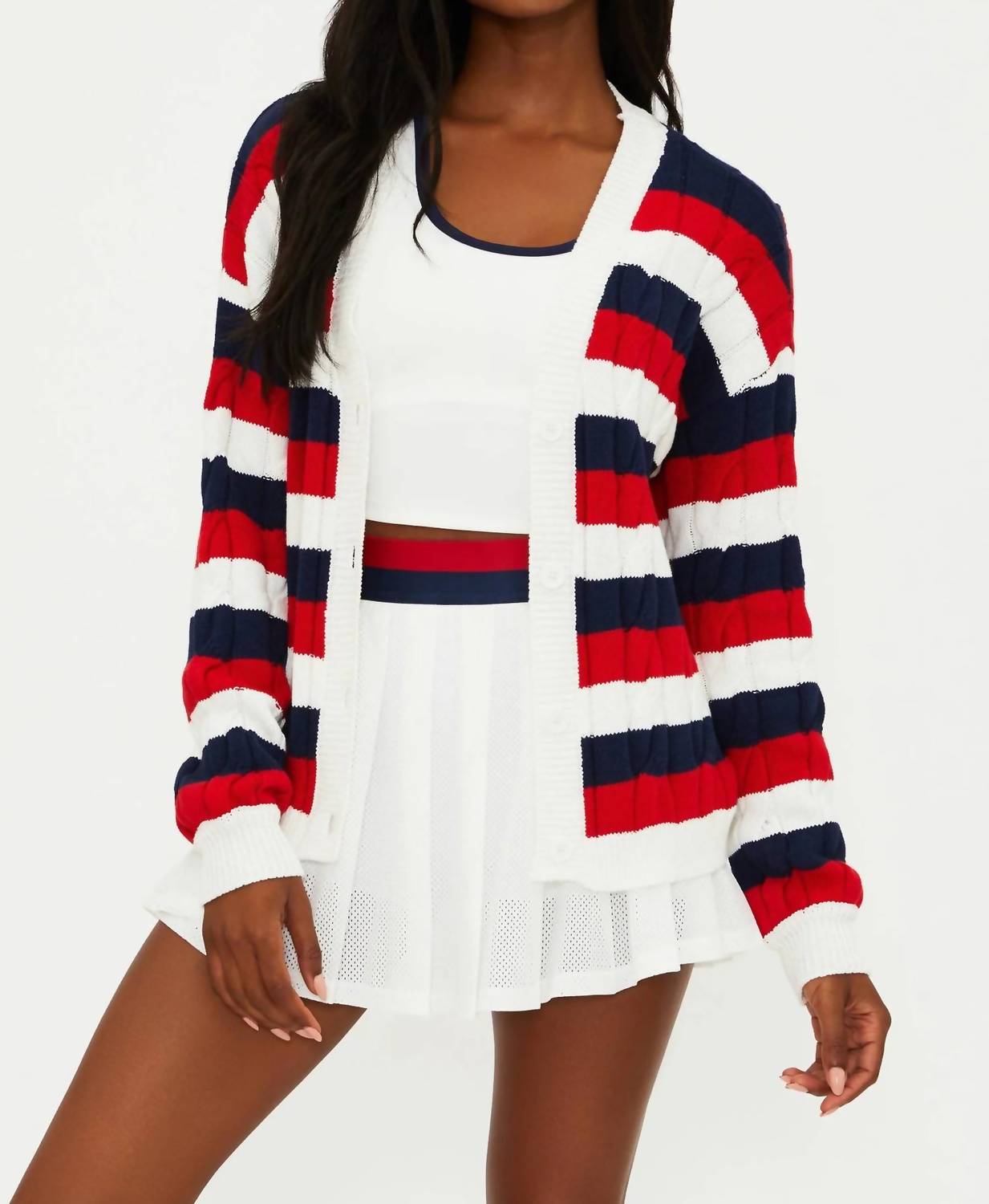 Enhance your wardrobe with the Sherry Striped Cardigan by Beach Riot, an essential piece for those preppy fall travels. This long sleeve design offers a cozy cable knit texture crafted entirely from 100% cotton and features a classic crewneck. Cherry-indigo stripes bring a vibrant twist to the cardigan. Closure is via a pull-on style. Care for this piece by machine washing and laying flat to dry.