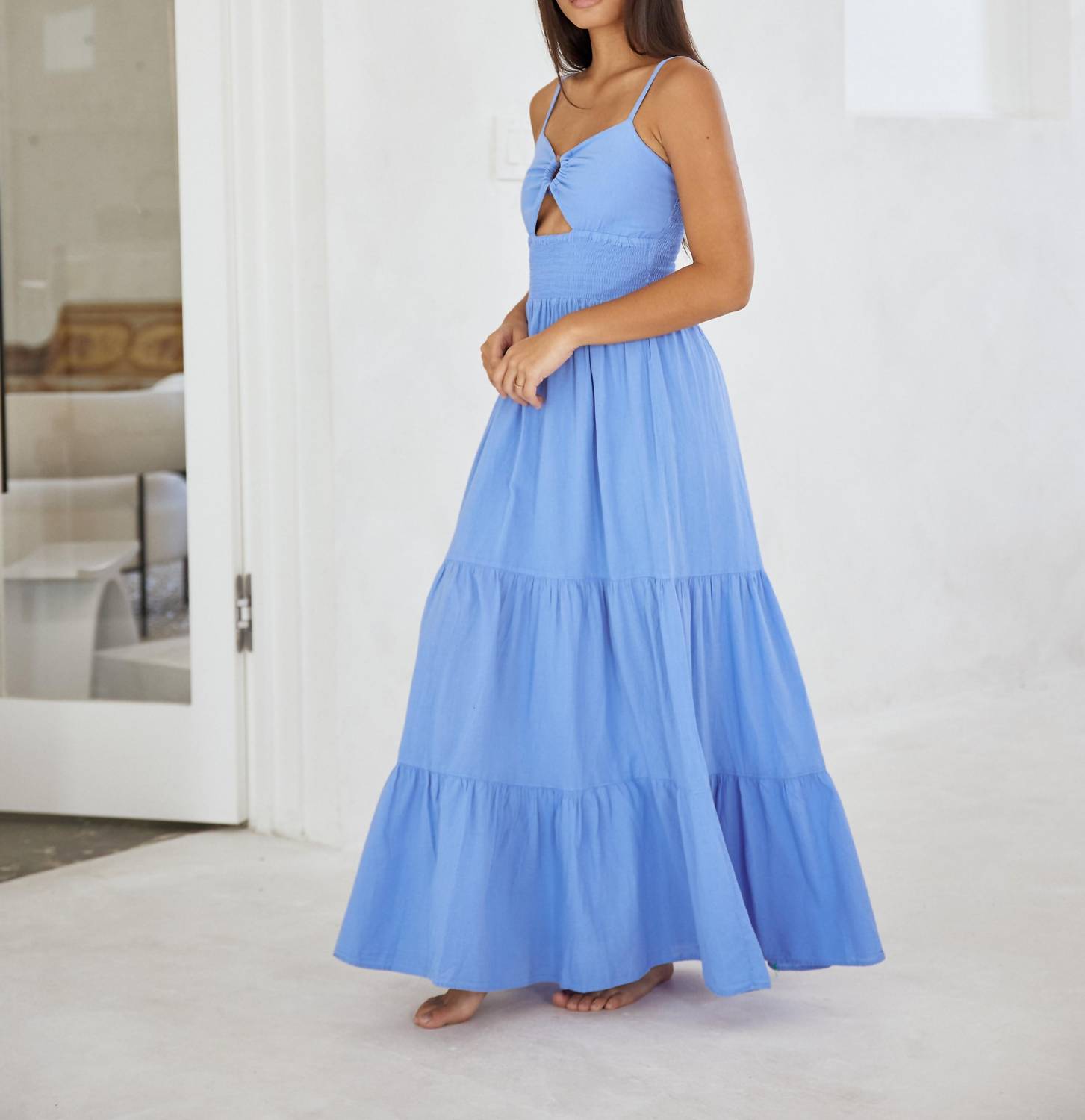 A maxi dress that is just as cute as it is comfortable. Introducing the Nayla Keyhole Maxi Dress by Blanco BY NATURE featuring delicate spaghetti straps, crafted from 100% cotton for comfort and breathability, extending to a luxurious maxi length. Designed with a pull-on closure, it showcases a ring at the center bust, adjustable straps, cutout detail, an elastic waist, and a ruched trimming detail on the skirt for a flattering fit. Care instructions recommend machine washing cold with like colors, avoiding bleach, and hanging to dry.