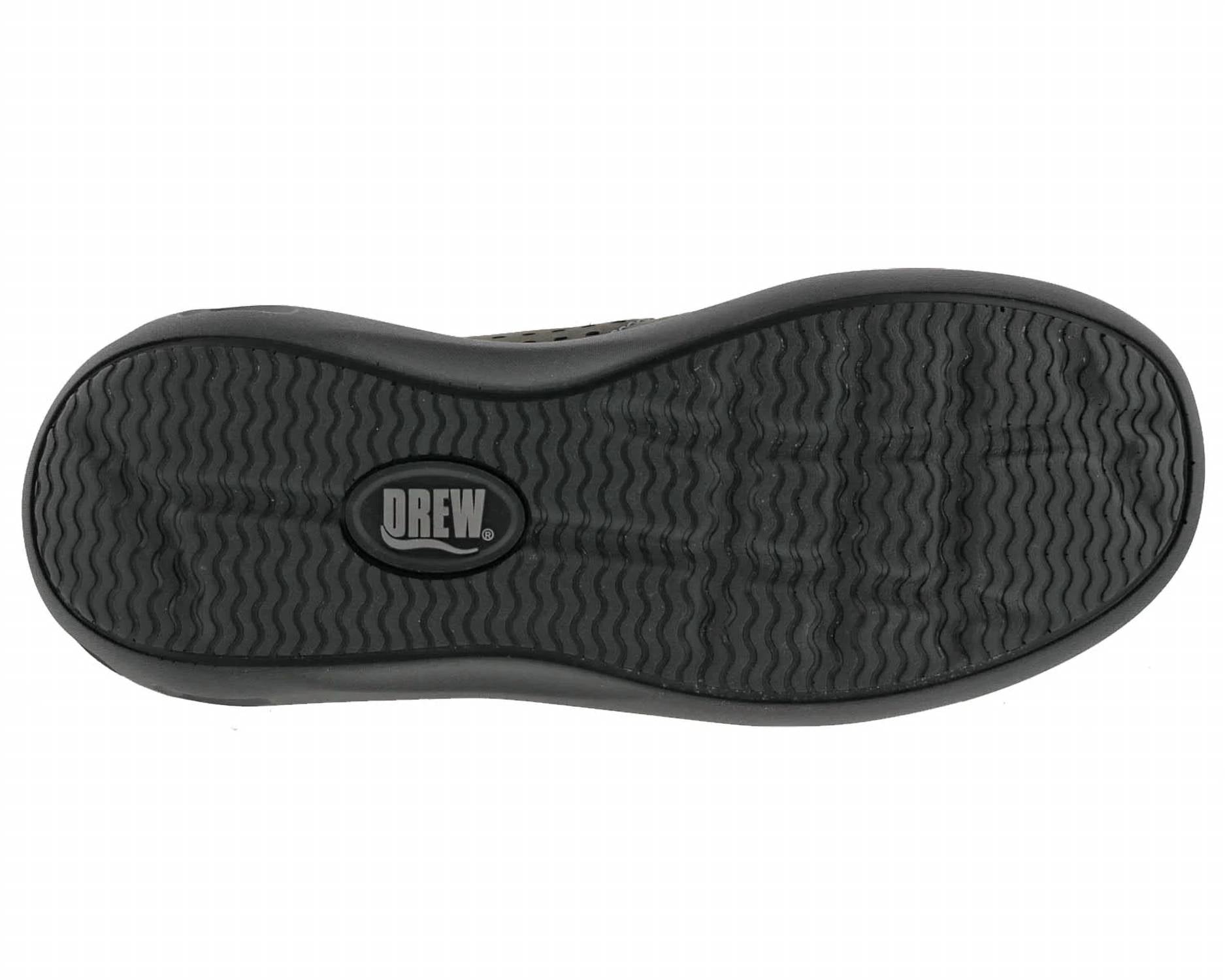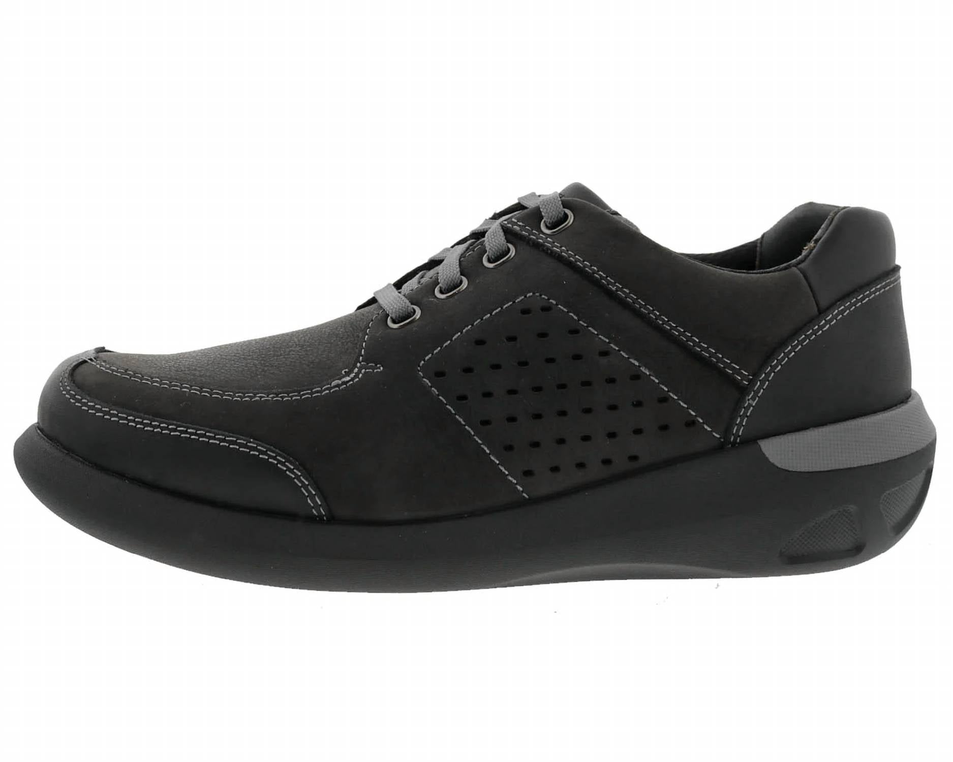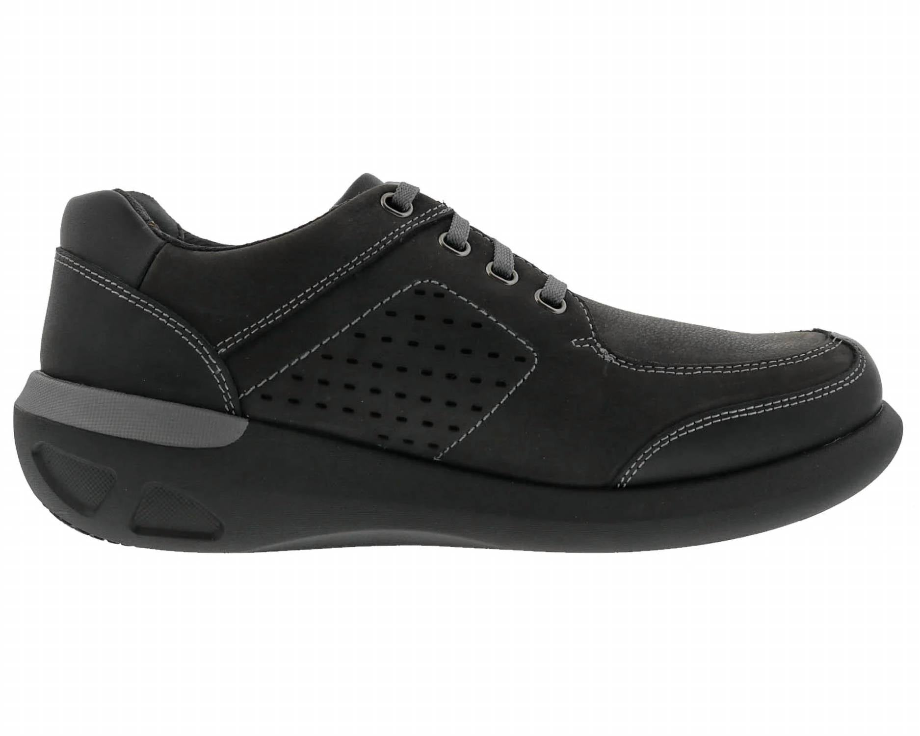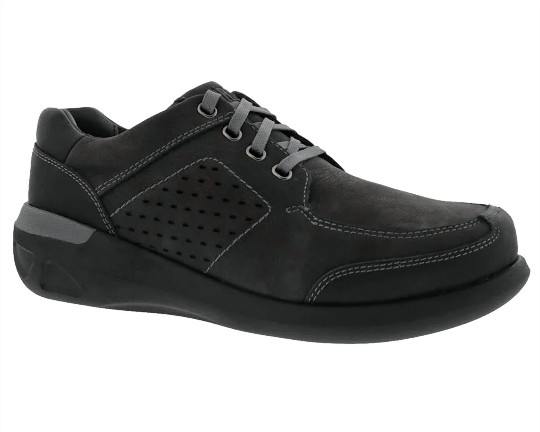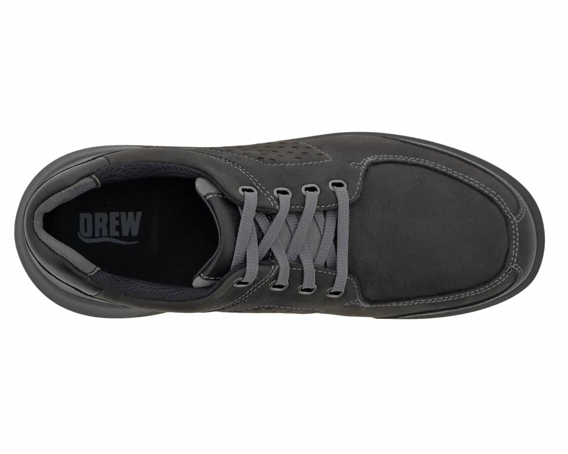 Introducing the Men's Miles Casual Shoes by Drew Shoes, where comfort meets unassuming casual style. These sneakers in black nubuck feature a 2" heel with a polyurethane outsole designed with a rocker bottom for enhanced stability. The Drilex lining provides moisture-control for all-day comfort, while the padded tongue and collar ensure a snug fit. Benefit from Drew's Plus Fitting System® with two removable footbeds, shock-absorbing Walkright Technology, and a tempered steel shank for targeted support. Ideal for accommodating prescribed orthotics and promoting foot health, these shoes are a versatile addition to your wardrobe.