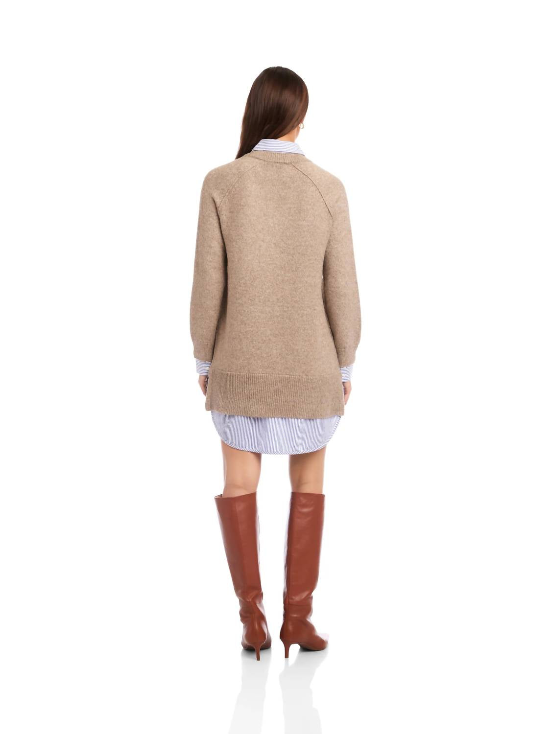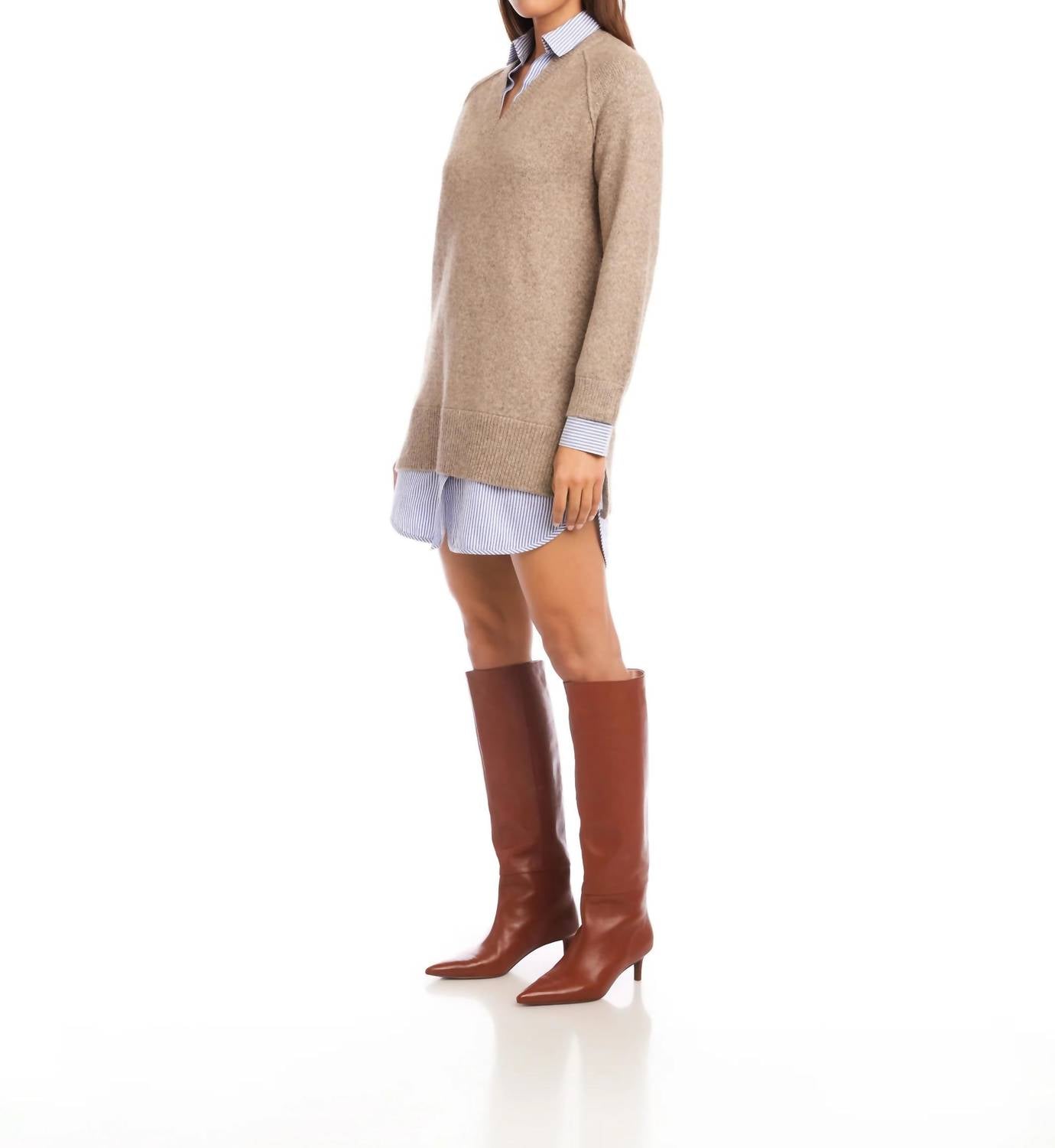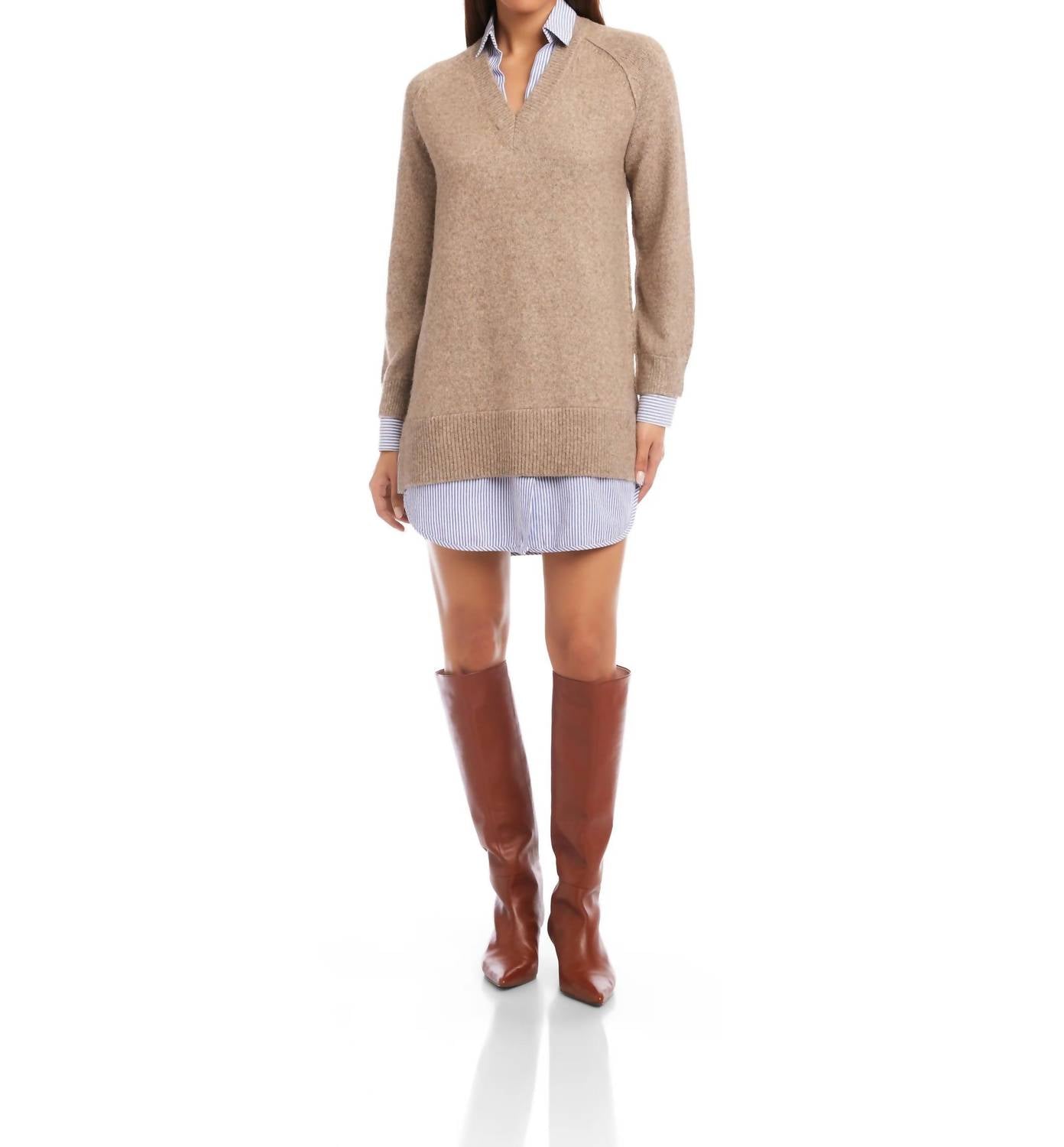 Introducing the Carrie Mixed Media Dress by Fifteen Twenty, a minimalist masterpiece perfect for a summer vacation. This shirt silhouette dress features long sleeves and showcases a unique combination of a classic collared shirt-dress base with a soft sweater overlay, complete with a V-neckline and ribbed trims. Its thoughtfully designed composition includes a sweater made of 74% polyester, 10% acrylic, 10% nylon, and 6% wool, with a woven layer of 100% cotton, in a trendy wheat hue. The dress measures 29 1/2 inches in length and is designed with a convenient pull-on closure. Care: Hand wash cold, lay flat to dry or dry clean. Imported.