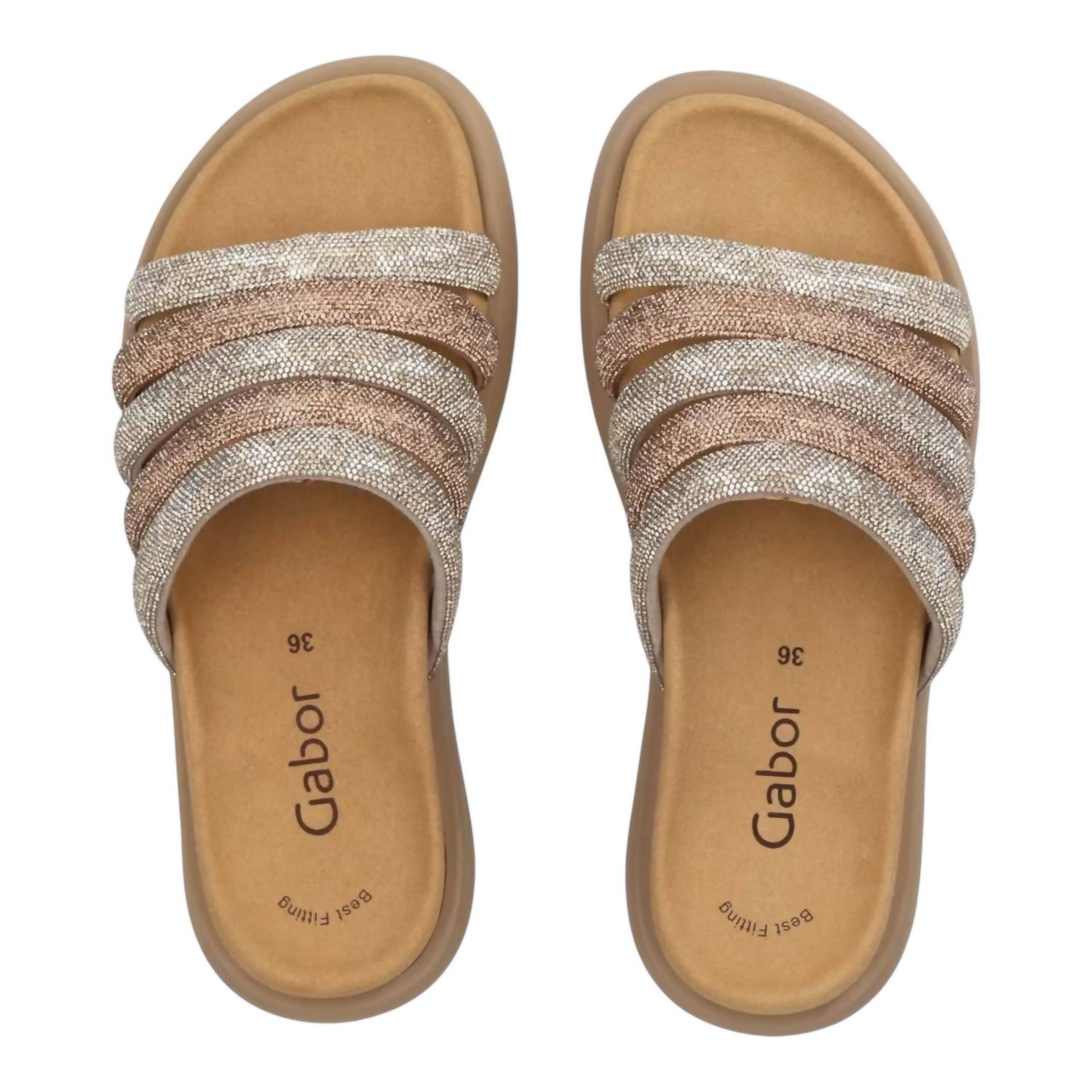 Flowy dresses, cropped pants, and even jumpsuits... this sandal works with them all! Step into effortless style with the Women's Abbott Metallic Slide by Gabor, a perfect blend of comfort and chic in Gold Combi. These sandals showcase a lightweight, slip-on design with a sparkle finish, complemented by an imitation leather upper and leather lining. The manmade sole is slip-resistant, ensuring safety with every step, while the heel stands at a practical height of 3.5cm.