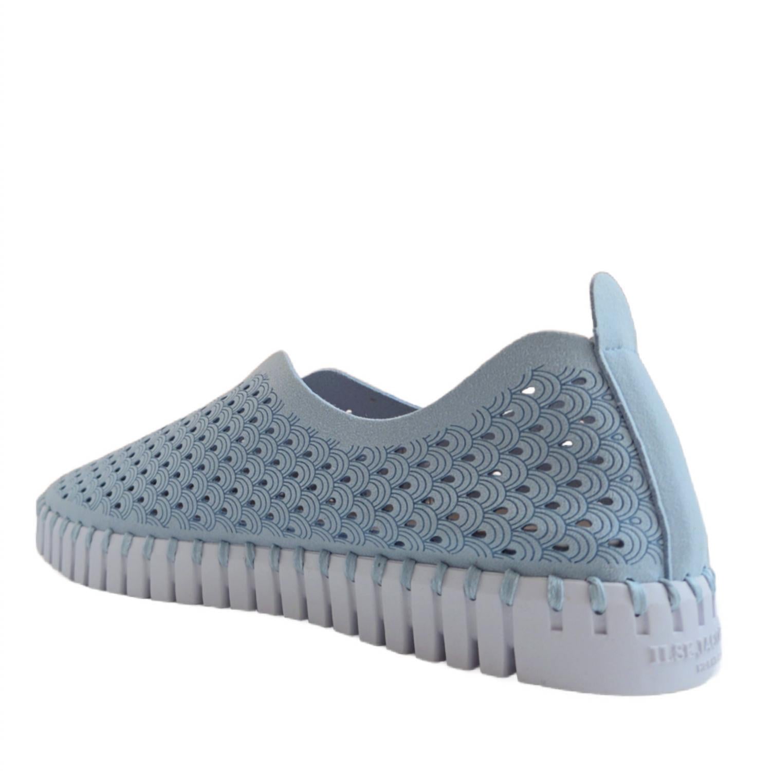 Pair these with a cozy robe and we call this loungewear luxe. Experience the perfect blend of style and comfort with the Ilse Jacobsen Women's Tulip 139 Shoe in Ash Blue. These slippers, inspired by maximalist trends, feature a sustainable recycled microfiber upper and a natural and recycled rubber outsole. With a round toe shape and a flat heel, they'll ensure superior comfort for travel or spring outings. The lined pig suede insole and padded support make every step a pleasure.