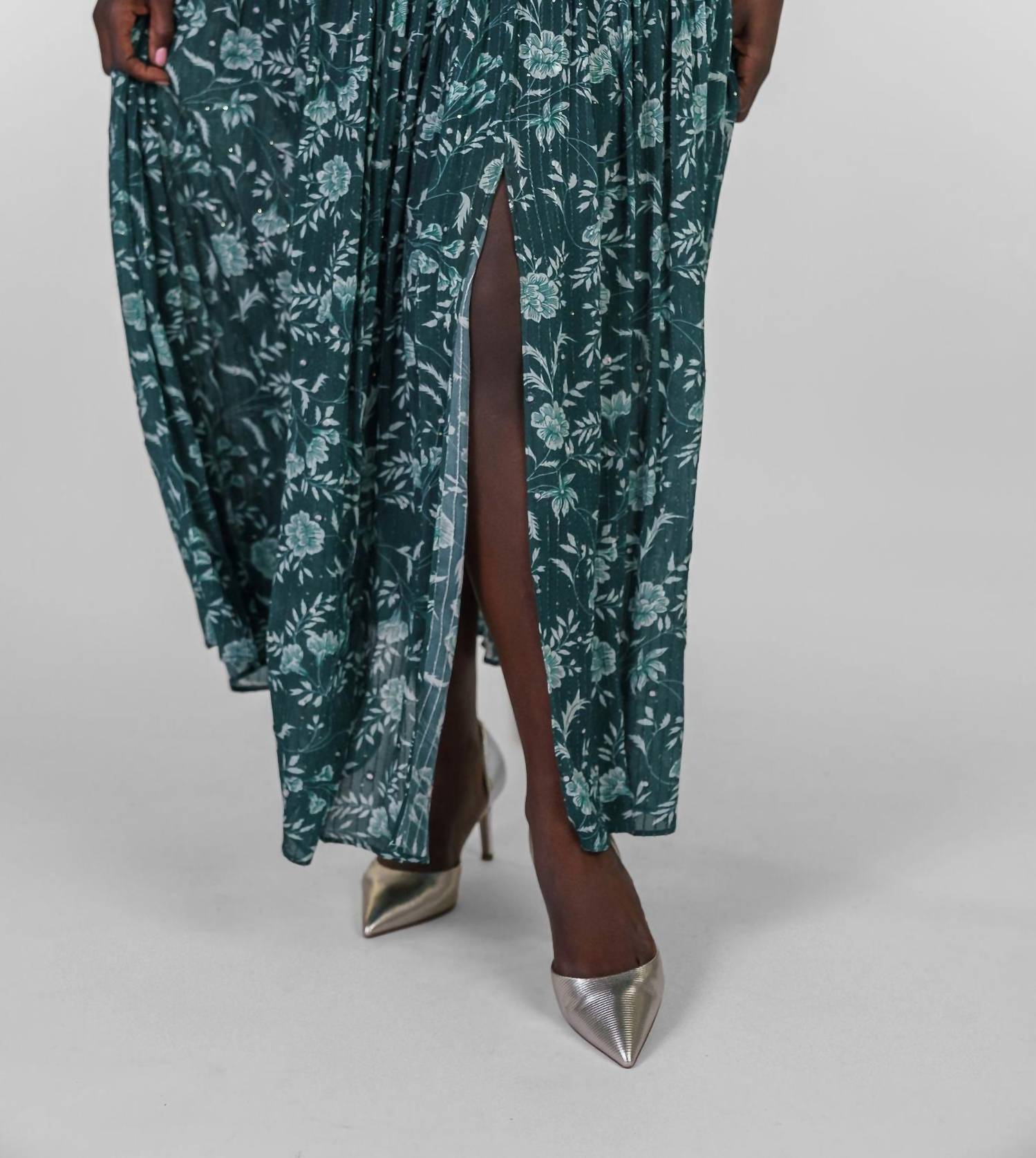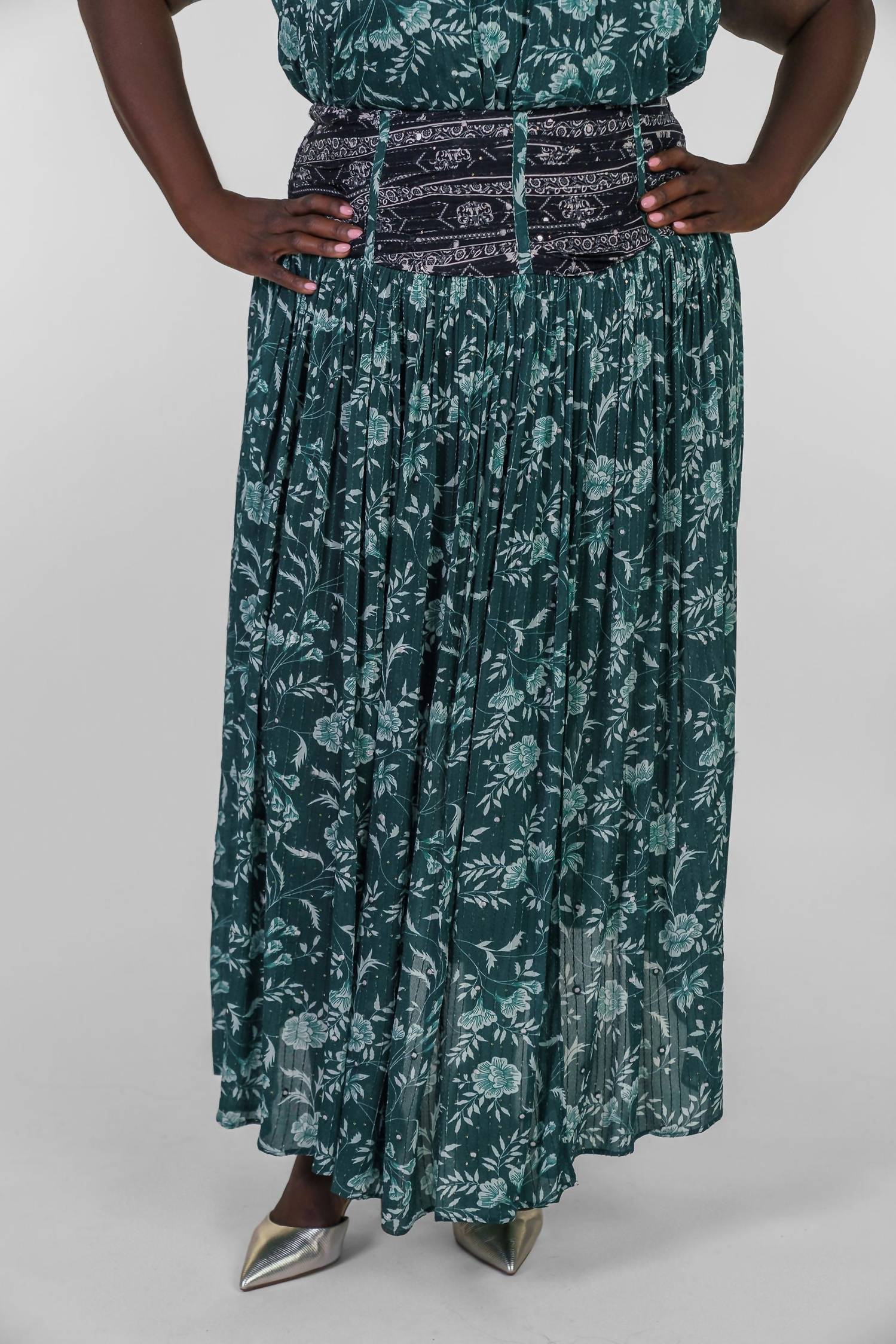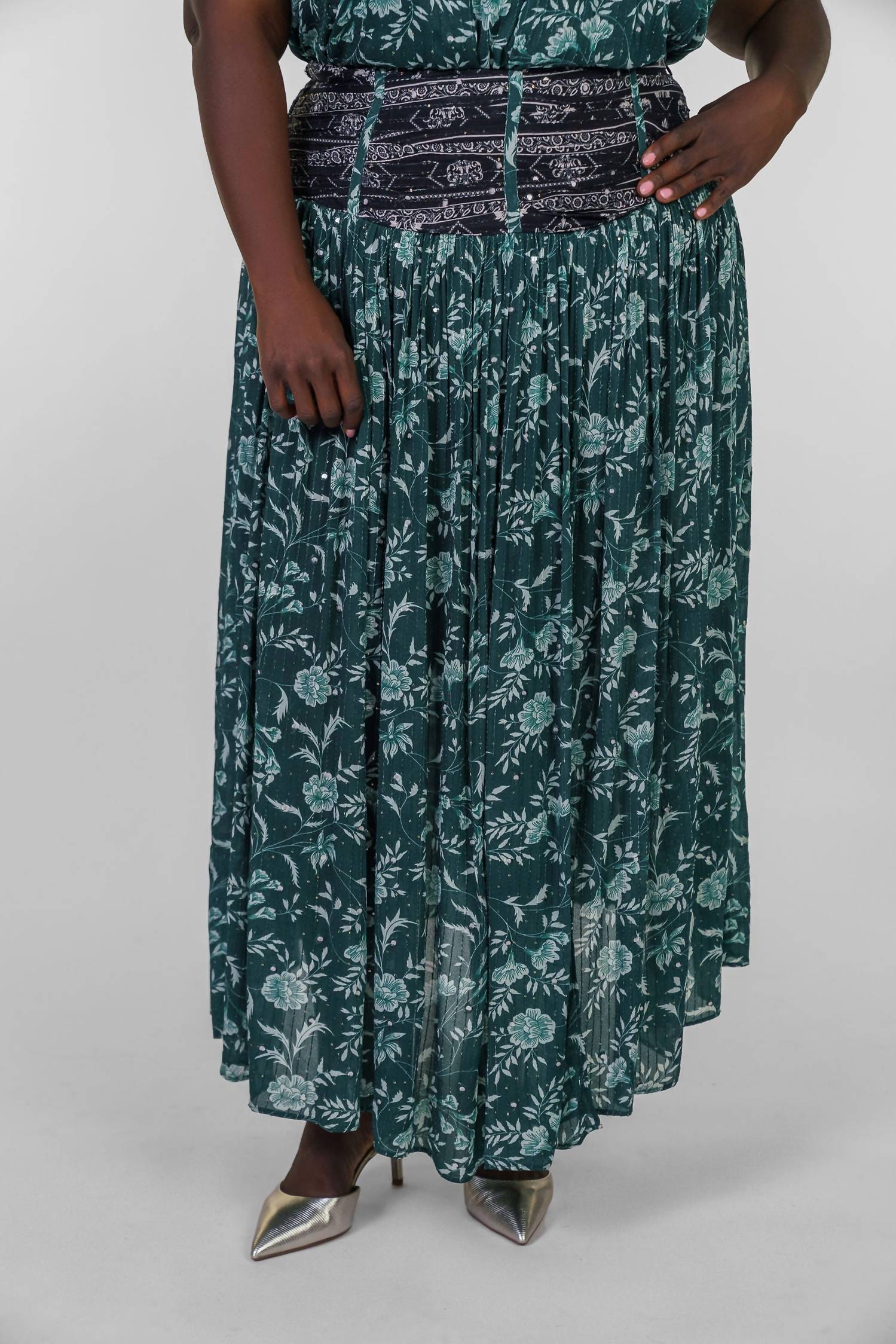 Presenting the Metallic Black Green Folk Tribe Skirt by Just Bellina, an alluring plus-size piece ideal for summer vacations or minimalist-themed events. This floral-patterned maxi skirt features a double-layered mesh construction with a flattering elastic waist, ensuring comfort and style with a pull-on closure. Care instructions: Machine wash.