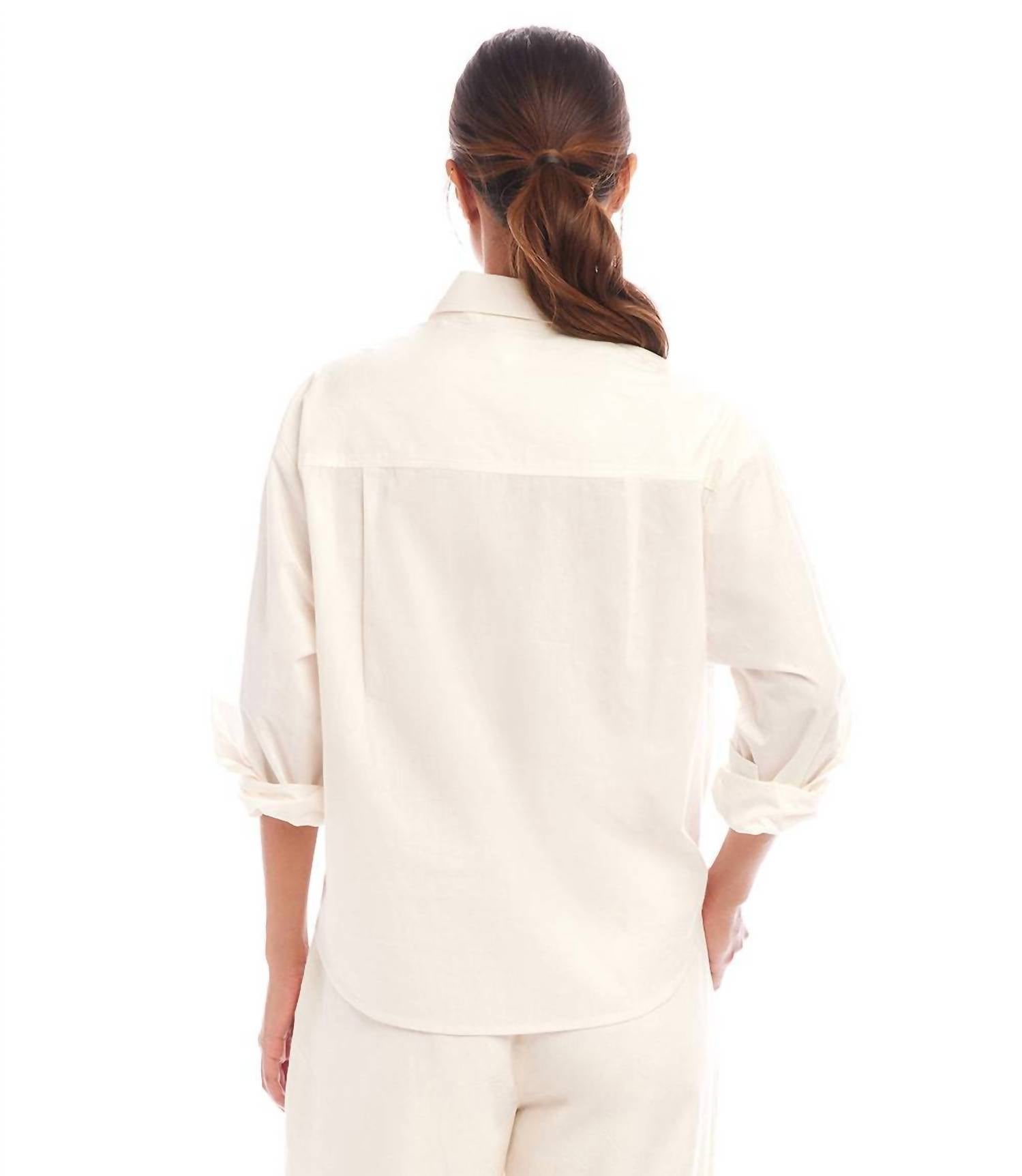 Introducing the Long Sleeve Tie-Front Top by Karen Kane, an ecru essential for every closet. The long-sleeve design offers a relaxed fit and features a tie front hem for a casually polished look. Made from 100% cotton, this imported top is equipped with practical large front flap pockets. It boasts a collared button front closure and measures 32 3/8 inches in length for a size M. Care instructions include hand wash cold and line dry or dry clean.