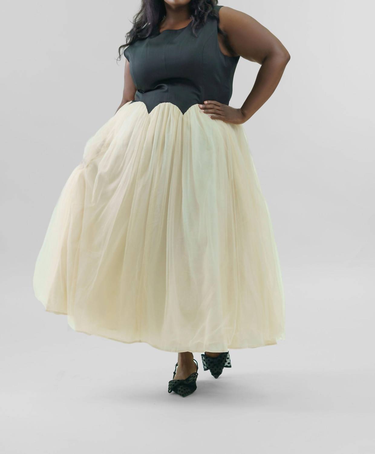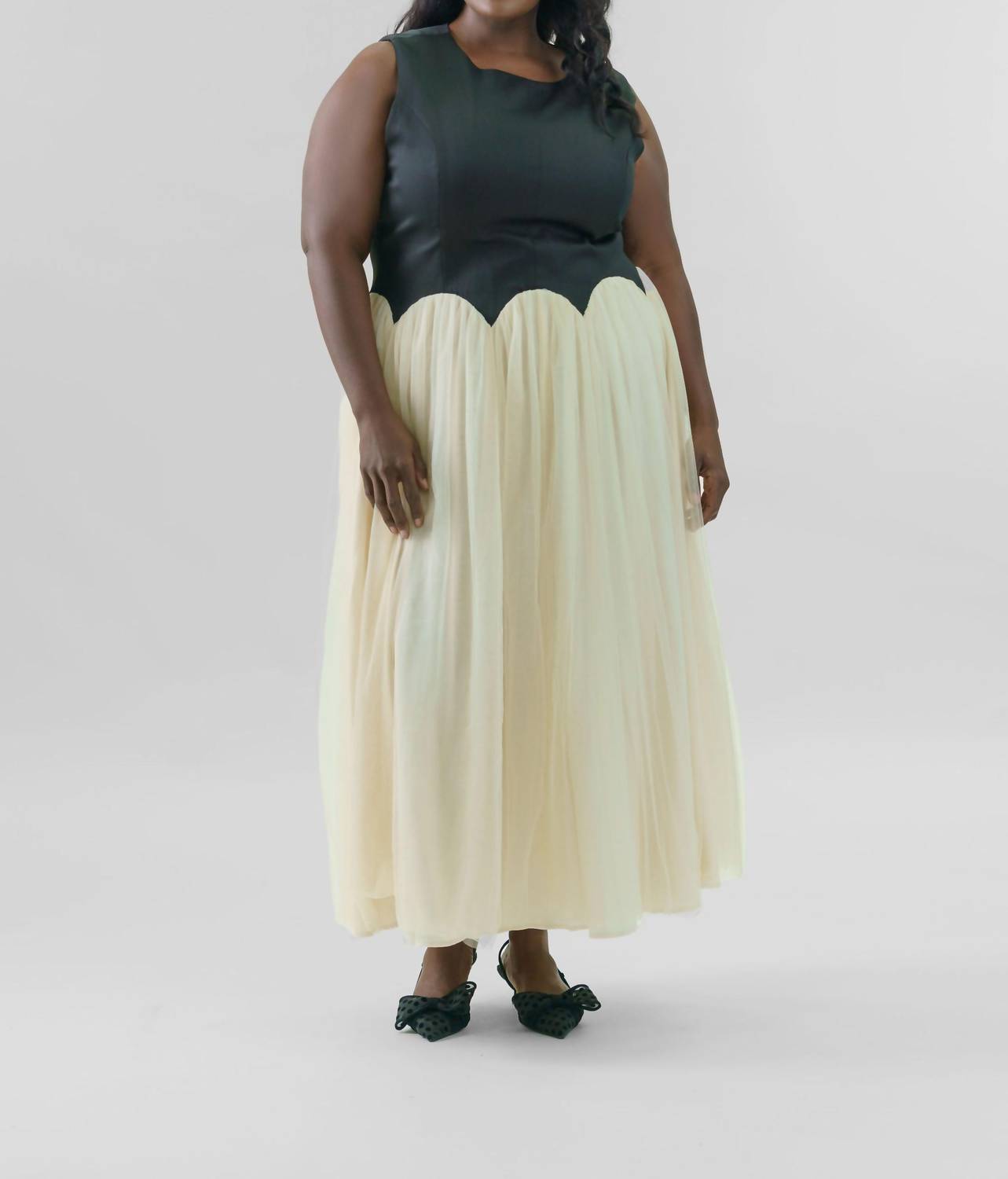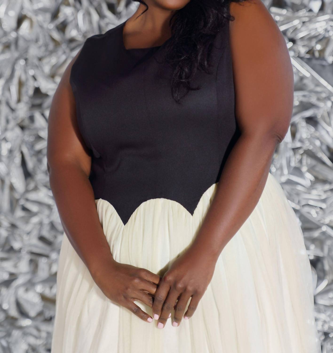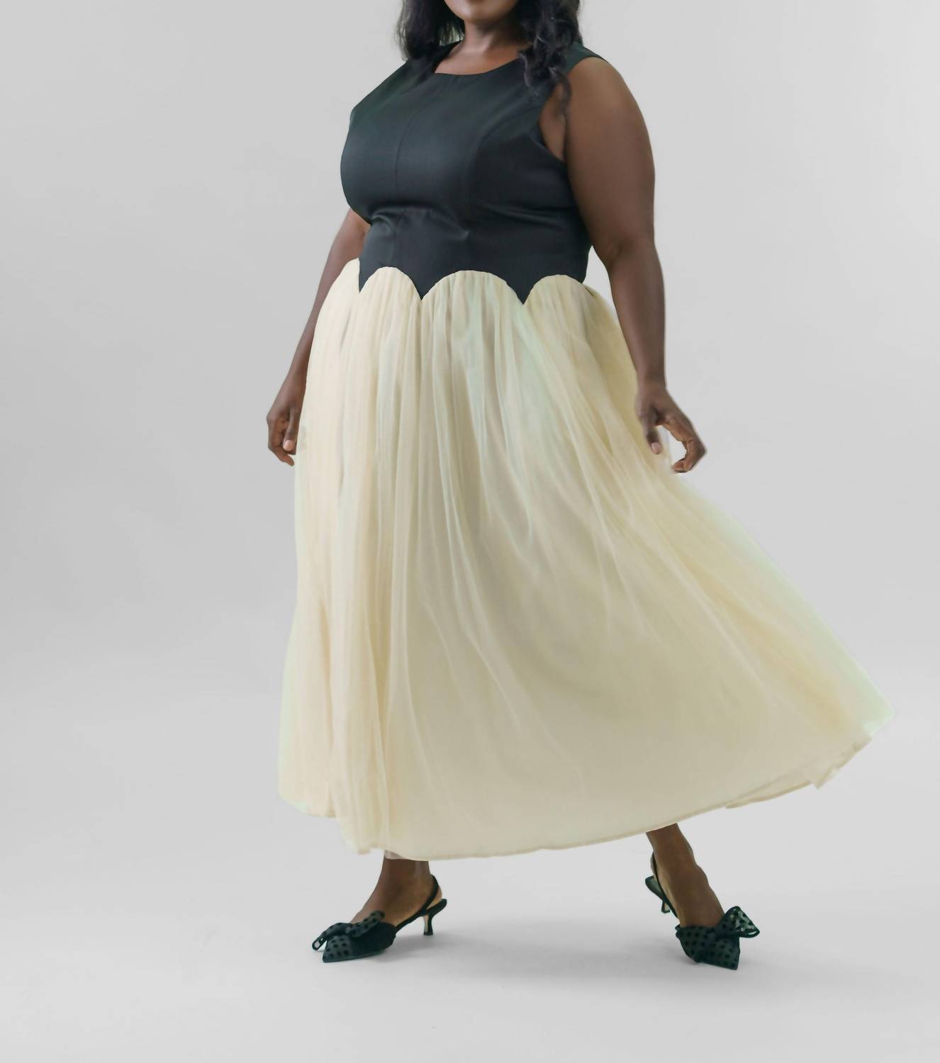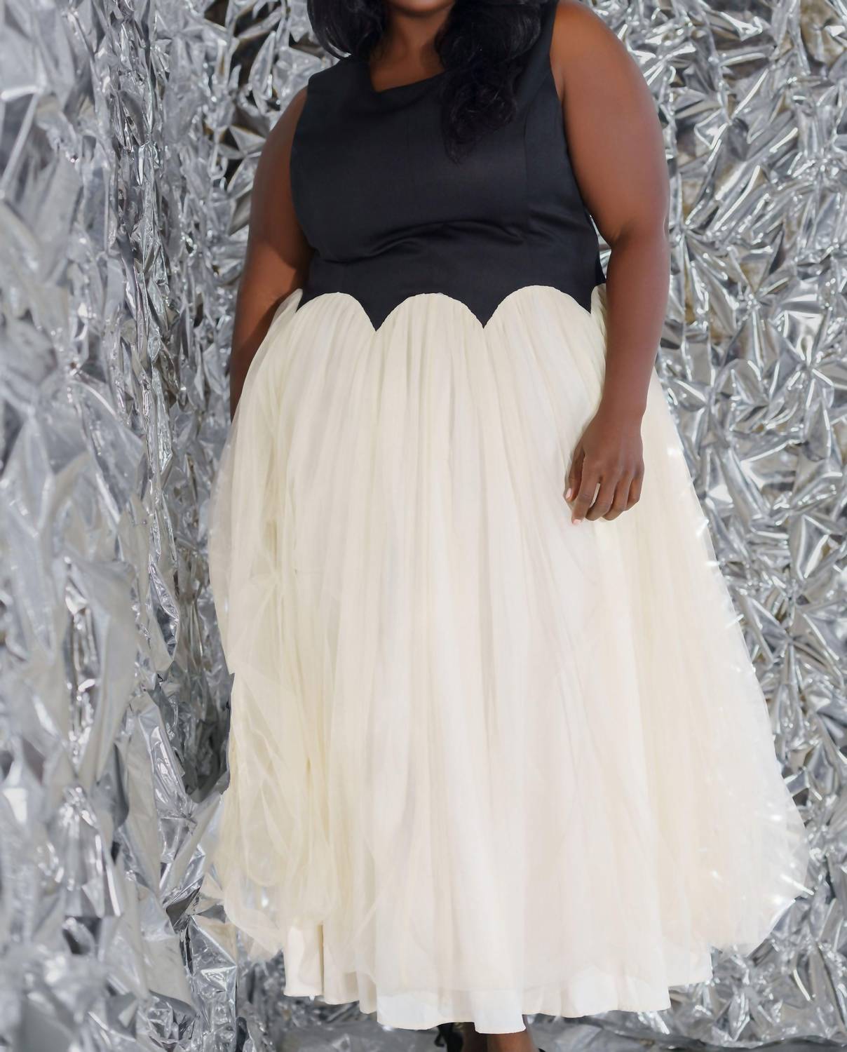 A midi dress so versatile, your options for wearing it are endless. Introducing the Monika Midi Dress by Never Fully Dressed, a stunning blend of elegance and sophistication in black and cream. This sleeveless dress features a panelled corset-style top that cinches the waist, complemented by a scoop neckline and an A-line silhouette that drapes into a pleated tulle mesh skirt. Crafted from 40% Cotton, 60% Polyester with a solid pattern, it secures with a zip closure. For care, hand wash and lay flat to dry.