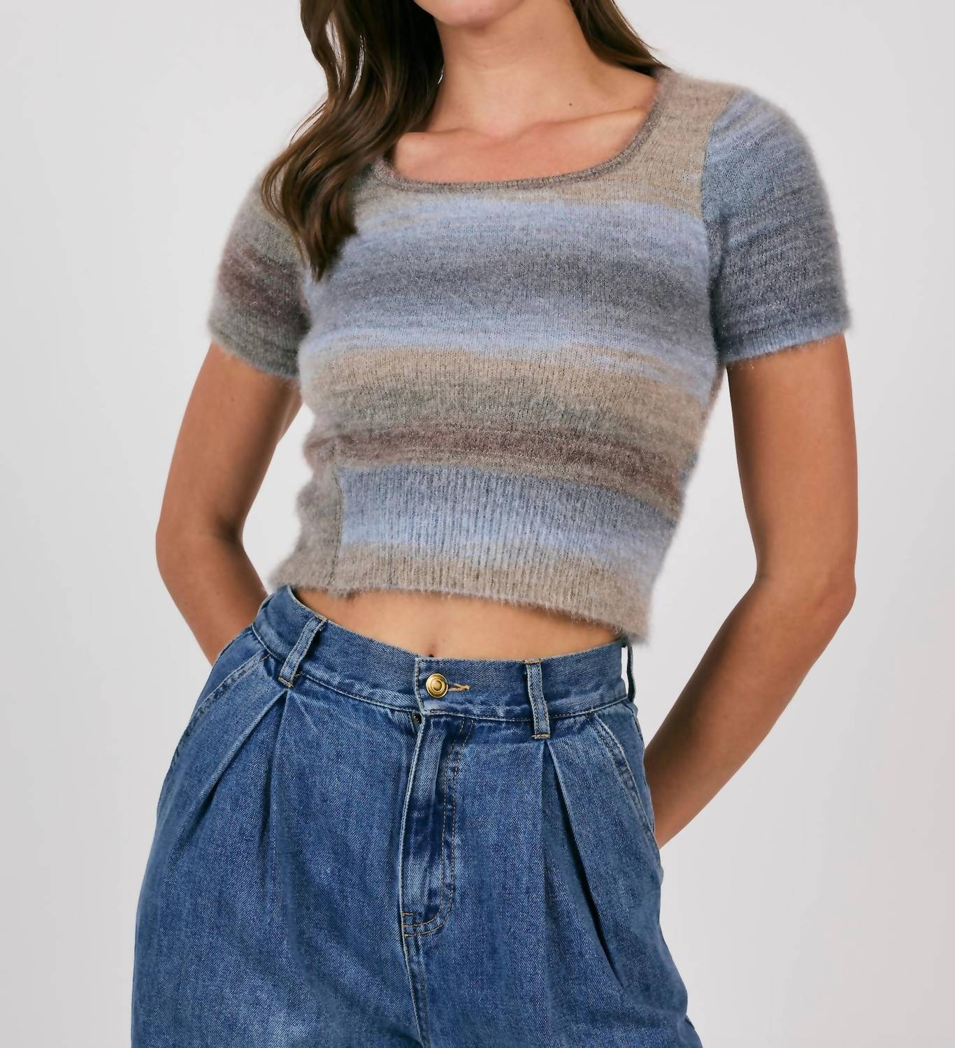 Pair this crop top with your favorite high-waisted jeans or maxi skirt. Embrace bold style with the Boulder Cropped Sweater Top from SAGE THE LABEL in a striking Blue Multi stripe pattern. This women's crop top features short sleeves and a chic squareneck, crafted entirely from 100% polyester for a comfortable fit. Enjoy an effortless pull-on closure that makes dressing a breeze. Perfect for casual outings, add this versatile piece to your wardrobe today.