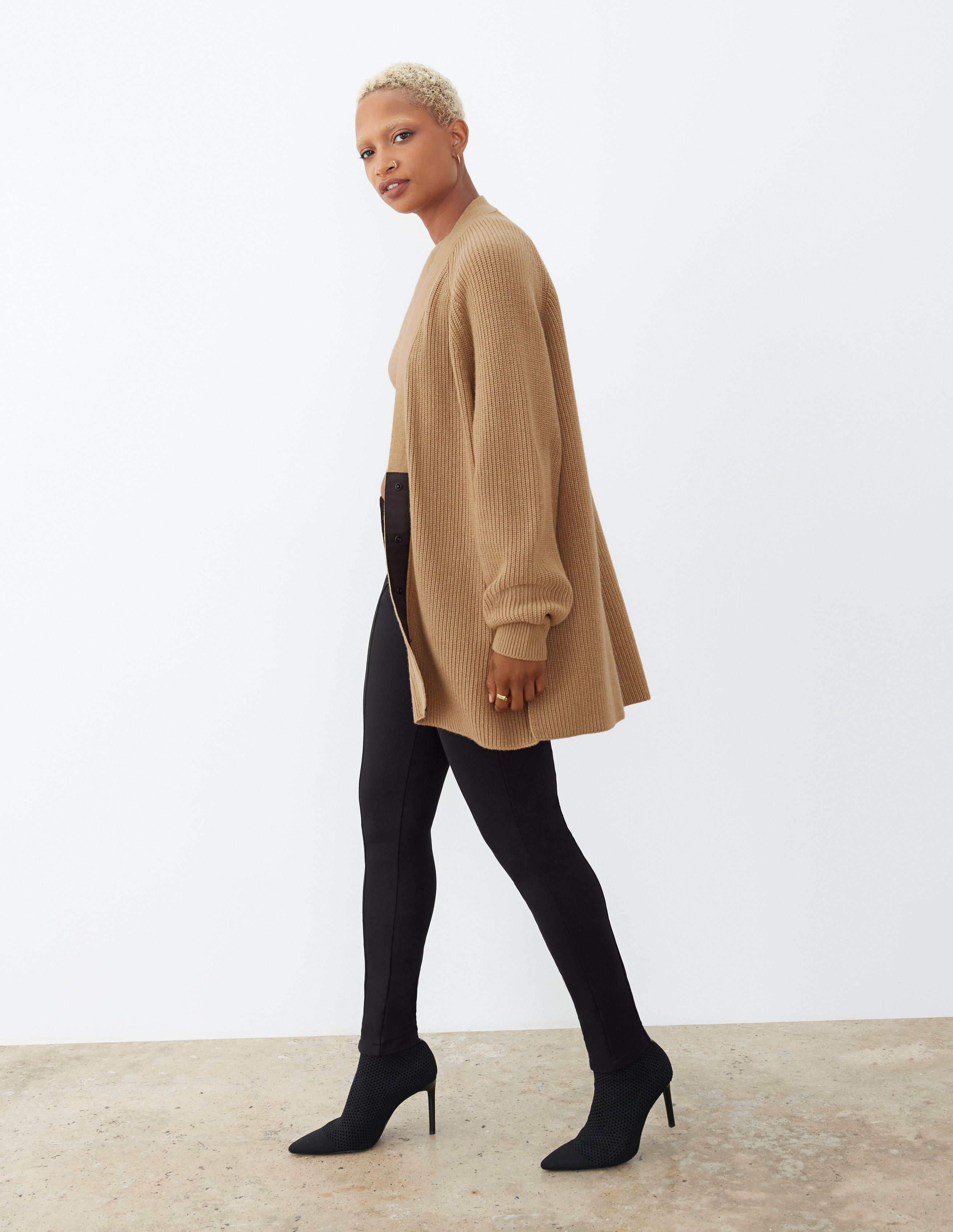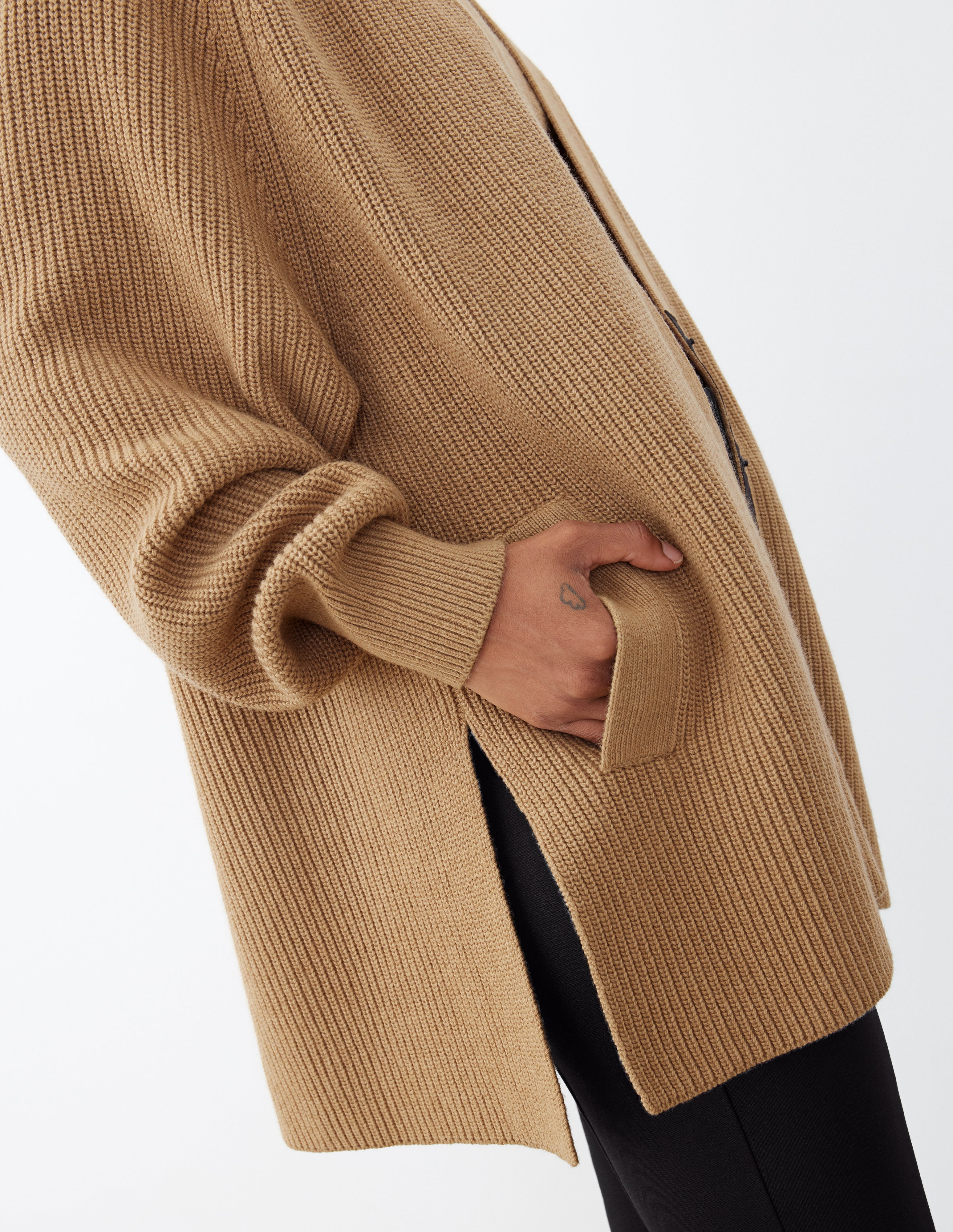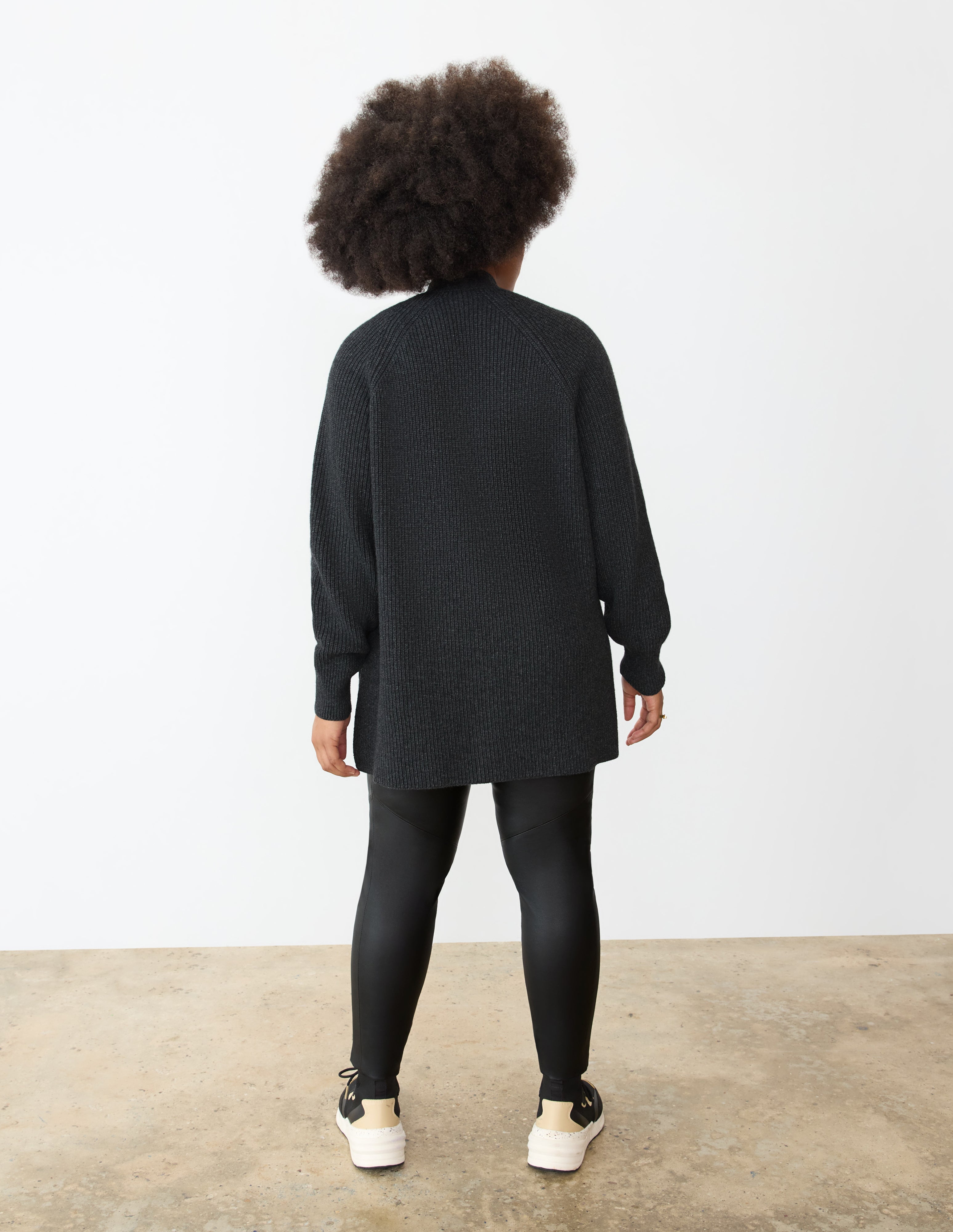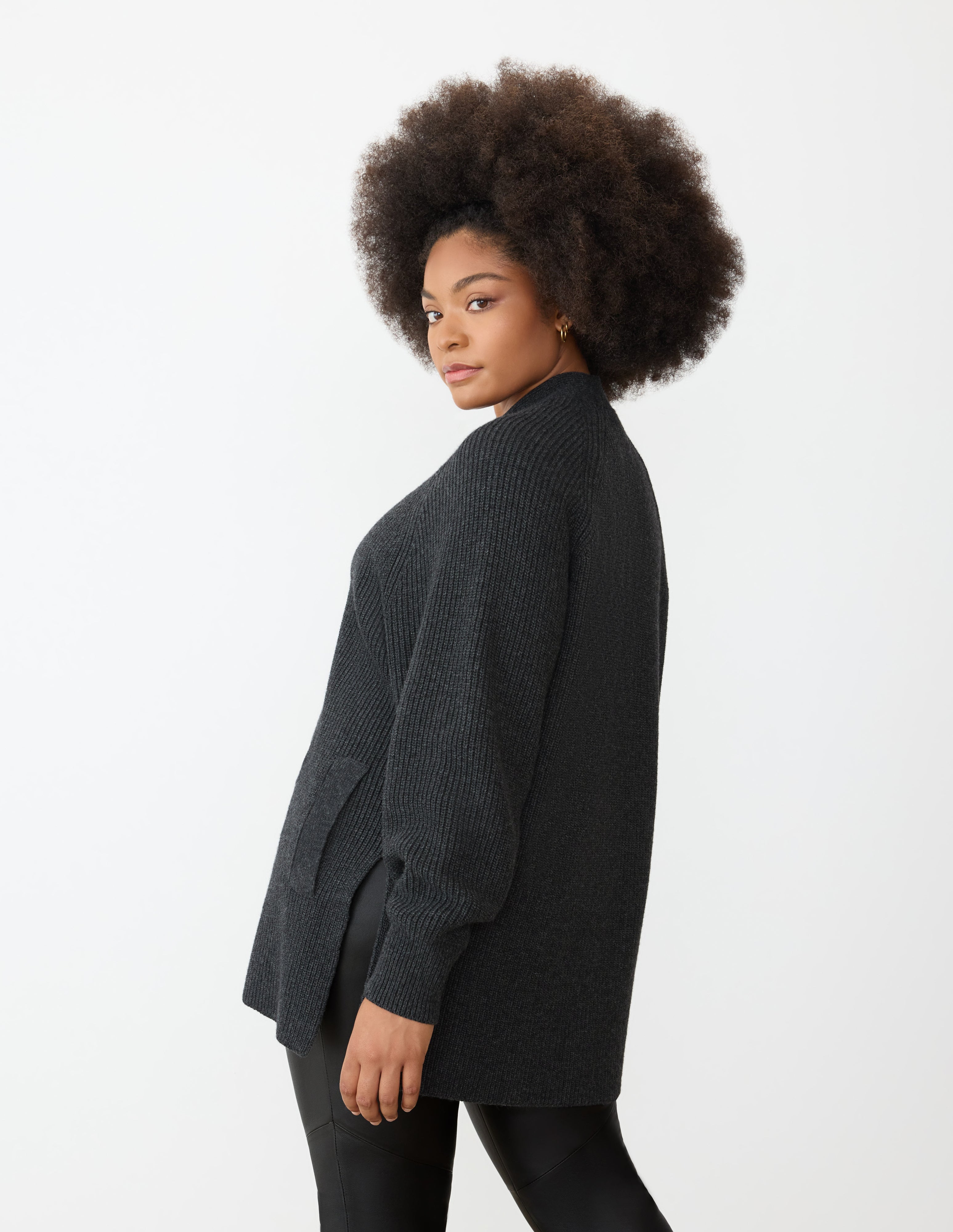 This oversized sweater features a convenient snap front closure, two side pockets, and an extra-long length design.