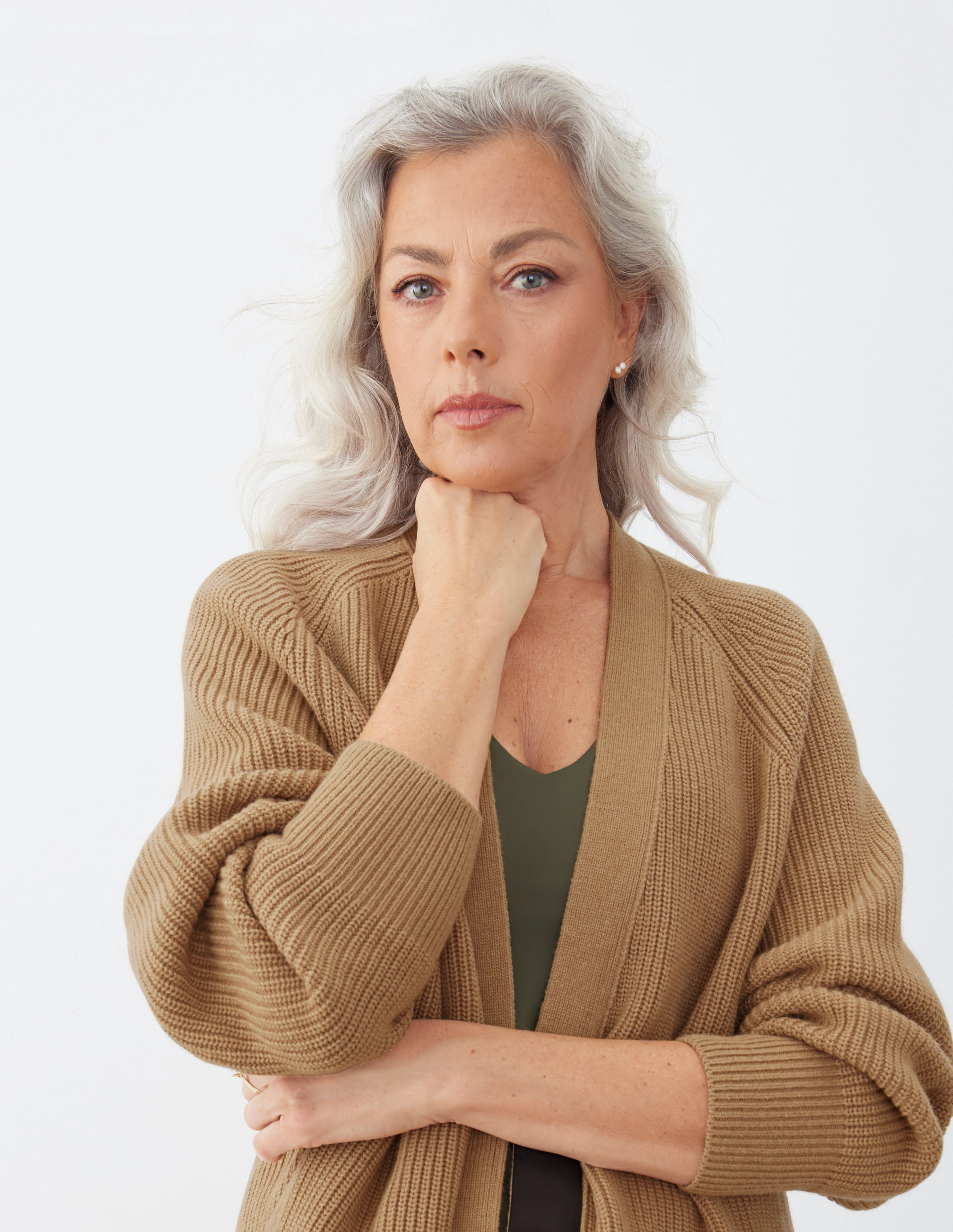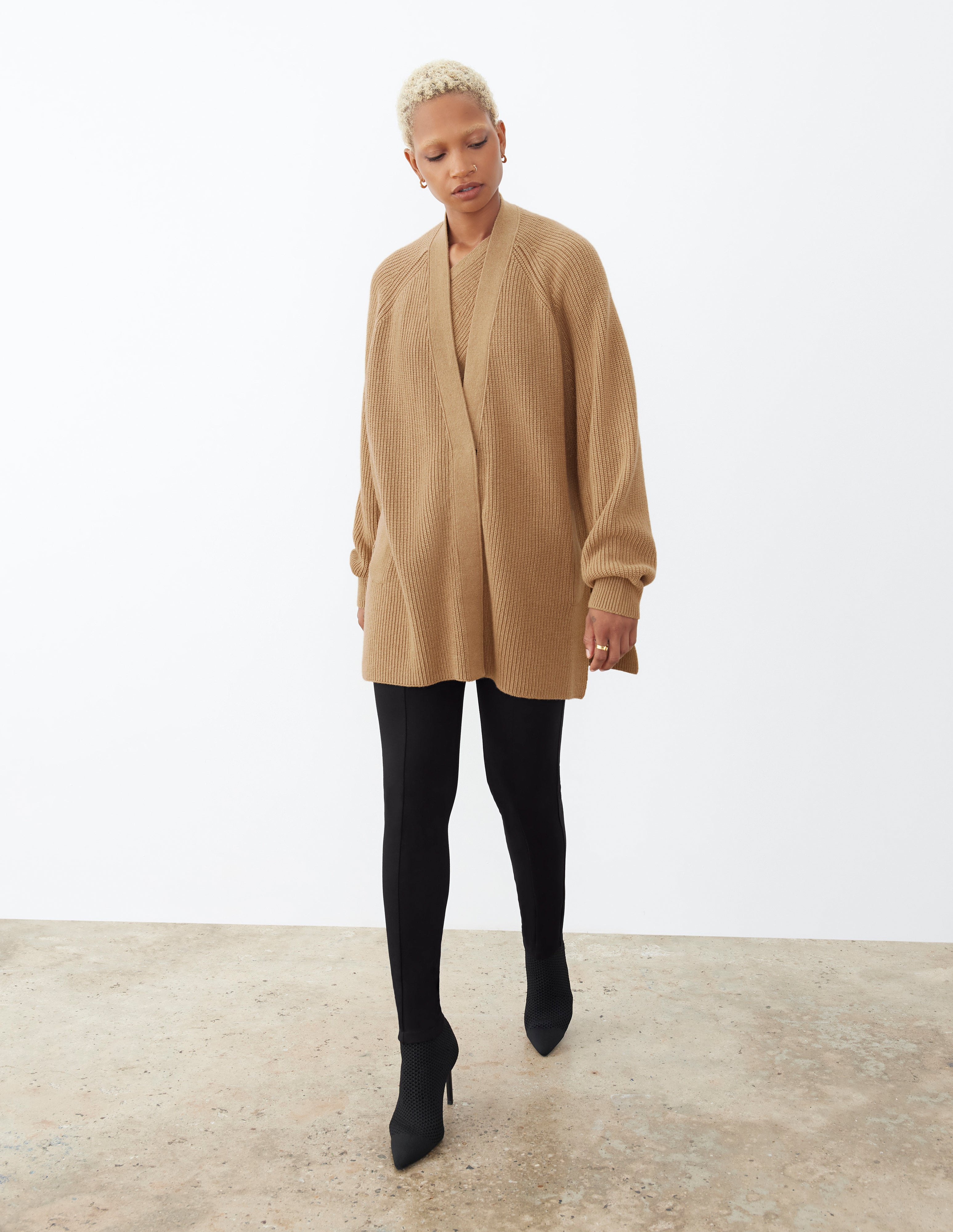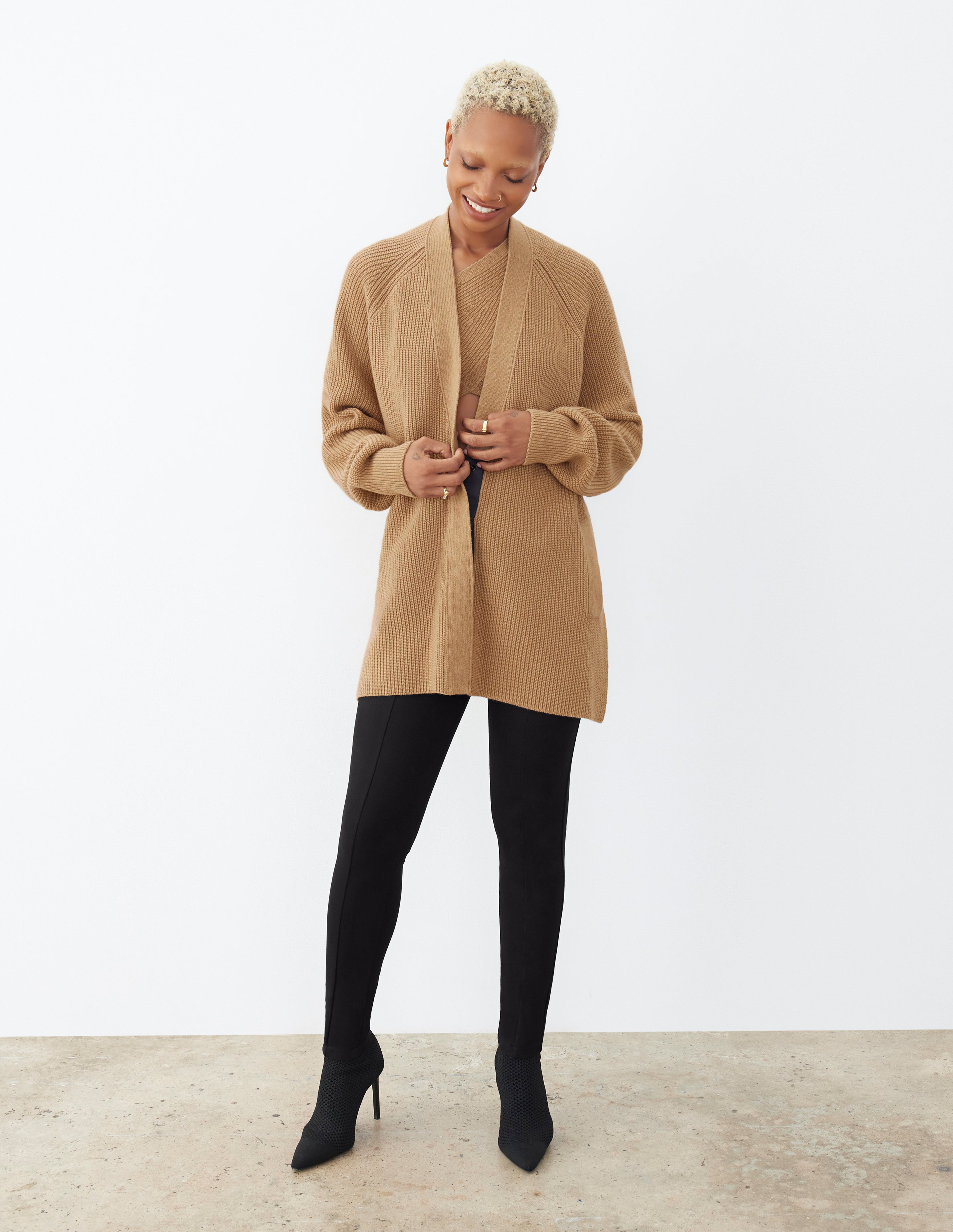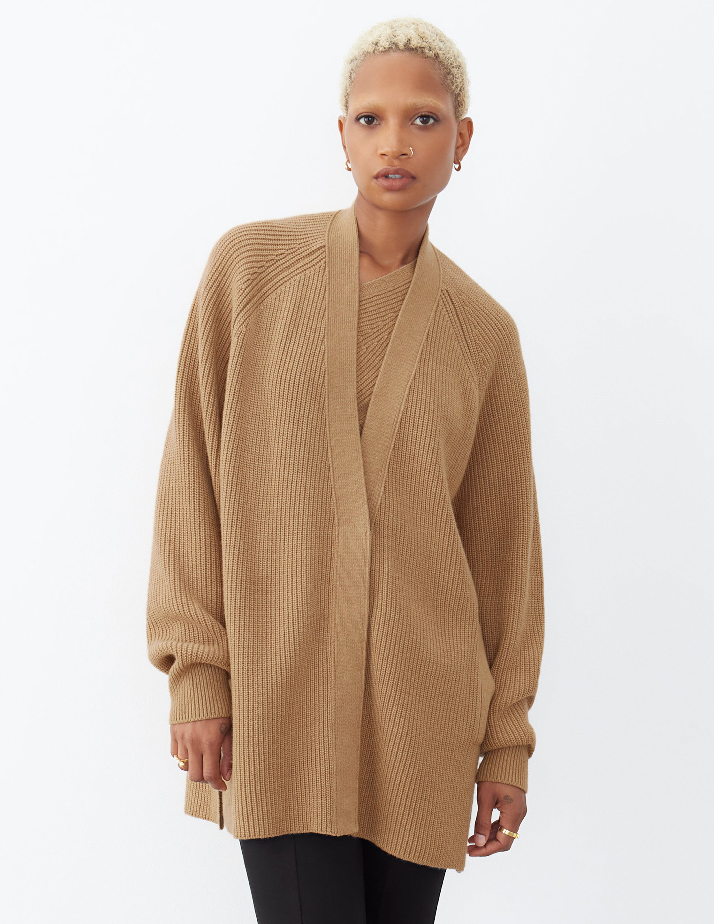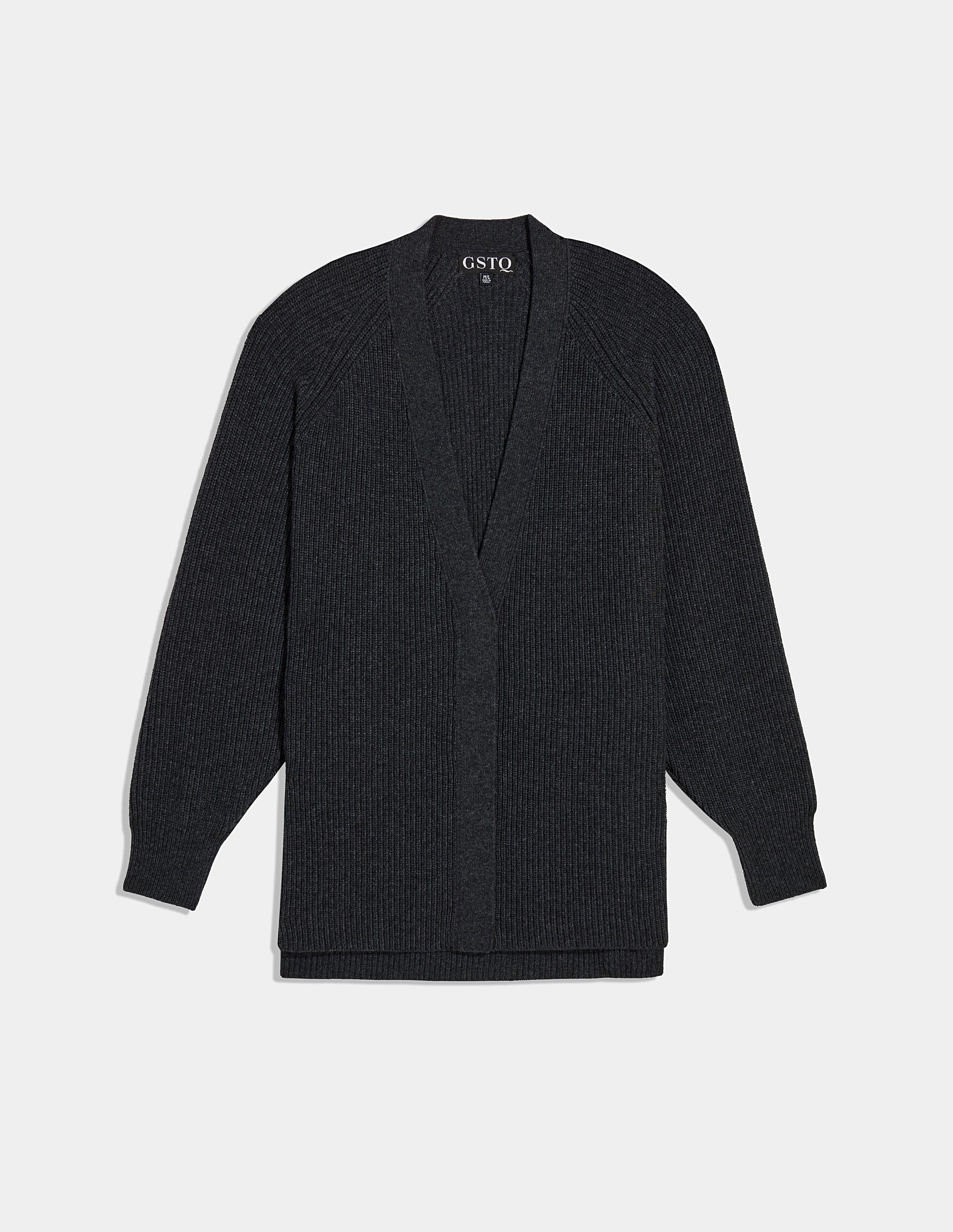 This oversized sweater features a convenient snap front closure, two side pockets, and an extra-long length design.