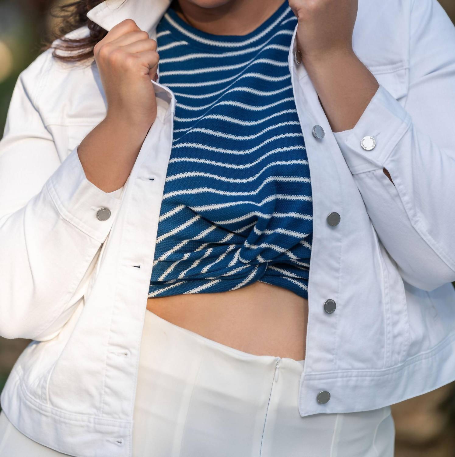 Look no further, you just found your perfect tee! The Zola Crew Neck Short Sleeve Top by TANYA TAYLOR is a stylish piece for your summer wardrobe, offered in a striking Medium Oxford Blue with a stripe pattern. Made from 100% Cotton, this plus-size tee promises both comfort and style. Designed with a crew neckline and a pull-on closure, it features a flattering twist at the waist for a fun upgrade. Care for this women’s top is simple: machine wash and tumble dry.