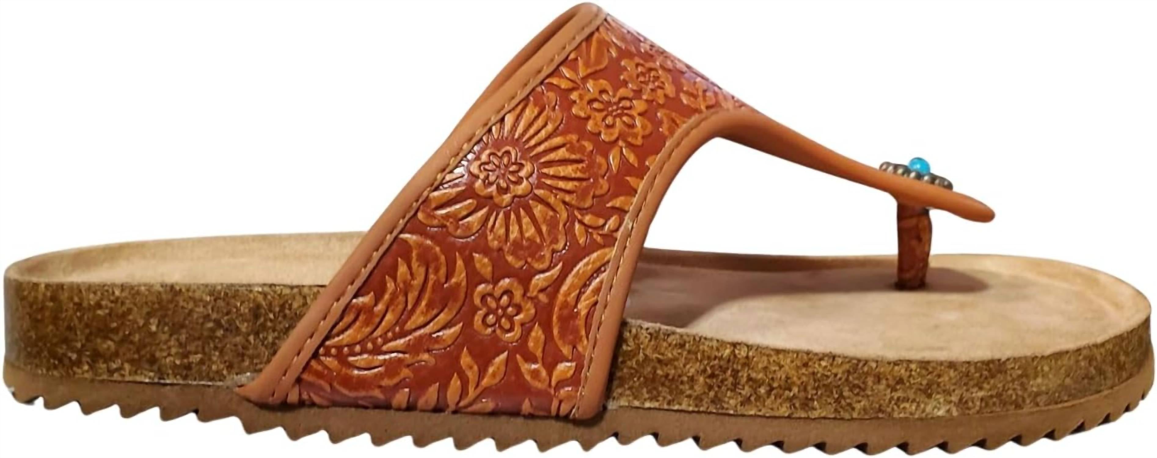 Classicly cute and all-day-wearable. We love this sandal. Step into summer with style in the Women's Danni Sandal by Very G, designed in a striking rust faux leather with boho chic flair. The open toe and flat heel make it a comfortable choice for sunny vacations, while the contoured footbed ensures a secure fit. Crafted with man-made materials, this medium shoe width sandal effortlessly combines a casual vibe with comfort. Perfect for your western wardrobe, it features a unique faux turquoise stone concho, embodying the season's hottest trends.