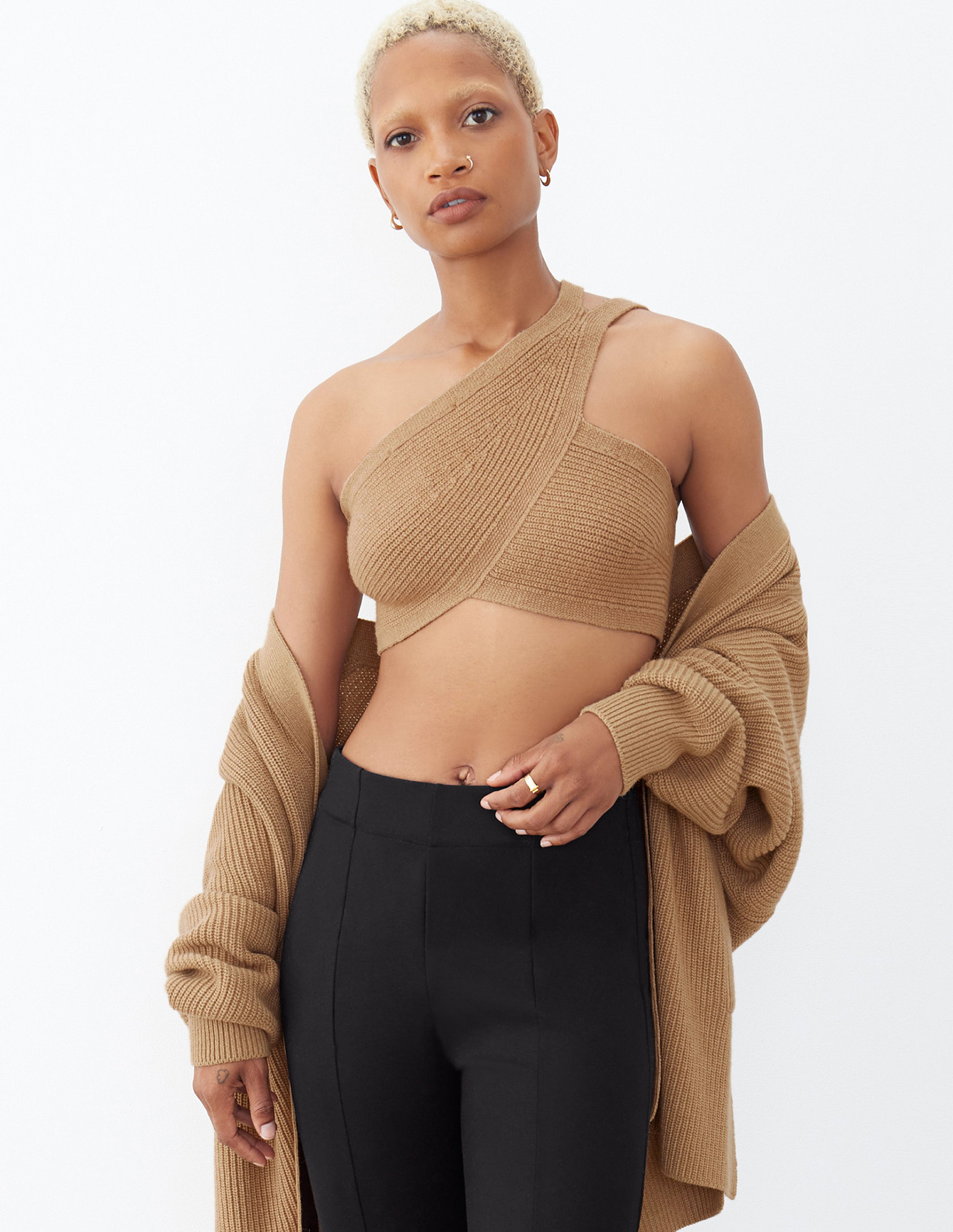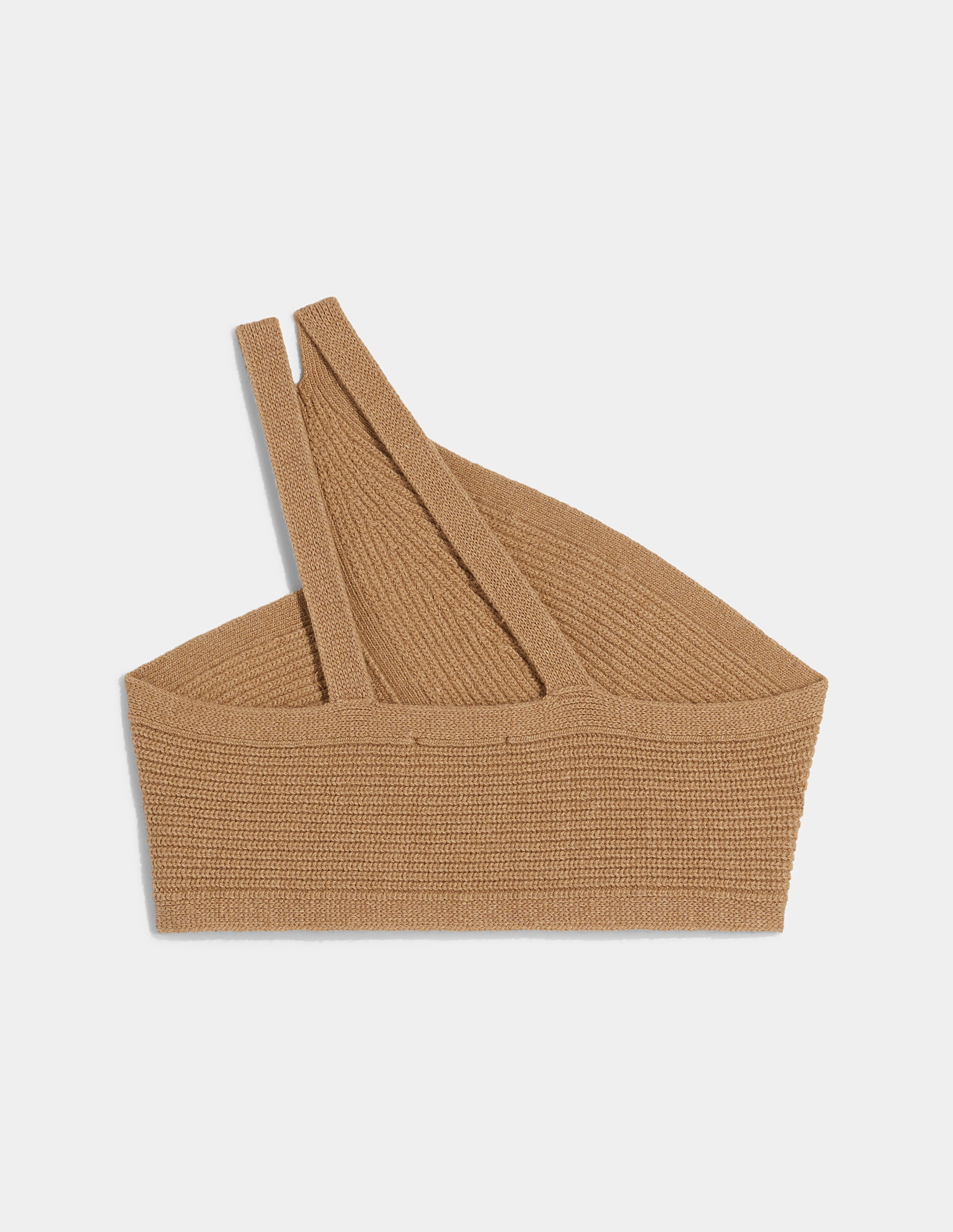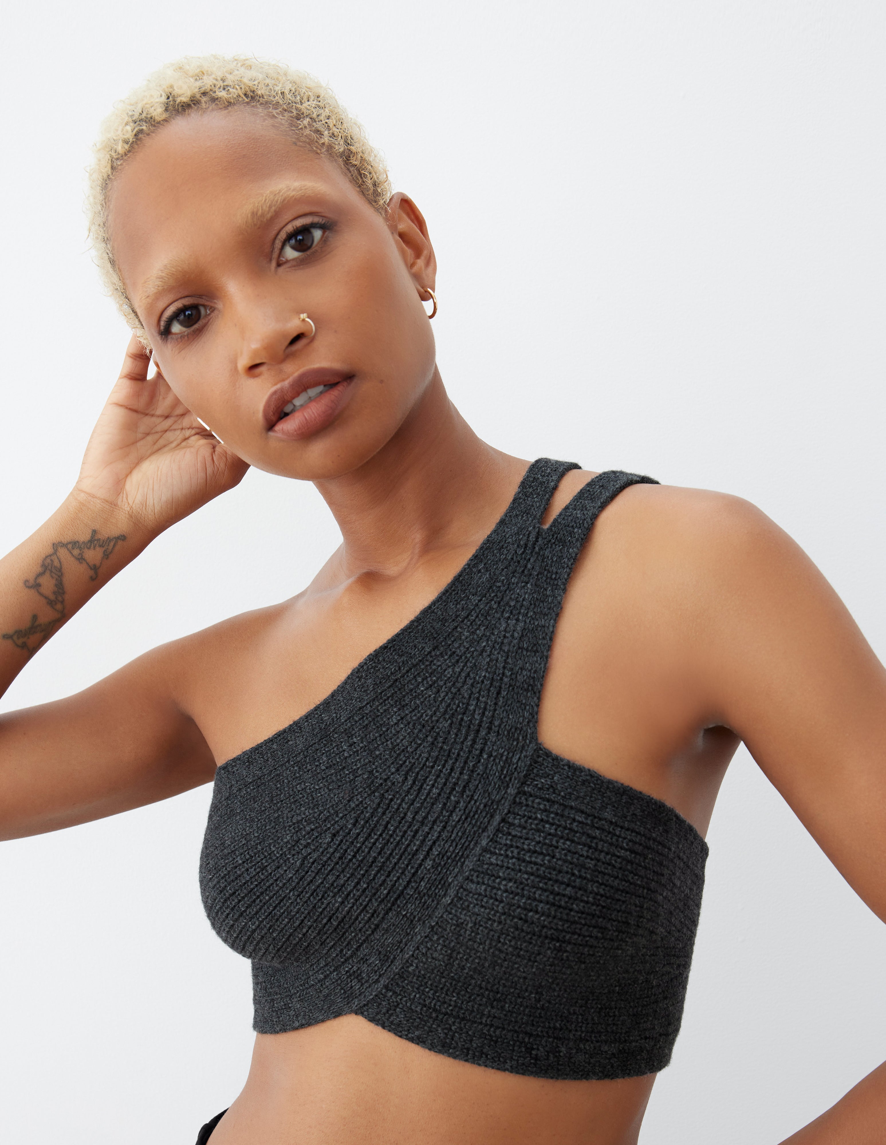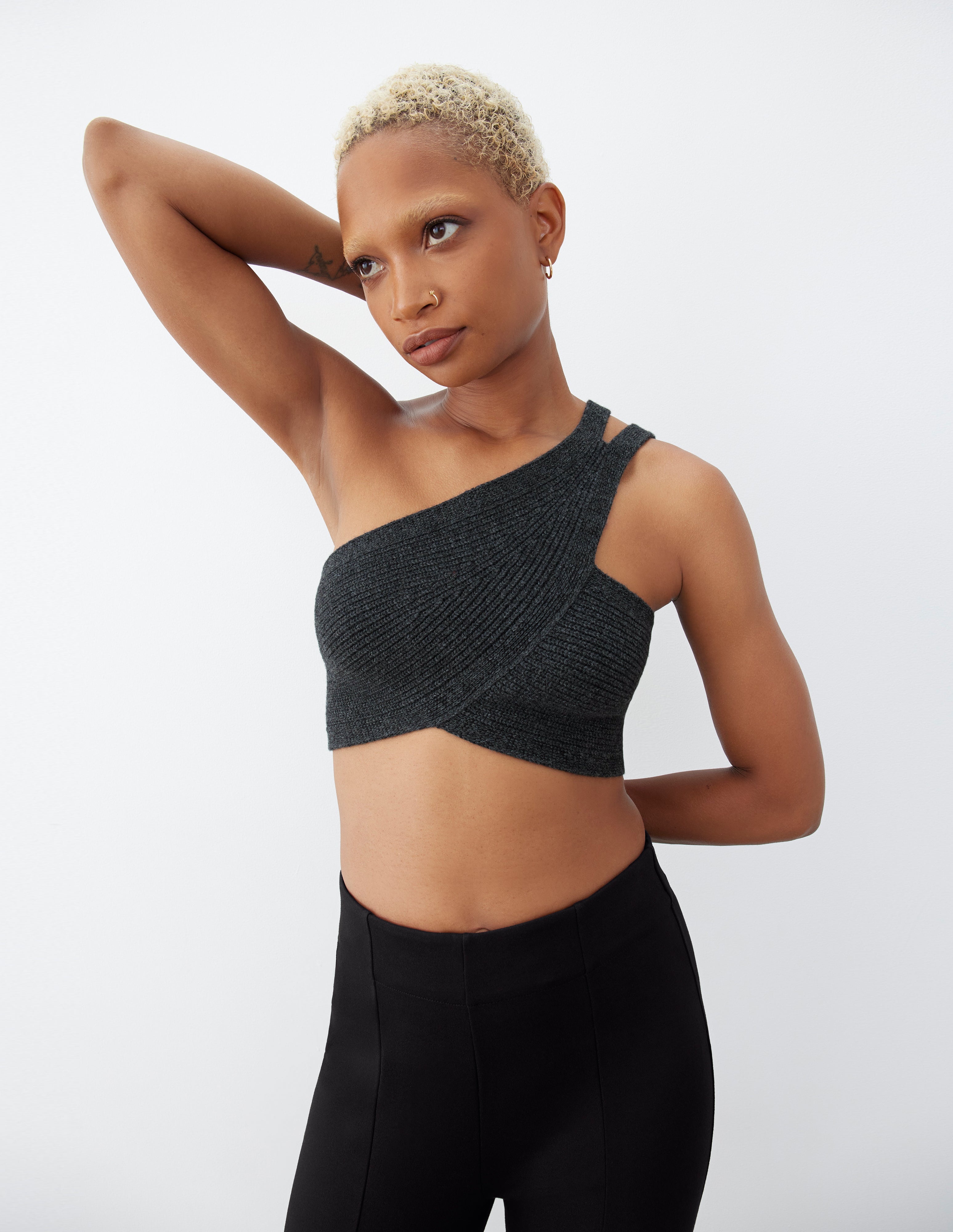 Bandeau coverage with an asymmetric strap make this rib knit bralette sweater a stylish layer or solo piece.